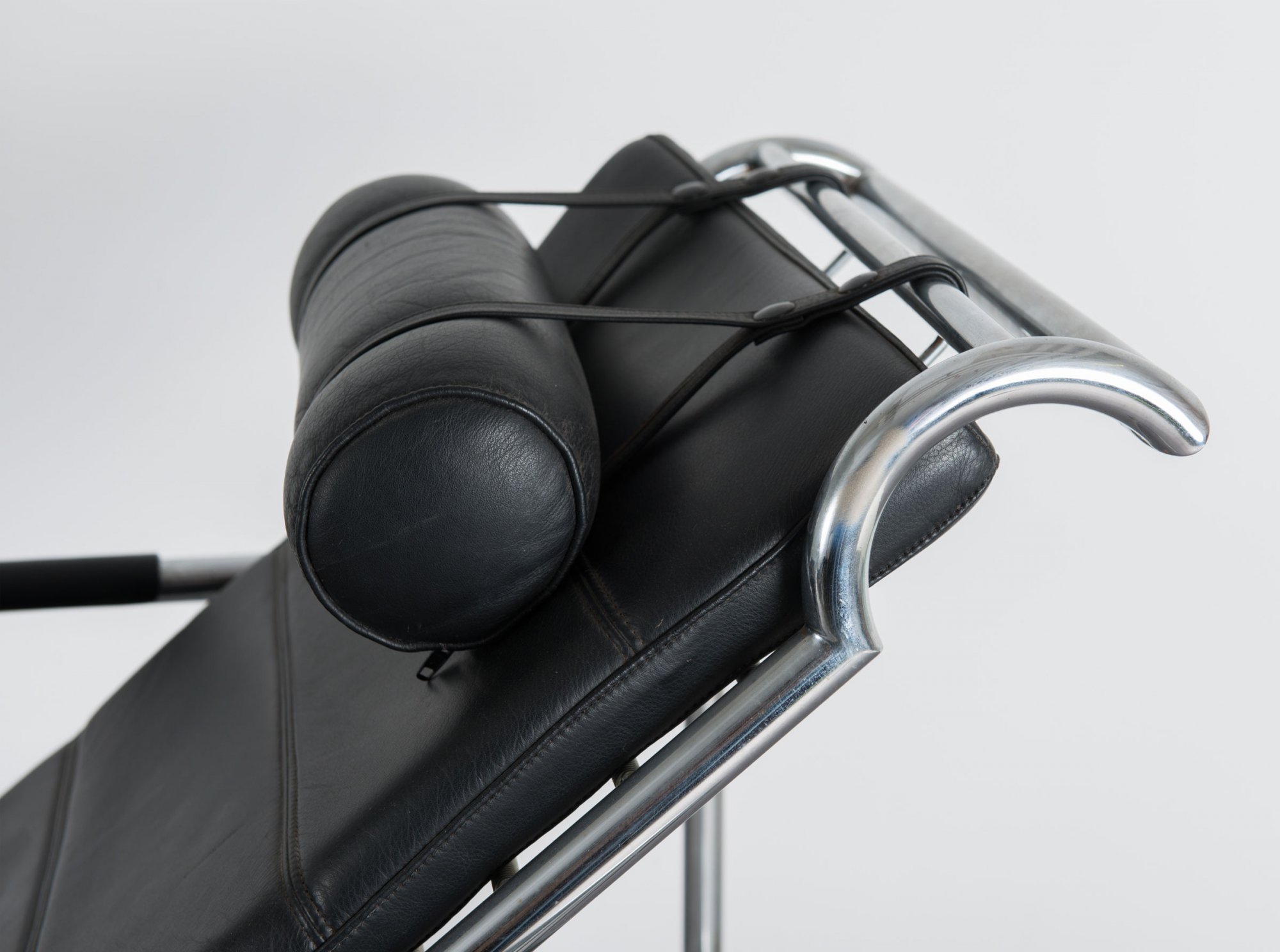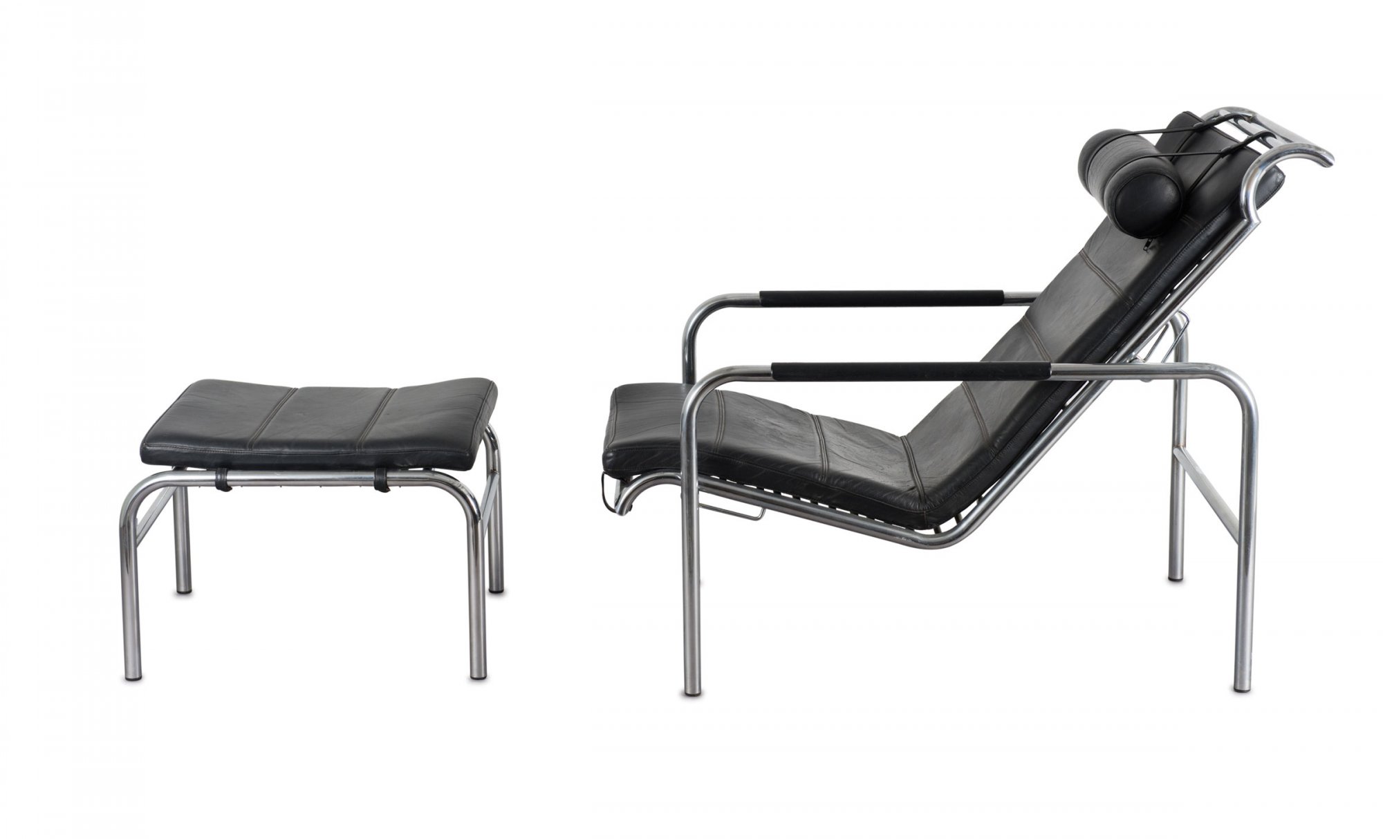 Gabriele Mucchi. 'Genni' easy chair with ottoman, 1935. H. 76 x 58 x 118 cm; ottoman: H. 35.5 x 54 x 45 cm. Made by Zanotta, Nova Milanese. Chrome-plated tubular steel, black leather. Marked: Maker's decal.
