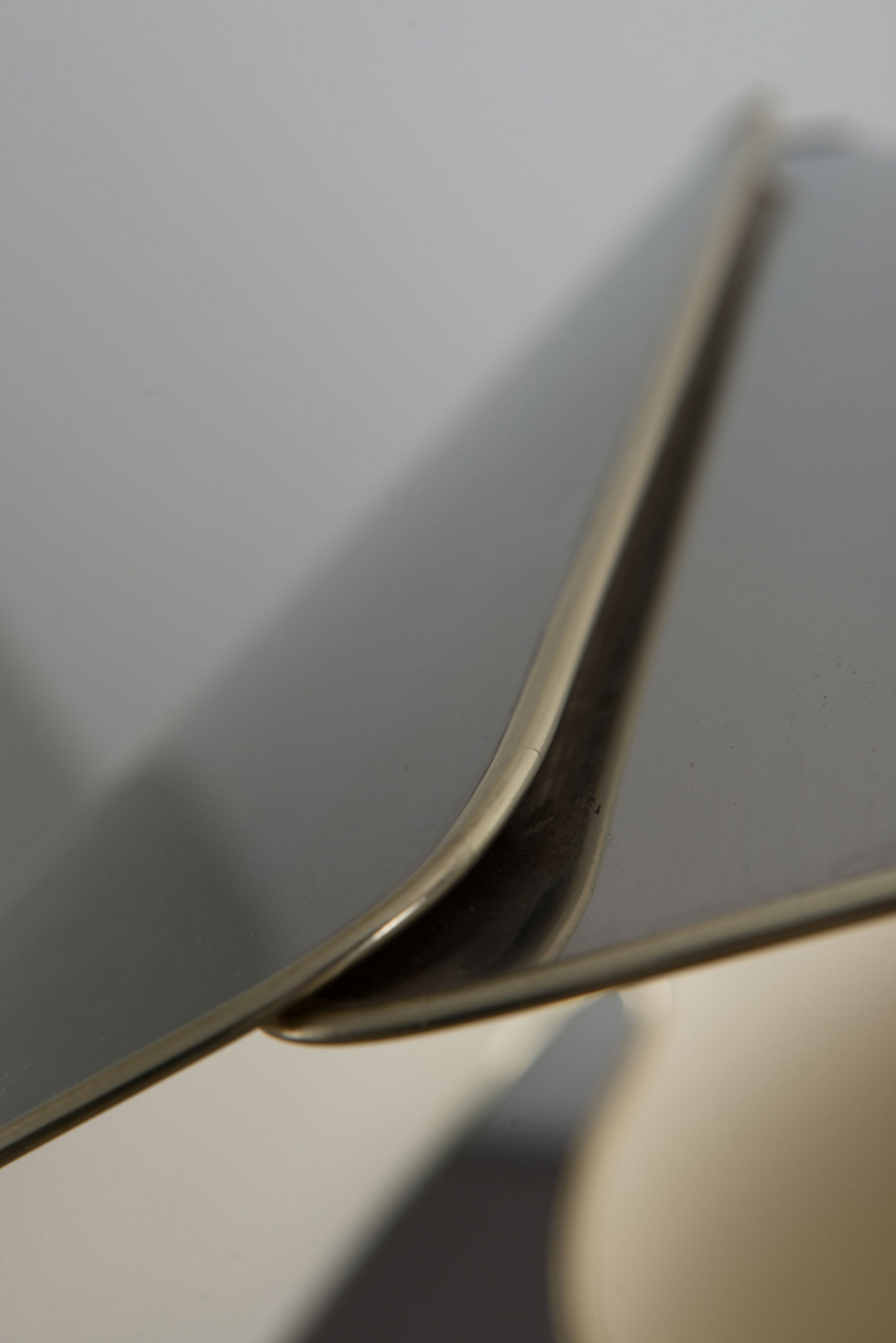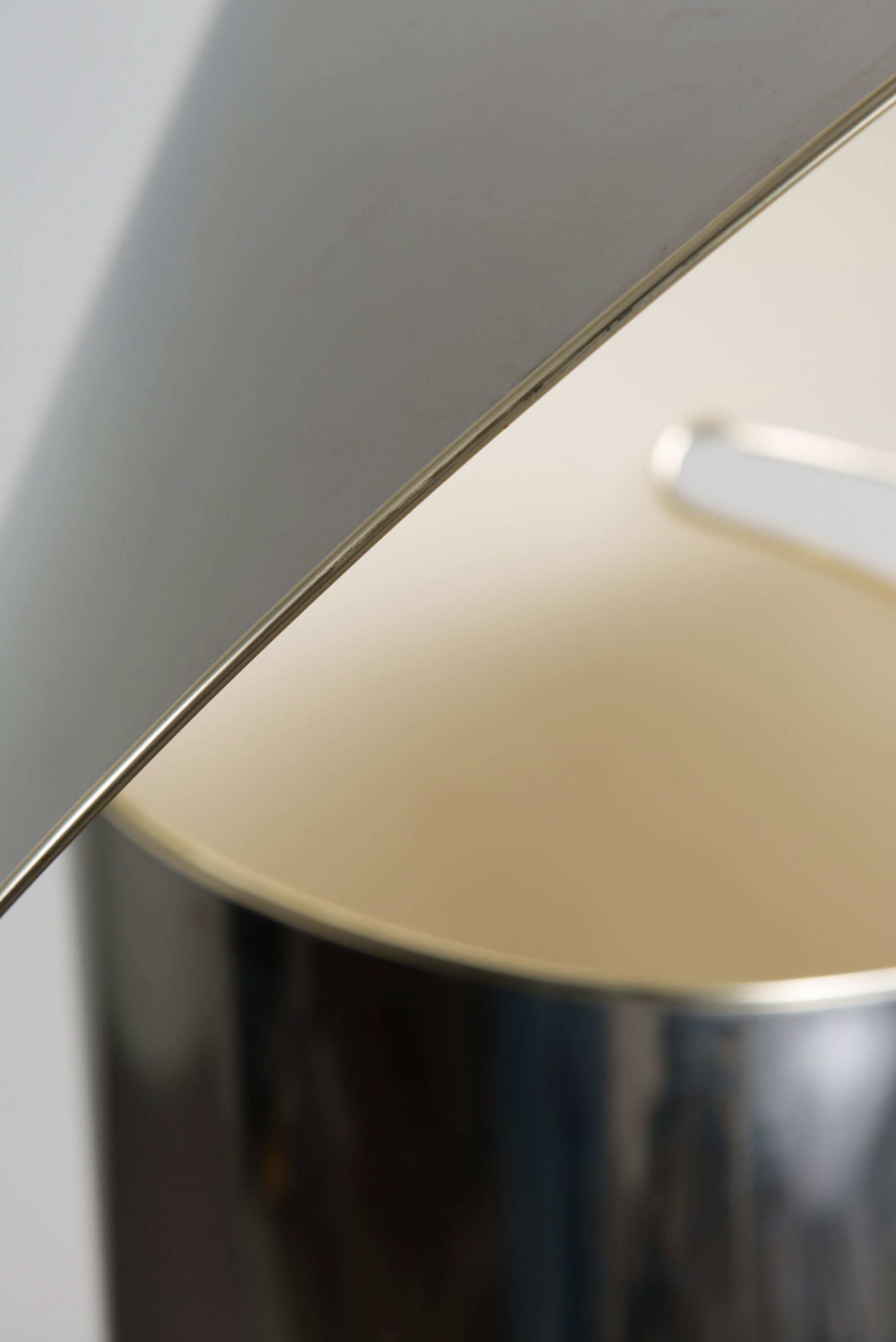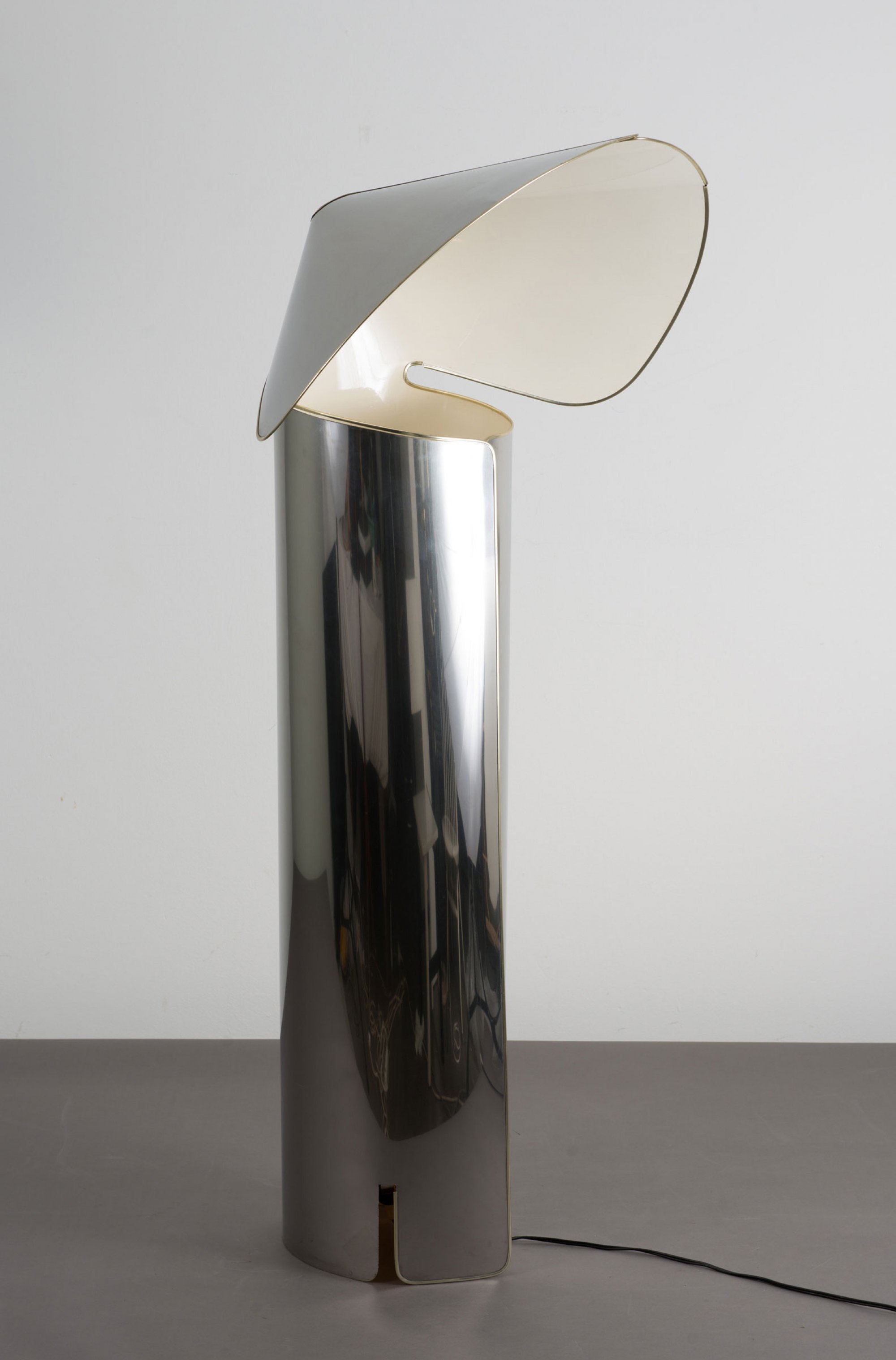Mario Bellini. 'Chiara' floor light, 1967. H. 143 x 70 x 49 cm. Made by Flos, Brescia. Sheet metal, chrome-plated and painted white. Marked: Maker's decal.
