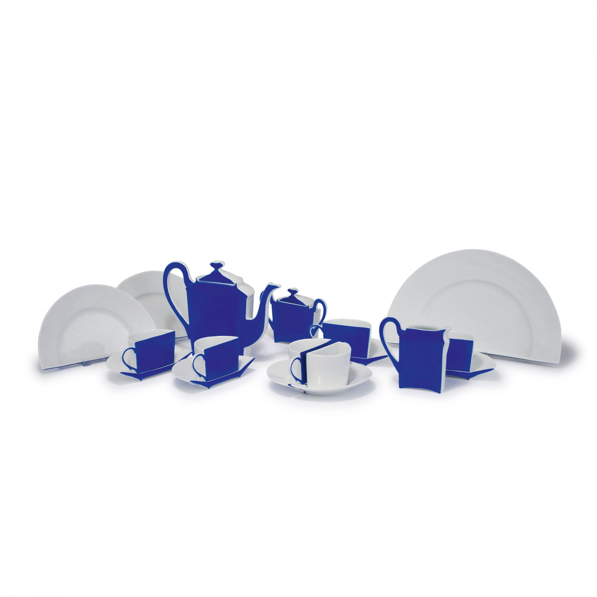 Arman. 'Demie Tasse' coffee set, 1990. 21 pieces. Coffeepot: H. 17 cm; creamer: H. 11.5 cm; sugar bowl: H. 10.7 cm; 6 cups and saucers: H. 5.9 cm; 6 cake plates: 22 x 12.5 cm; 6 plates: 31 x 17.5 cm. Made by Royal Limoges for Artes Magnus. Porcelain, white, glazed, blue overglaze. Marked: