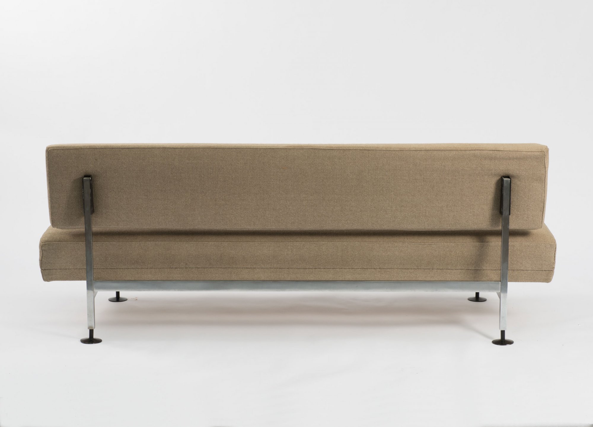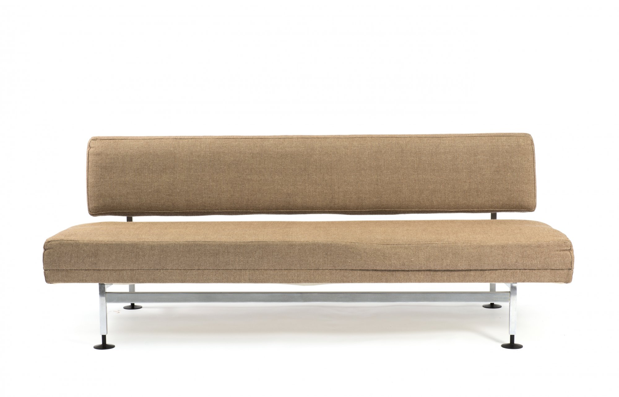 Egon Eiermann. Sofa/daybed for the German Bundestag, 1968/ 69. H. 74 x 195 x 75 cm. Made by Honeta, in 1968/ 69. Chrome-plated rectangular steel, beige-brown fabric.