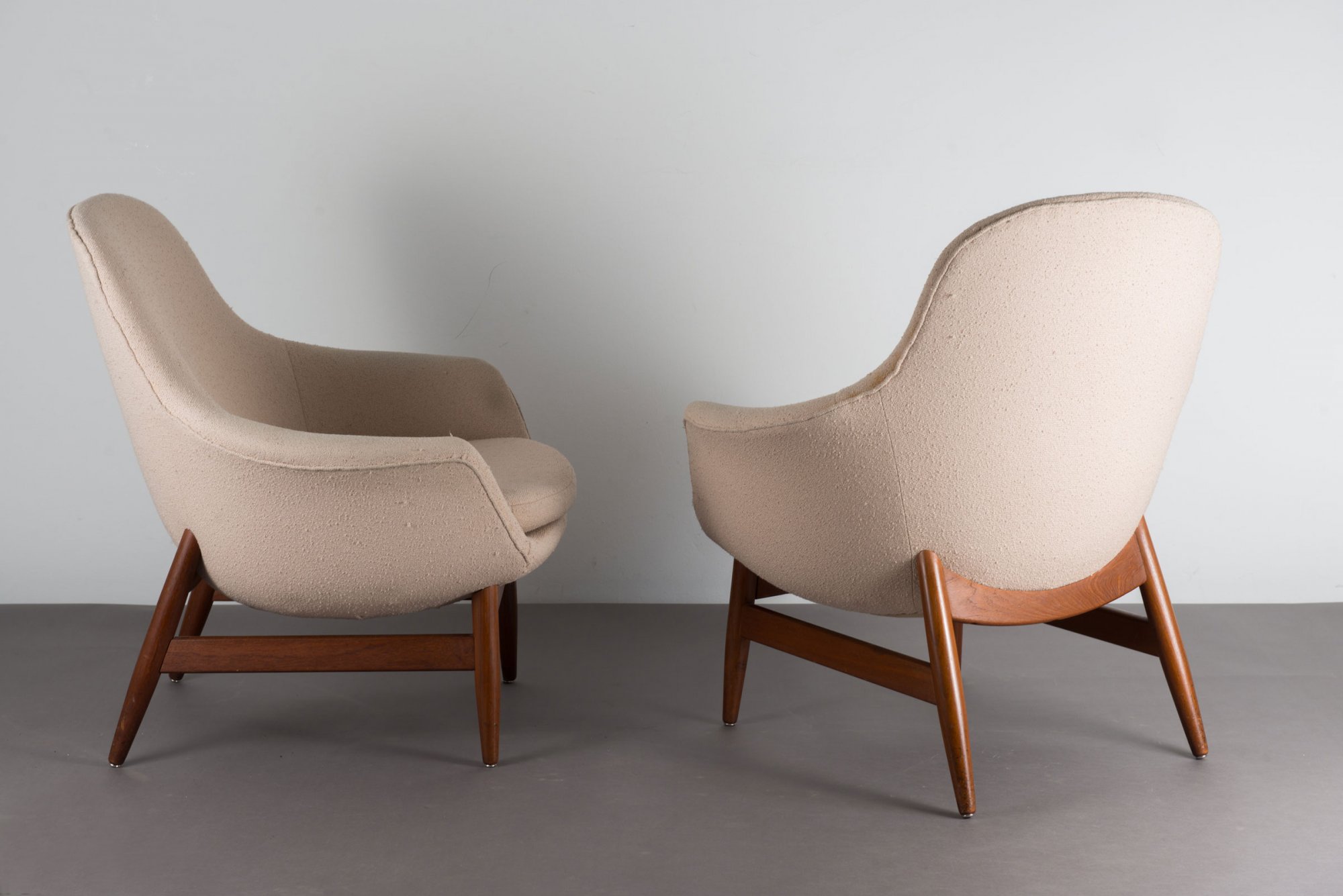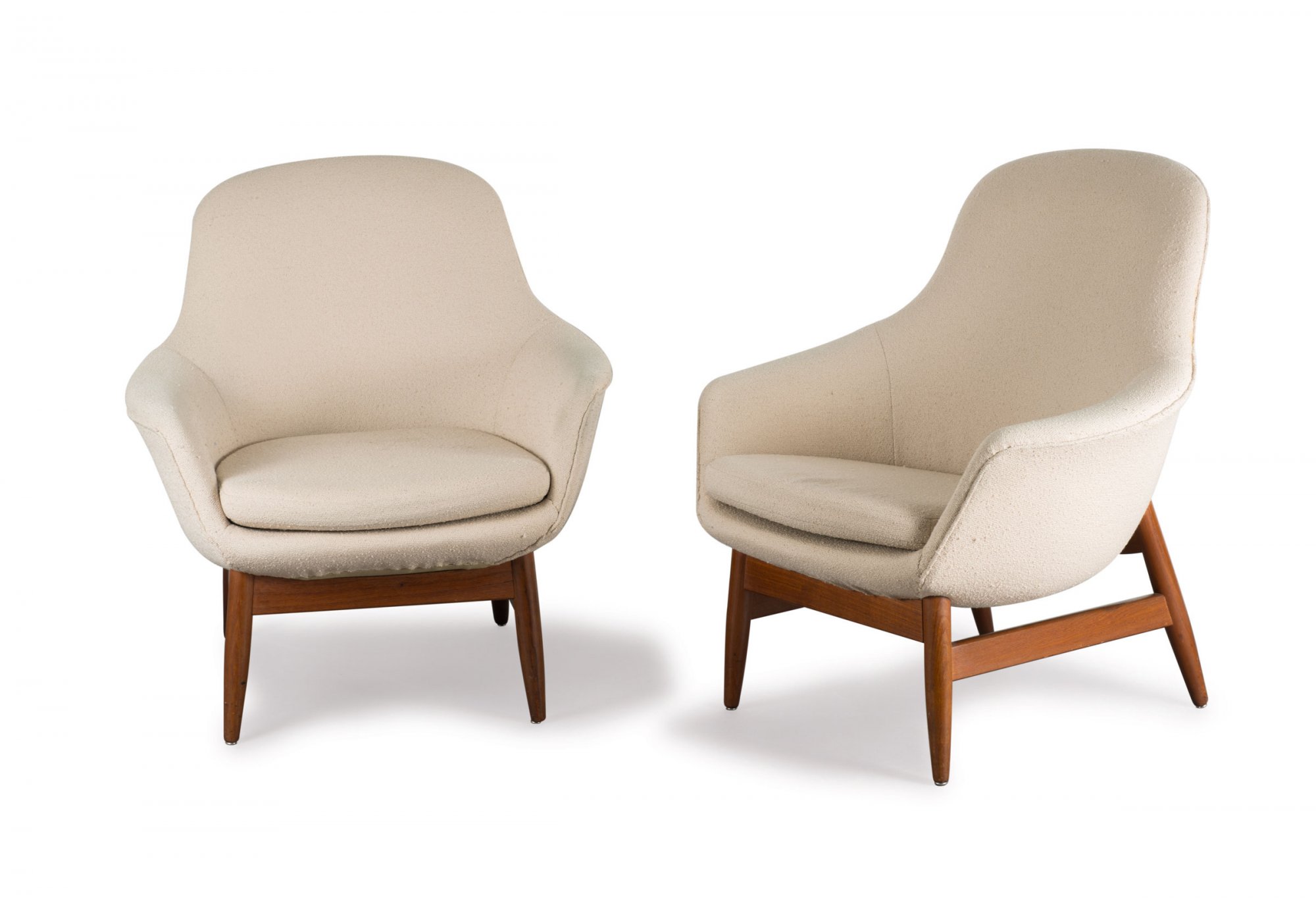 Hans Olsen. Two armchairs, 1950s. H. 82 x 76 x 77 cm. Made by Viskadalens Möbelindustri, Kinna, Sweden. Teak, crème-white fabric. Marked: Maker's and designer's data.