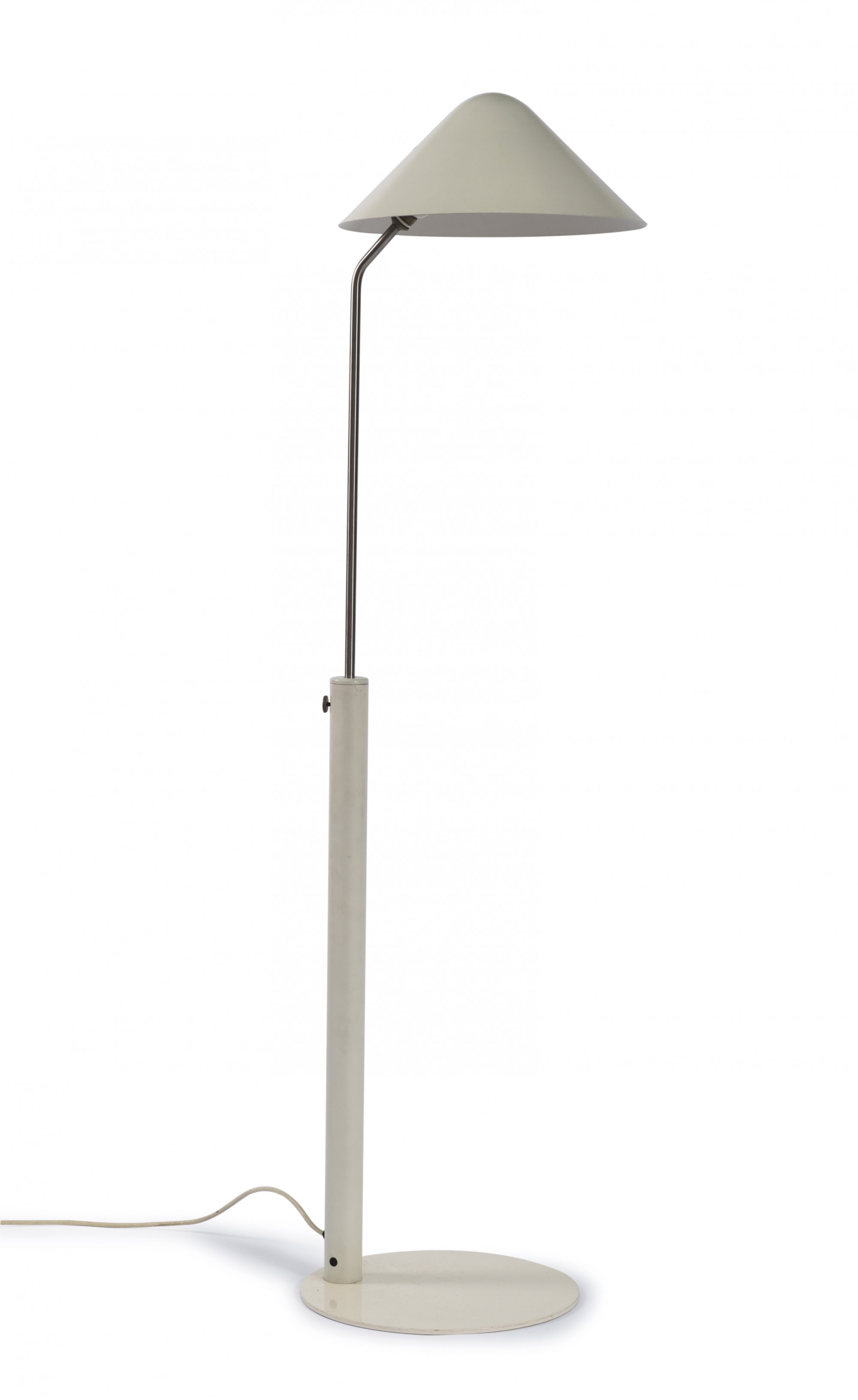 Jørgen Gammelgard. Floor VIP' floor light, c1982. H. 139.5 cm, D. 35 cm. Made by Pandul, Hellerup. Tubular steel, sheet steel, chrome-plated, part white.