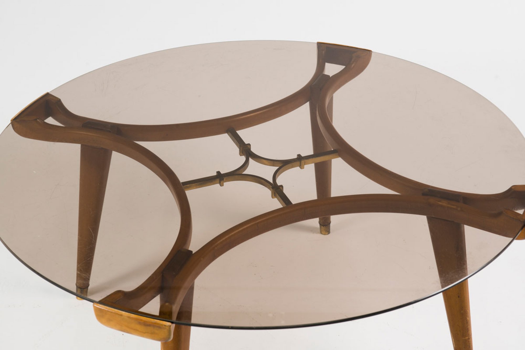 The Netherlands. Coffee table, c1952. H. 47.5 cm, D. 100 cm. Beech, cherry wood, brass, tinted glass top.