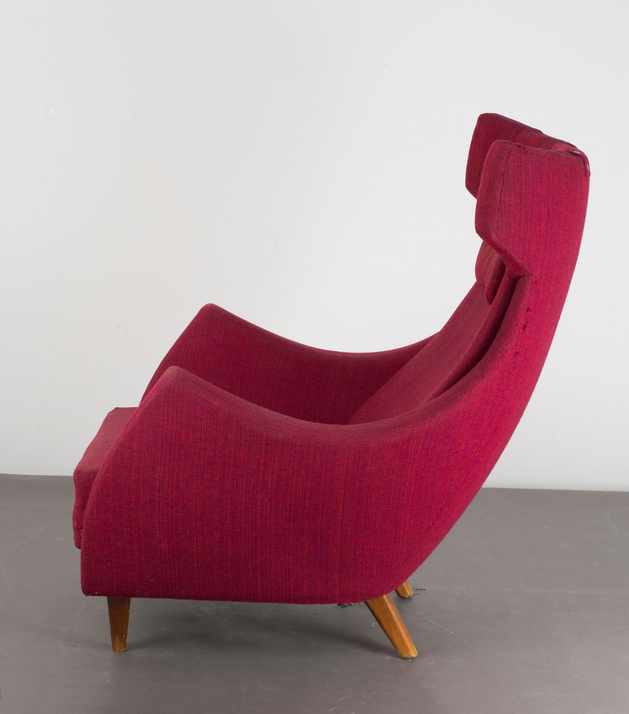Scandinavia. Easy chair, 1950s. H. 102 x 73 x 97 cm. Beech, stained dark, red/blue marbled fabric.