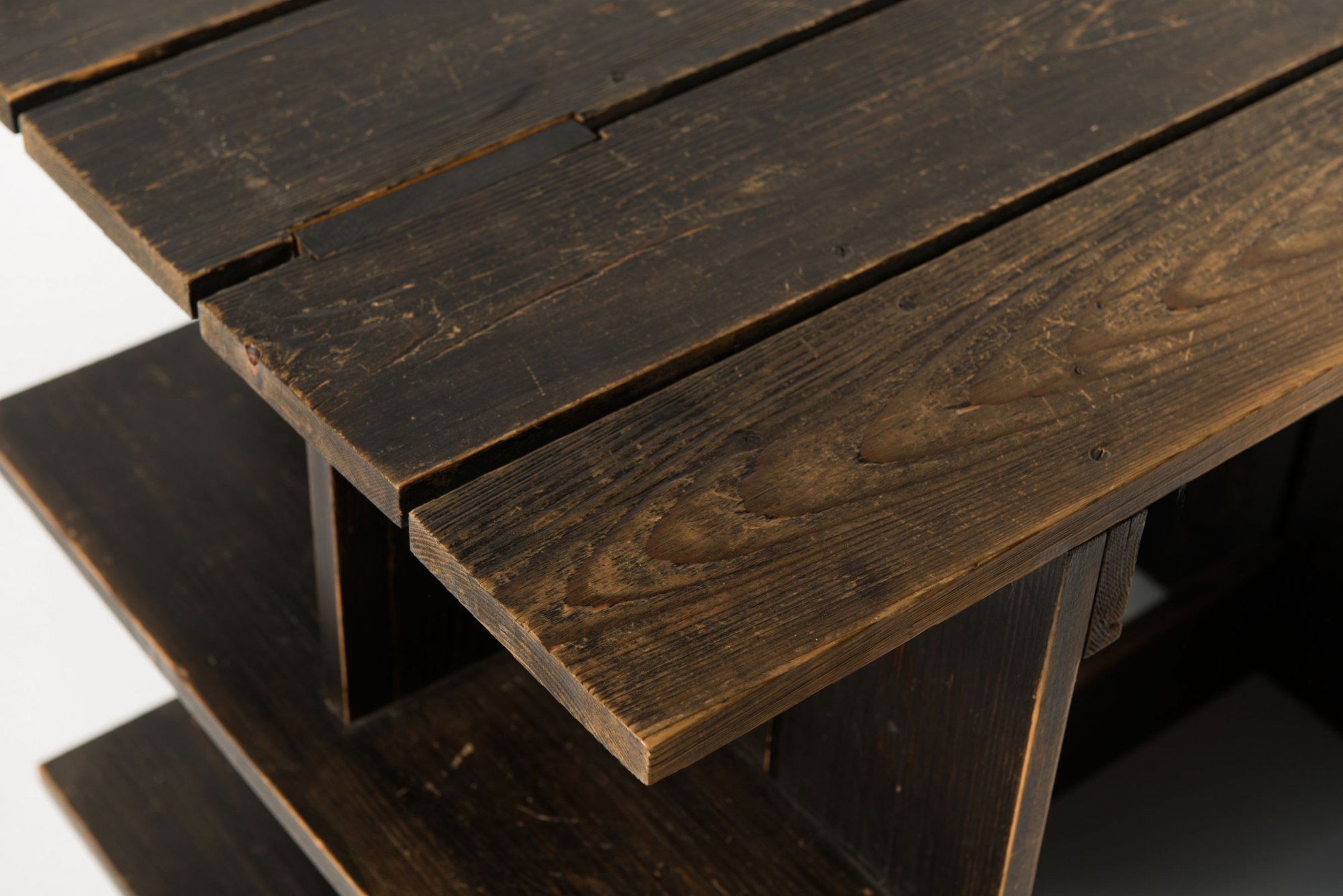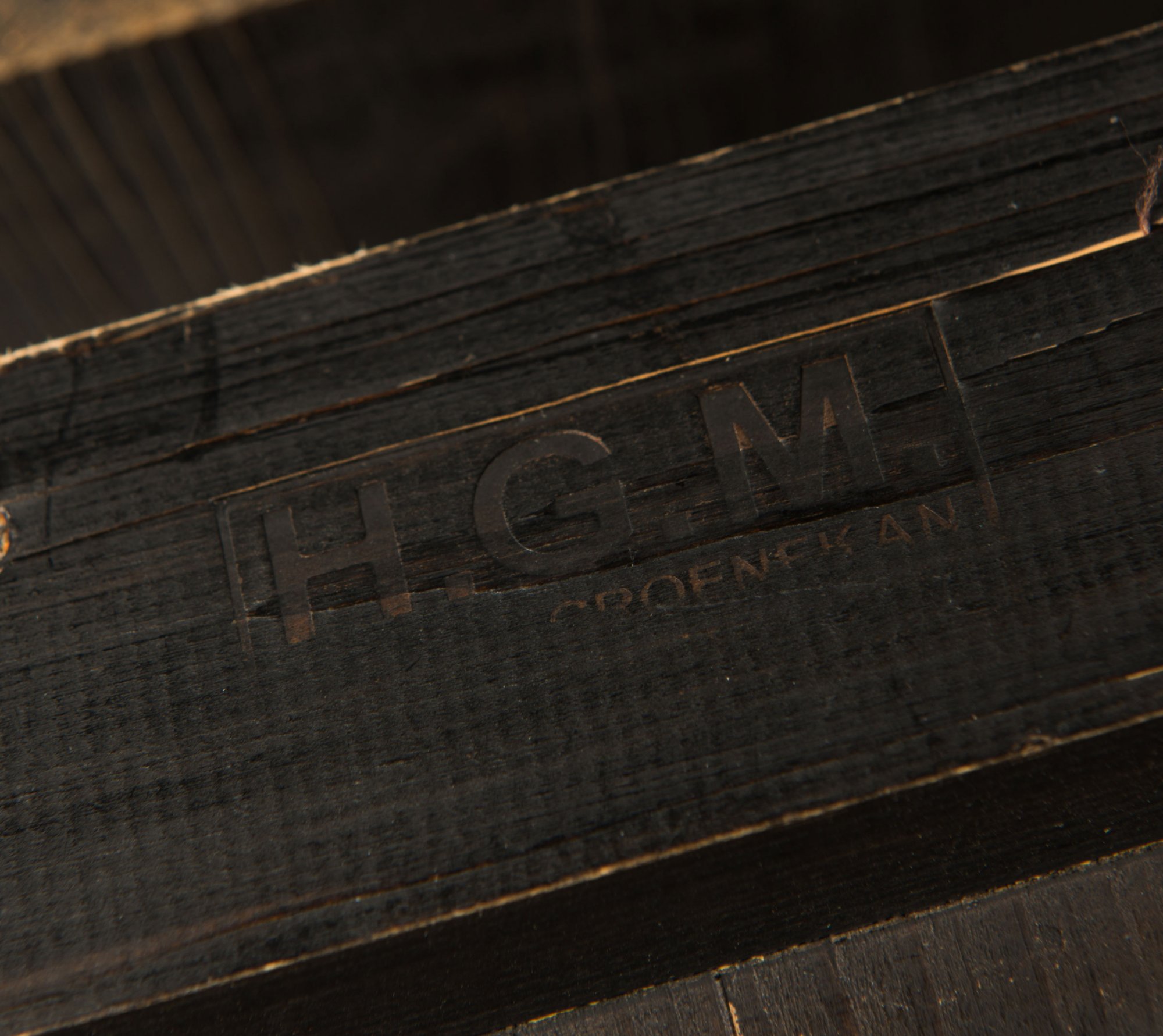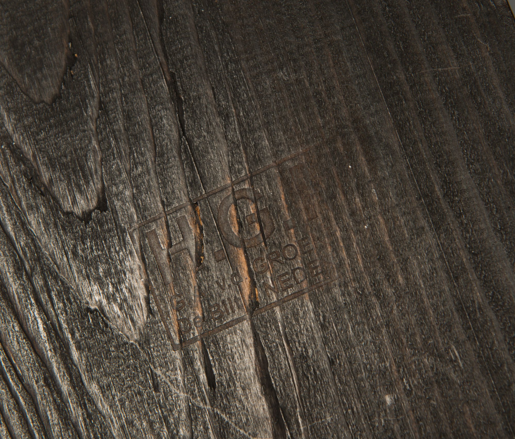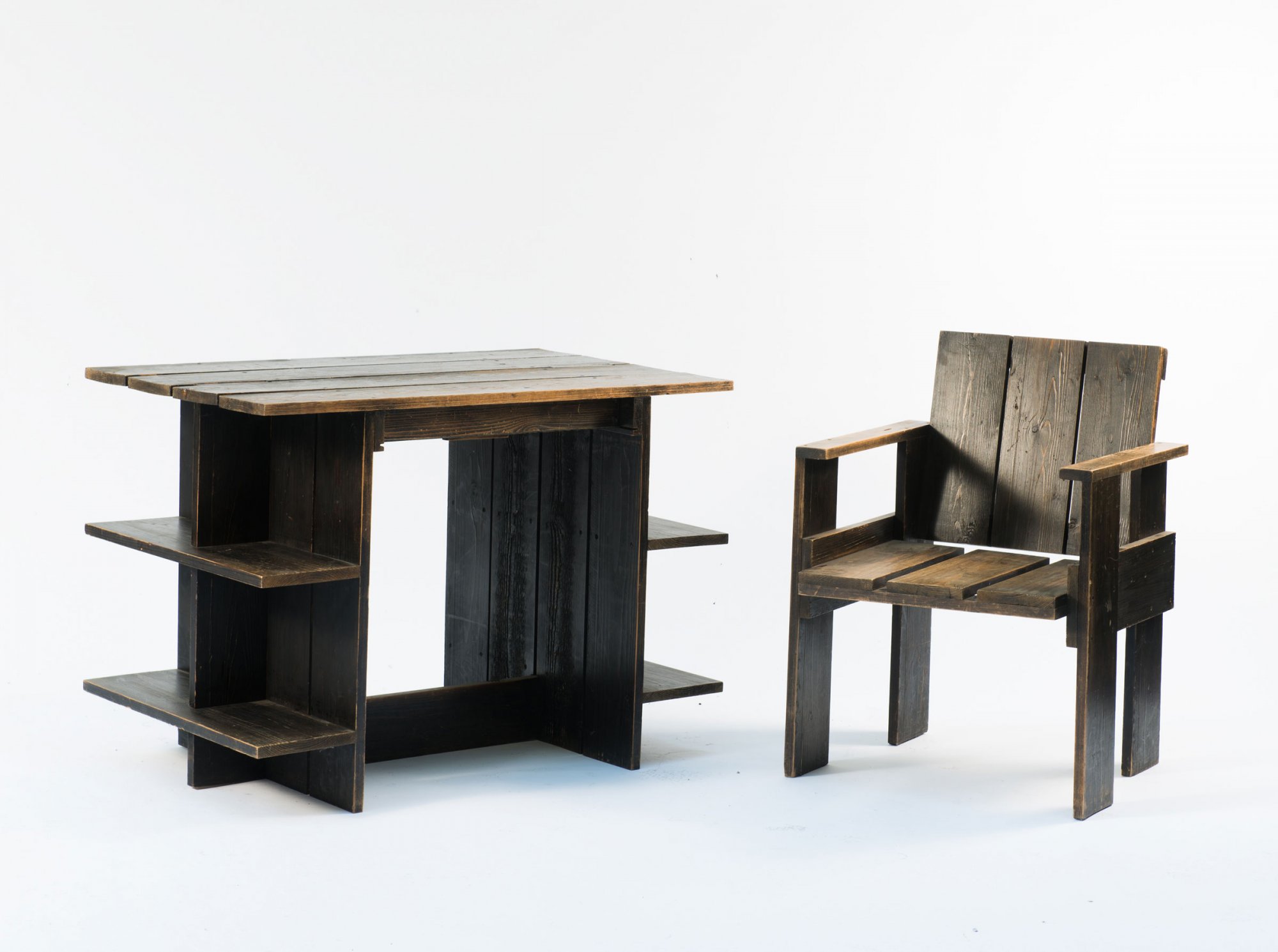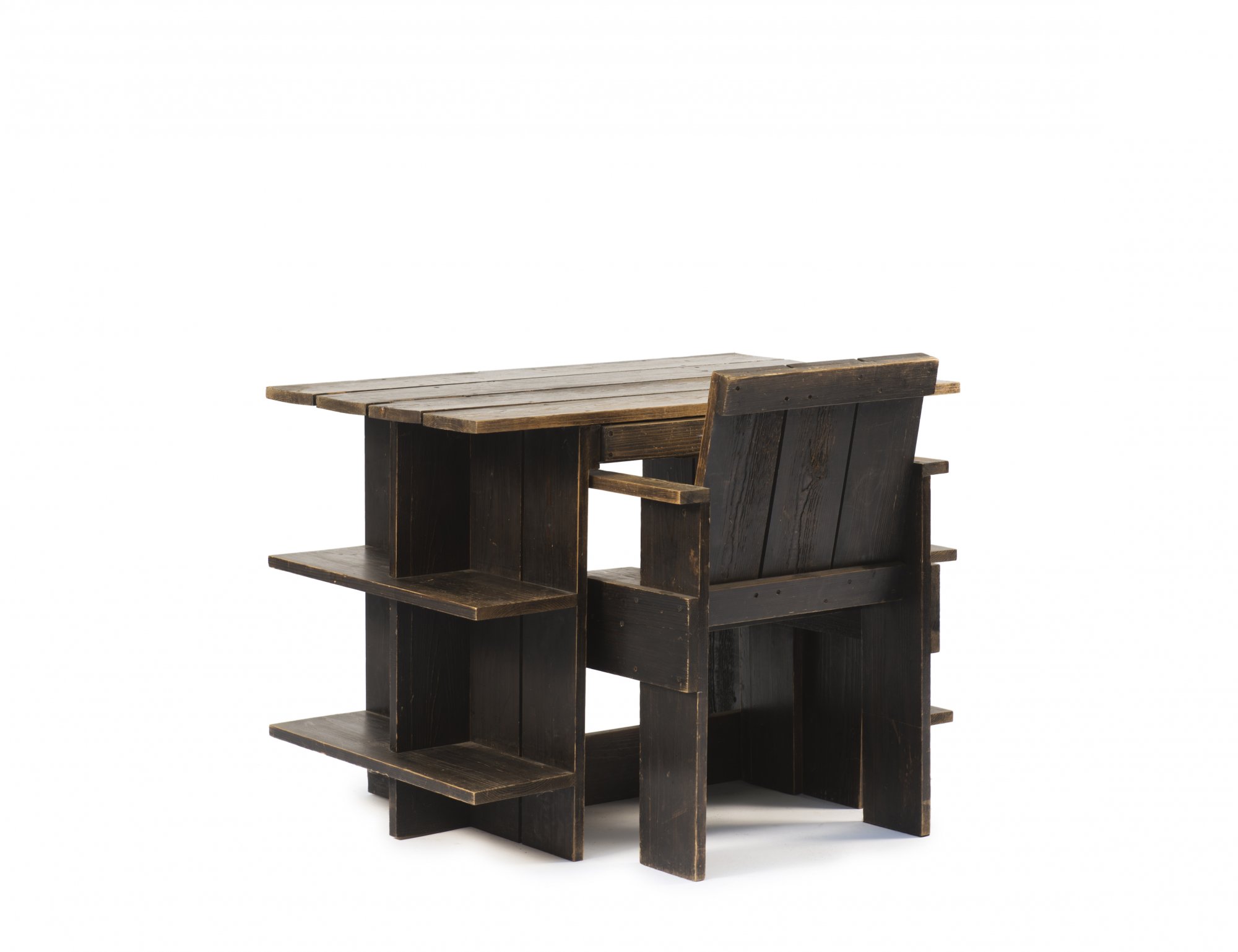 Gerrit Rietveld. 'Crate desk' and 'Crate chair', 1934. Table: H. 70 x 100 x 59 cm; chair: H. 77.5 x 55 x 55 cm. Made by G. A. van de Groenekan, De Bilt for Metz & Co., Rotterdam. Pinewood, stained dark. Marked: H. G. M. G.A. v.d. GROENEKAN DE BILT NEDERLAND (branding), chair: the same (faint).