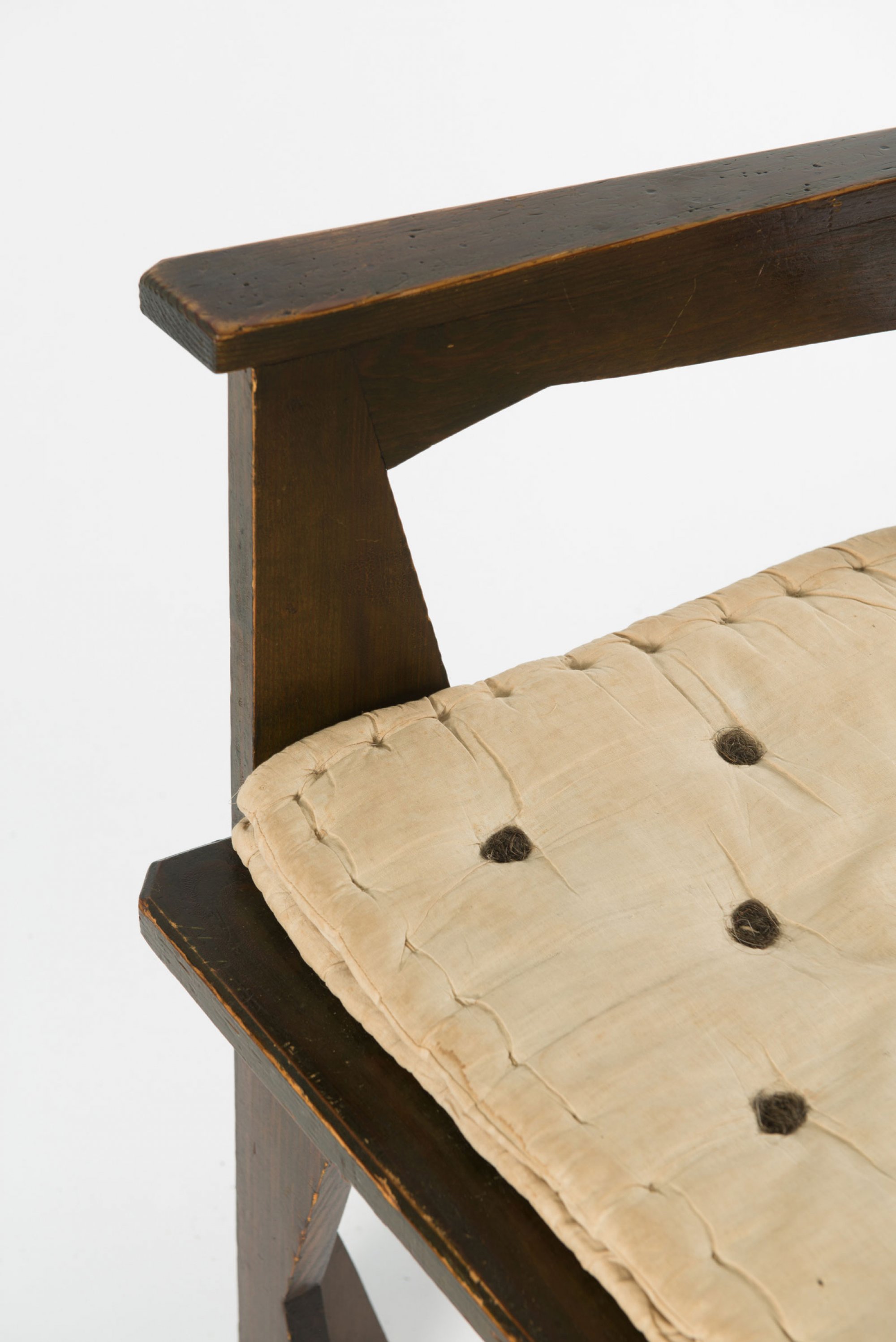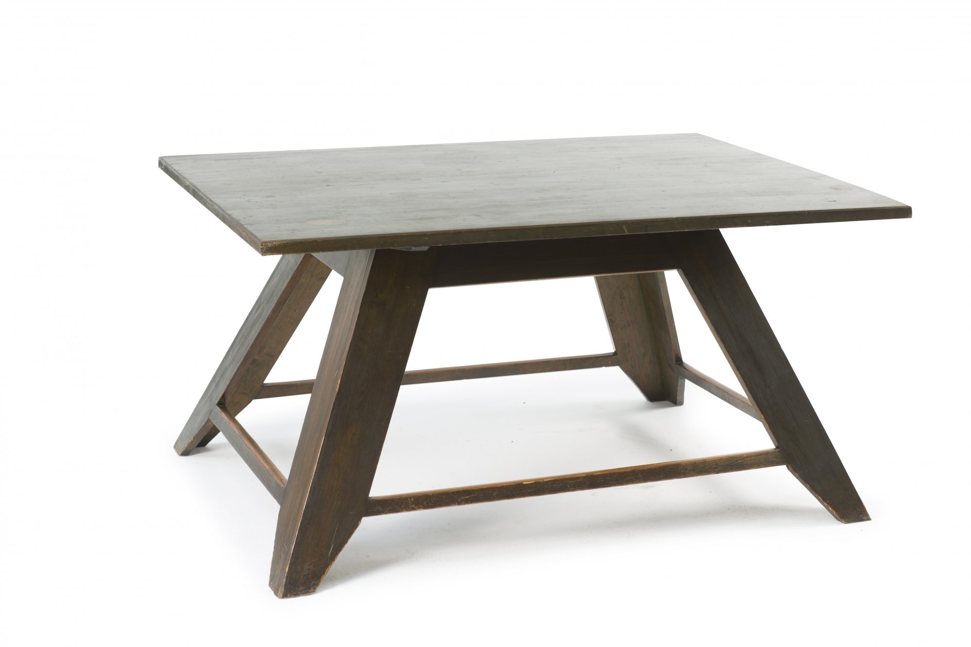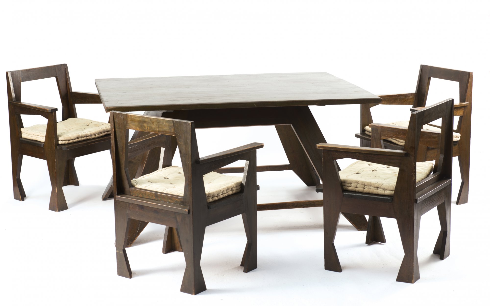 Josef Goçar. Dining table and four armchairs, c1914. Five pieces. Table: H. 77.5 cm, 150 x 108.5 cm; chairs: H. 82 cm, 64.5 x 53 cm. Pinewood, stained dark.