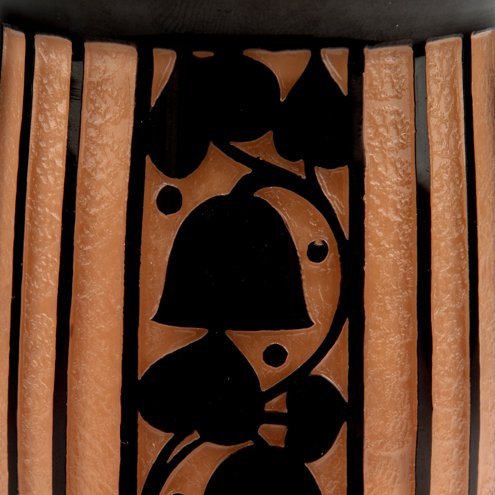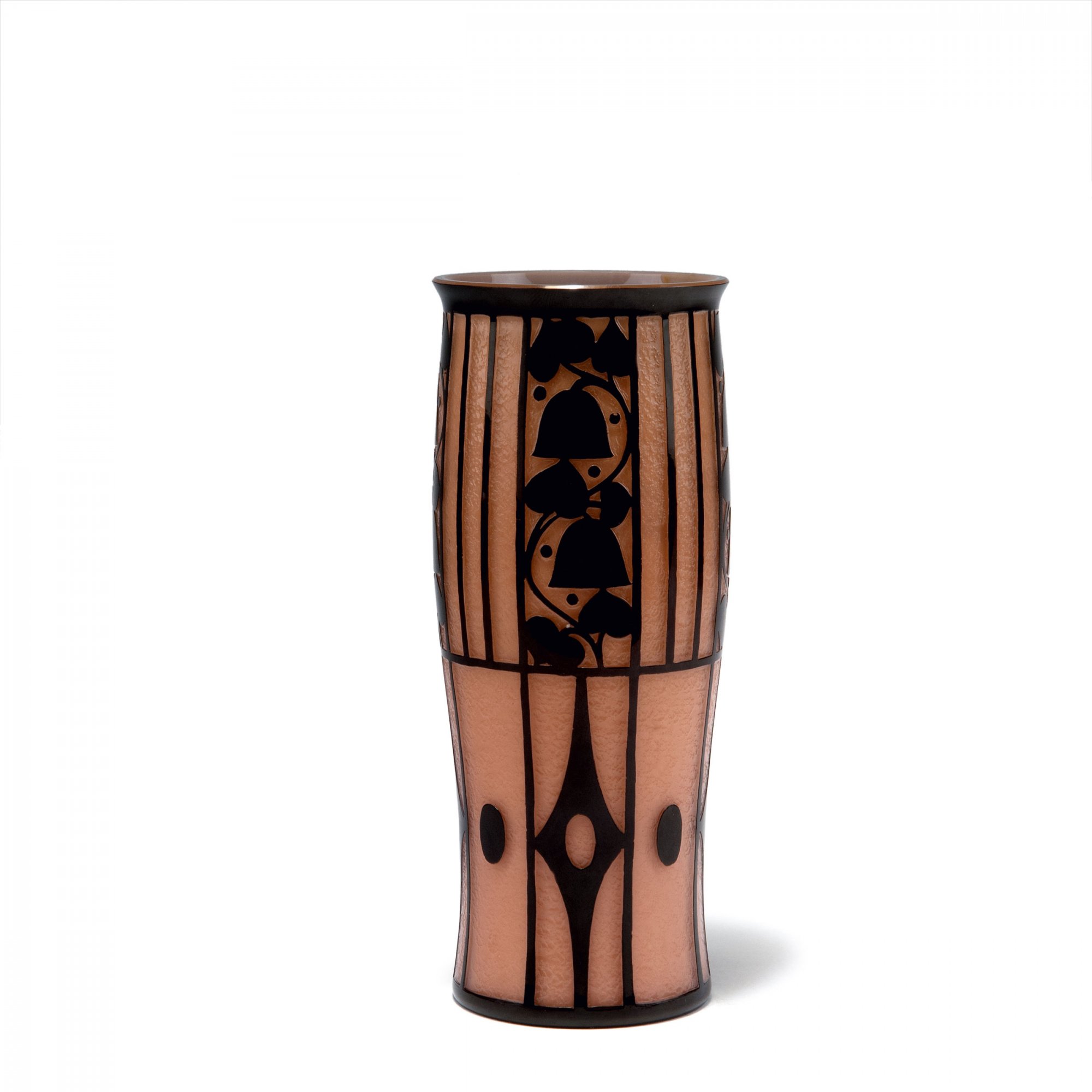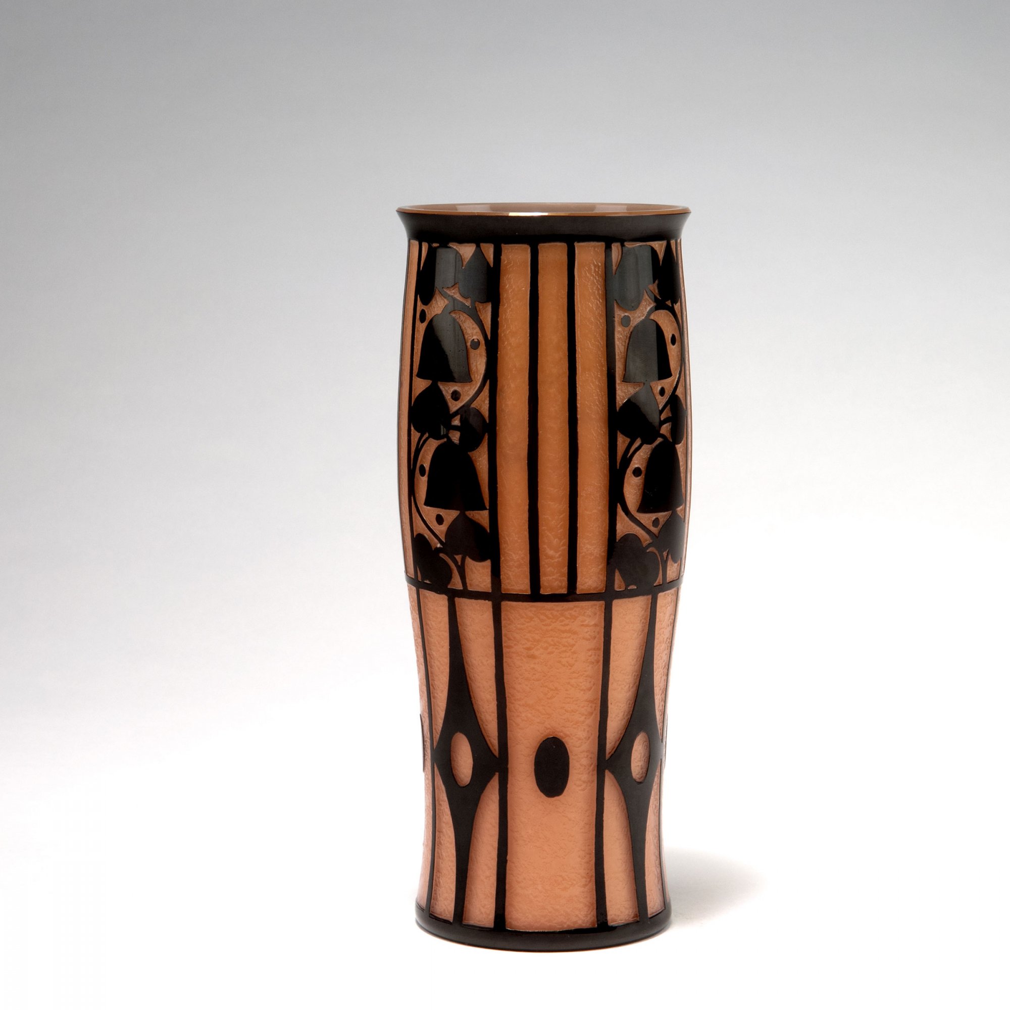 Josef Hoffmann. Vase, 1911. H. 20.4 cm. Made by Johann Loetz Wwe., Klostermühle. Cased glass, pale pink (Neurot), clear and black. Multiply etched pattern with flowers and lozenges and grids.
