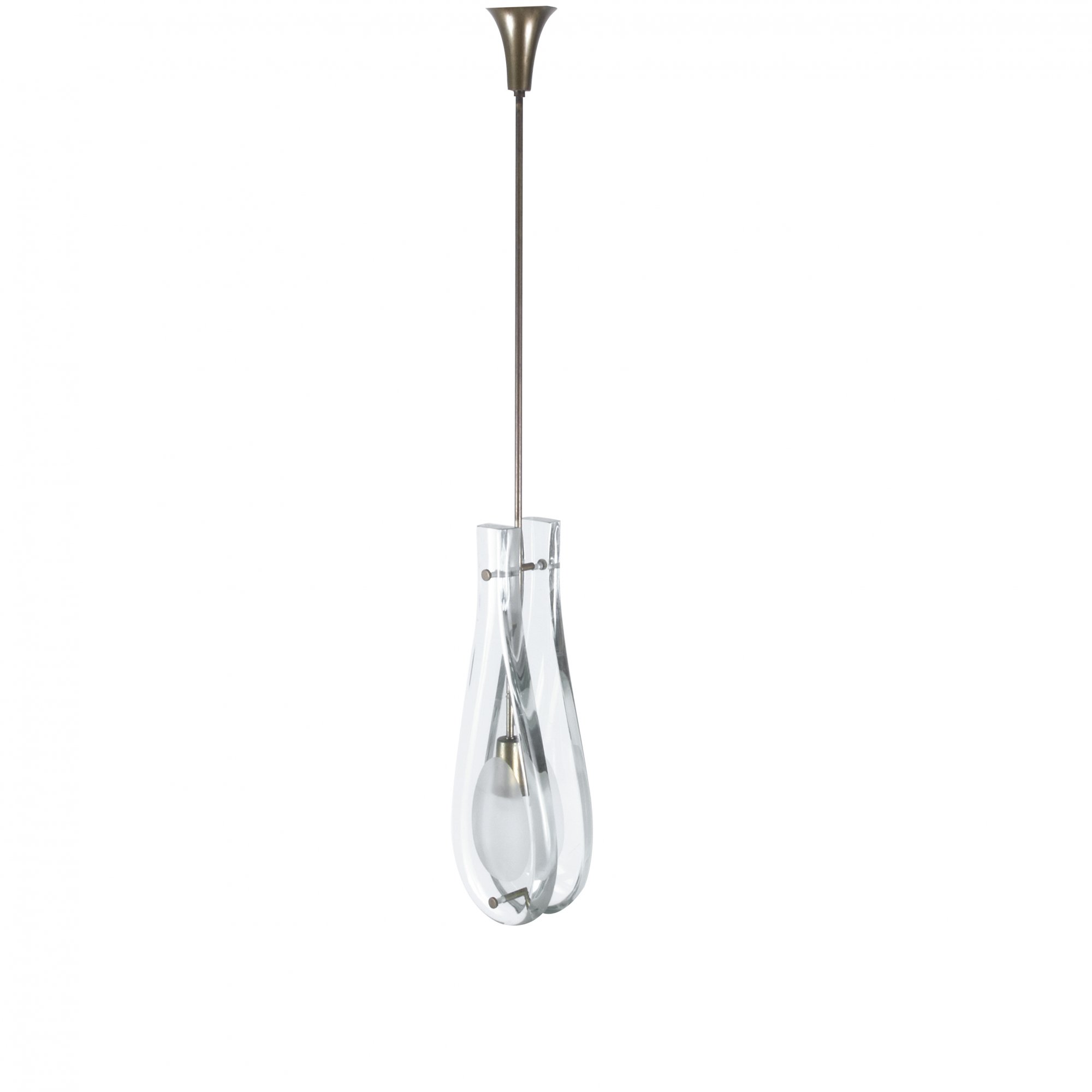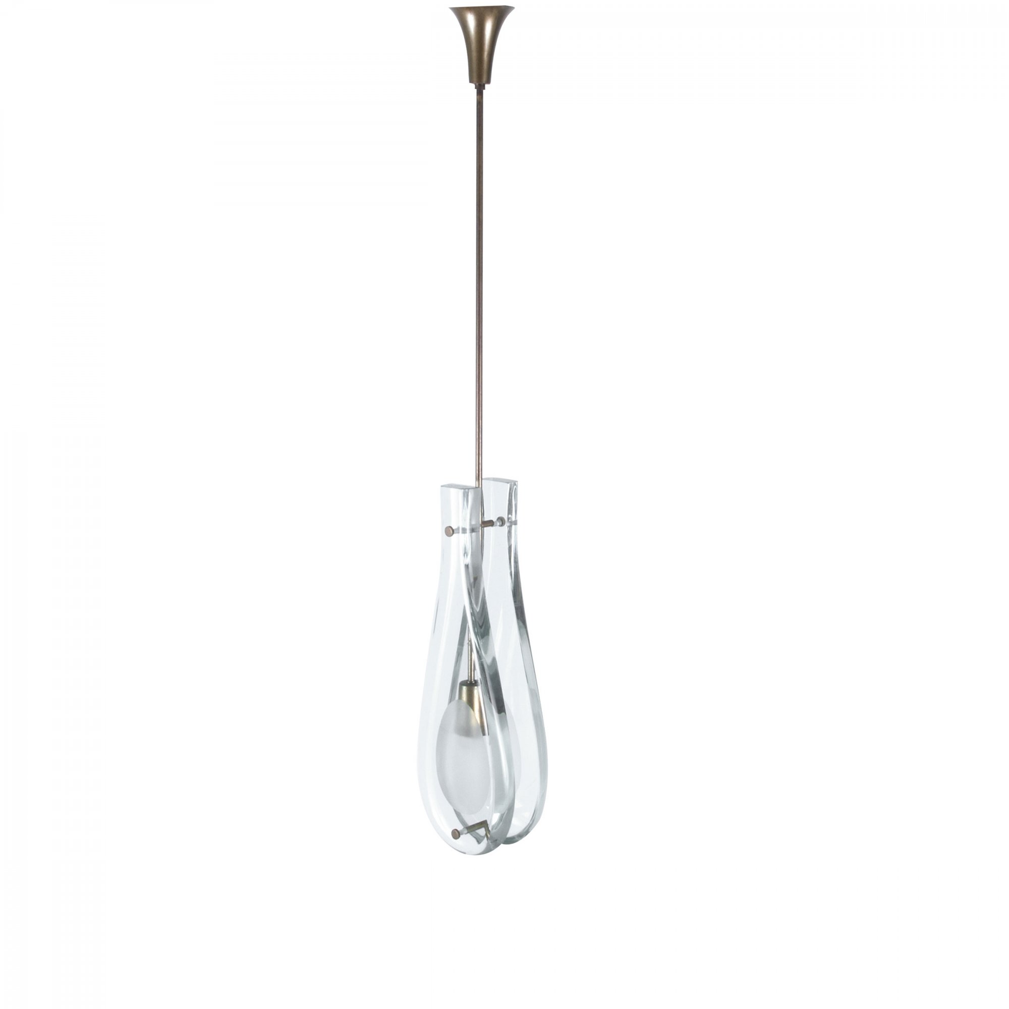 Max Ingrand. '2259' ceiling light, c1965. H. 94 x 9.5 x 15 cm. Made by Fontana Arte, Milan. Tubular brass, sheet brass, clear glass, part matted.