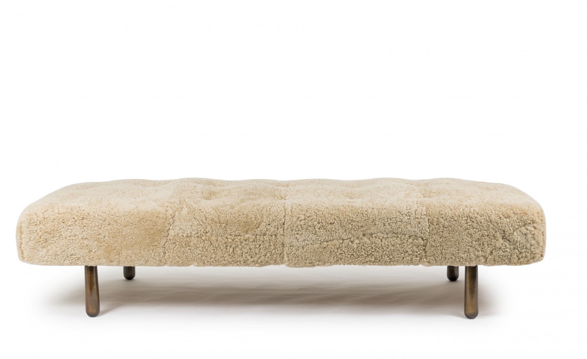 Philip Arctander (in the style of). Daybed, 1940/50s. H. 43 x 190 x 77 cm. Wooden construction, beech with dark patina, pale brown/golden sheep skin. Marked: Paper label with faint inscription.