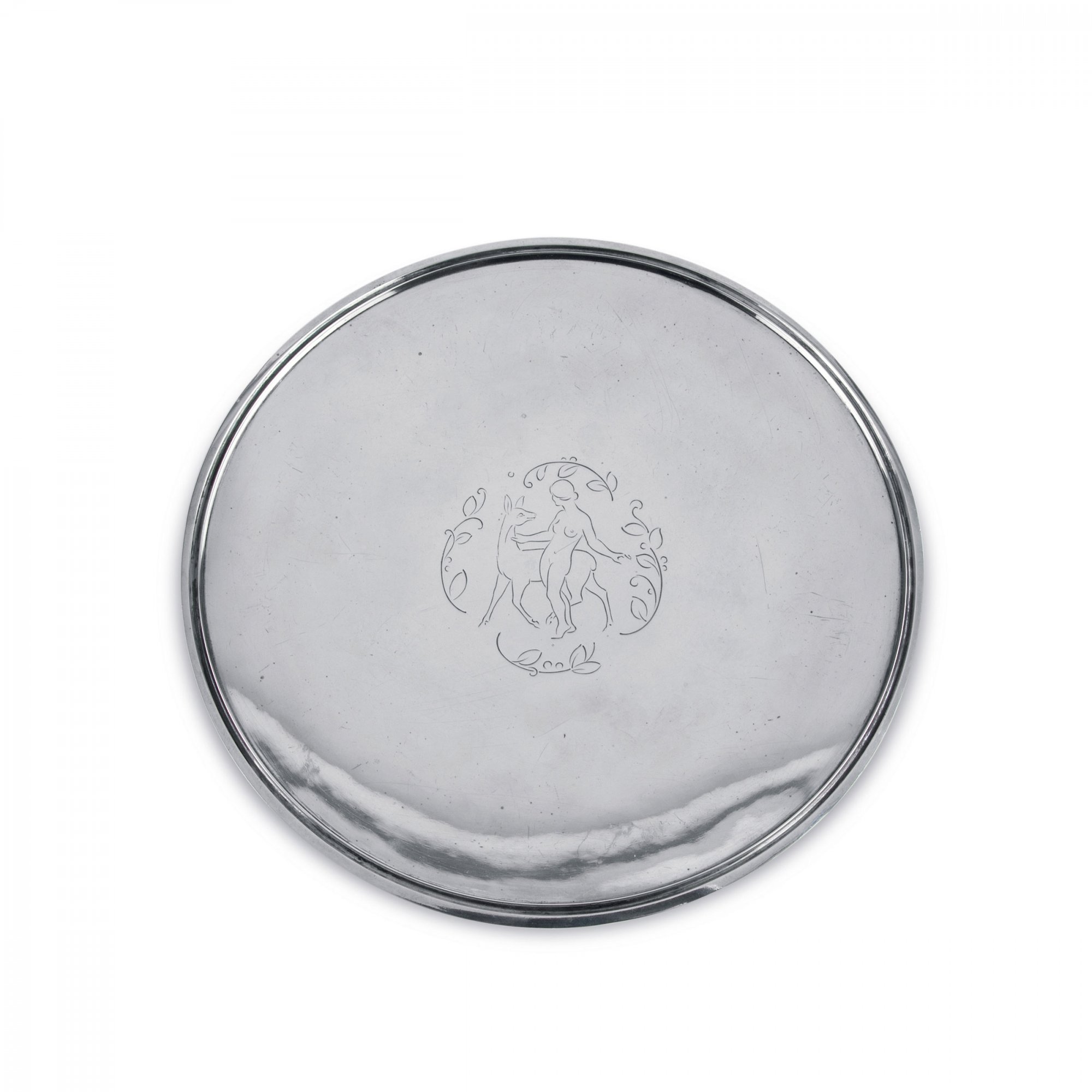 Aage Weimar. Decorative plate, 1931. D. 28 cm. Made by Evald Nielsen, Copenhagen. Silver, engraved pattern. Marked: KJÖBENHAVN, city mark 31, Evald Nielsen, C. F. Heise, DESSIN AAW.