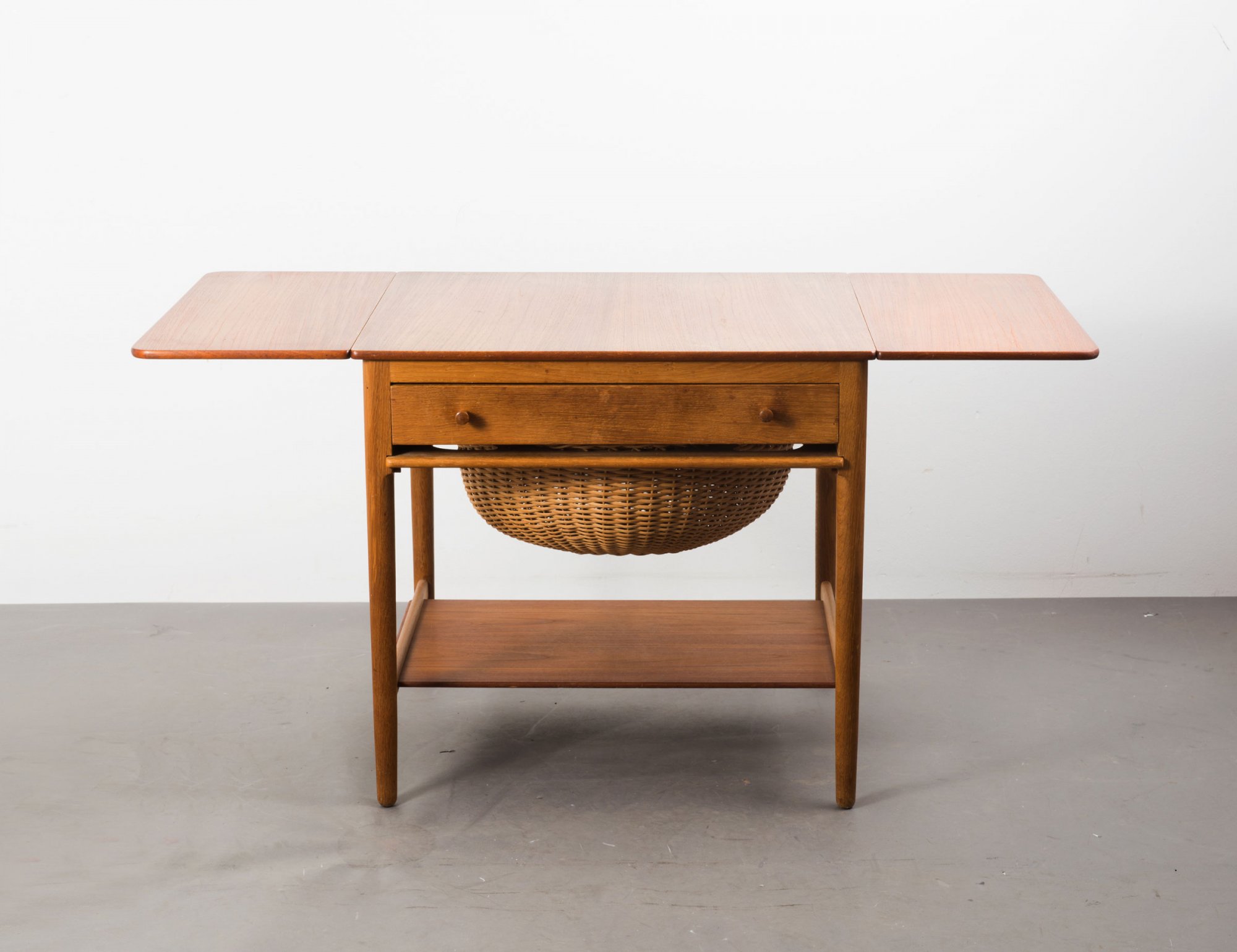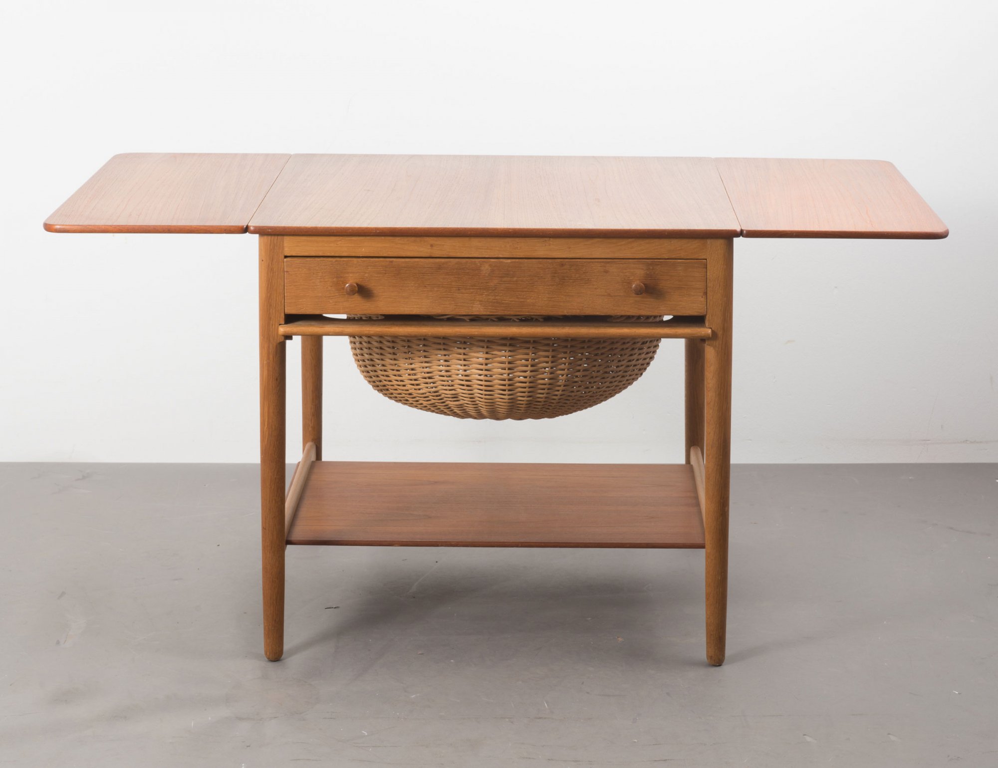 Hans J. Wegner. 'AT 33' sewing cabinet, 1949. H. 60 x 66.5-121 x 58 cm. Made by Andreas Tuck, Copenhagen. Teak veneer, oak, wickerwork. Marked: Maker's stamp.