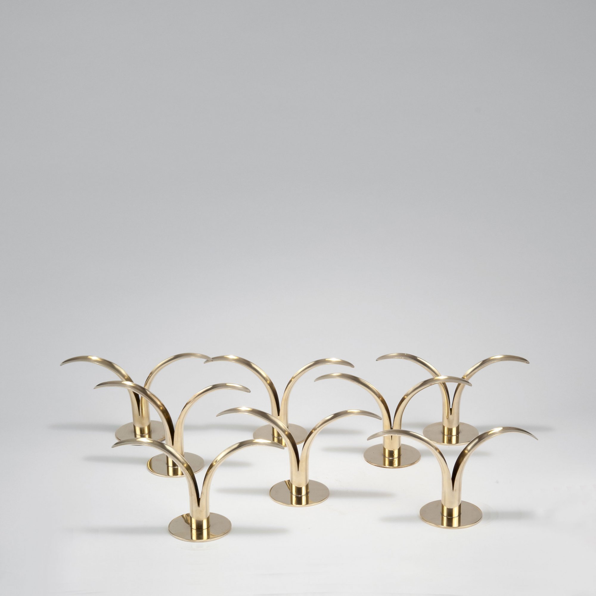 Ivar Alenius Björk. Eight 'Lily' candlesticks, 1930s. H. 12 cm. Made by Ystad Metall, Ystad. Brass. Marked: IAB, Ystad-Metall MADE IN SWEDEN.
