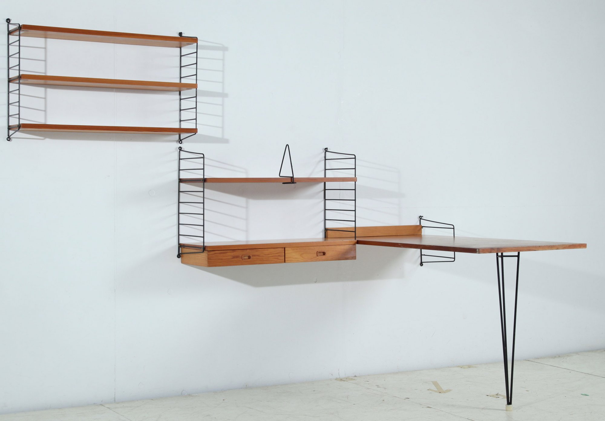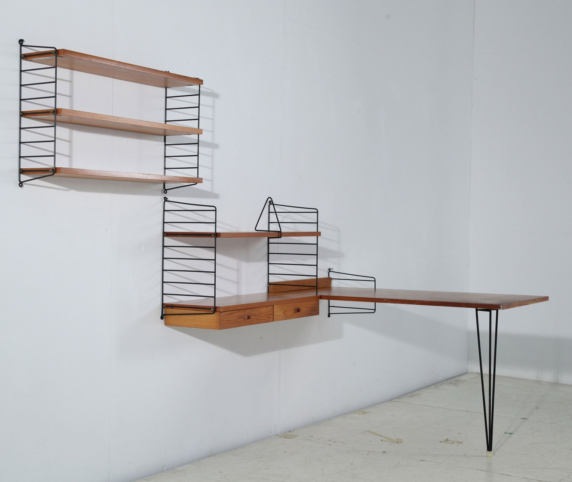 Nisse Strinning. 'String' wall shelf with desk, c1955. Ladders: 2 x (48 x 30 cm); 2 x (48 x 20 cm); 1 x (23 x 30 cm) + 1 bookend. Shelves: 3 x (78 x 20 cm); 1 x (78 x 30 cm); shelves with drawers: H. 10 x 78 x 30 cm; desk: H. 72 x 117 x 58 cm. Made by String Design AB, Vällingsby. Blockboard, ash veneer, metal rods coated black.