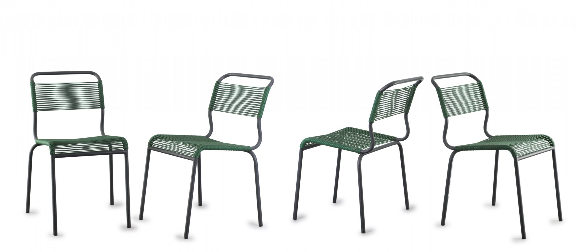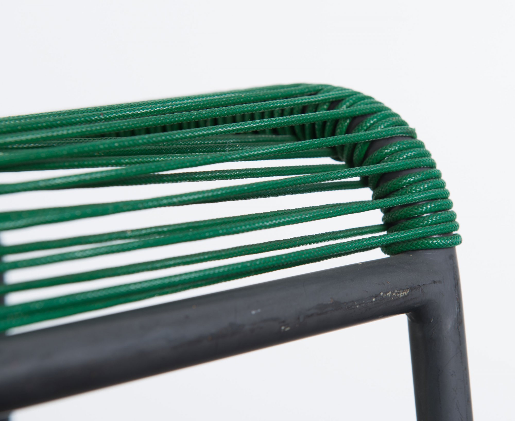 André Dupré. Four '130' stacking chairs, 1947. H. 76 x 50 x 57.5 cm. Made by Knoll International, New York. Tubular steel, painted black, green straps.