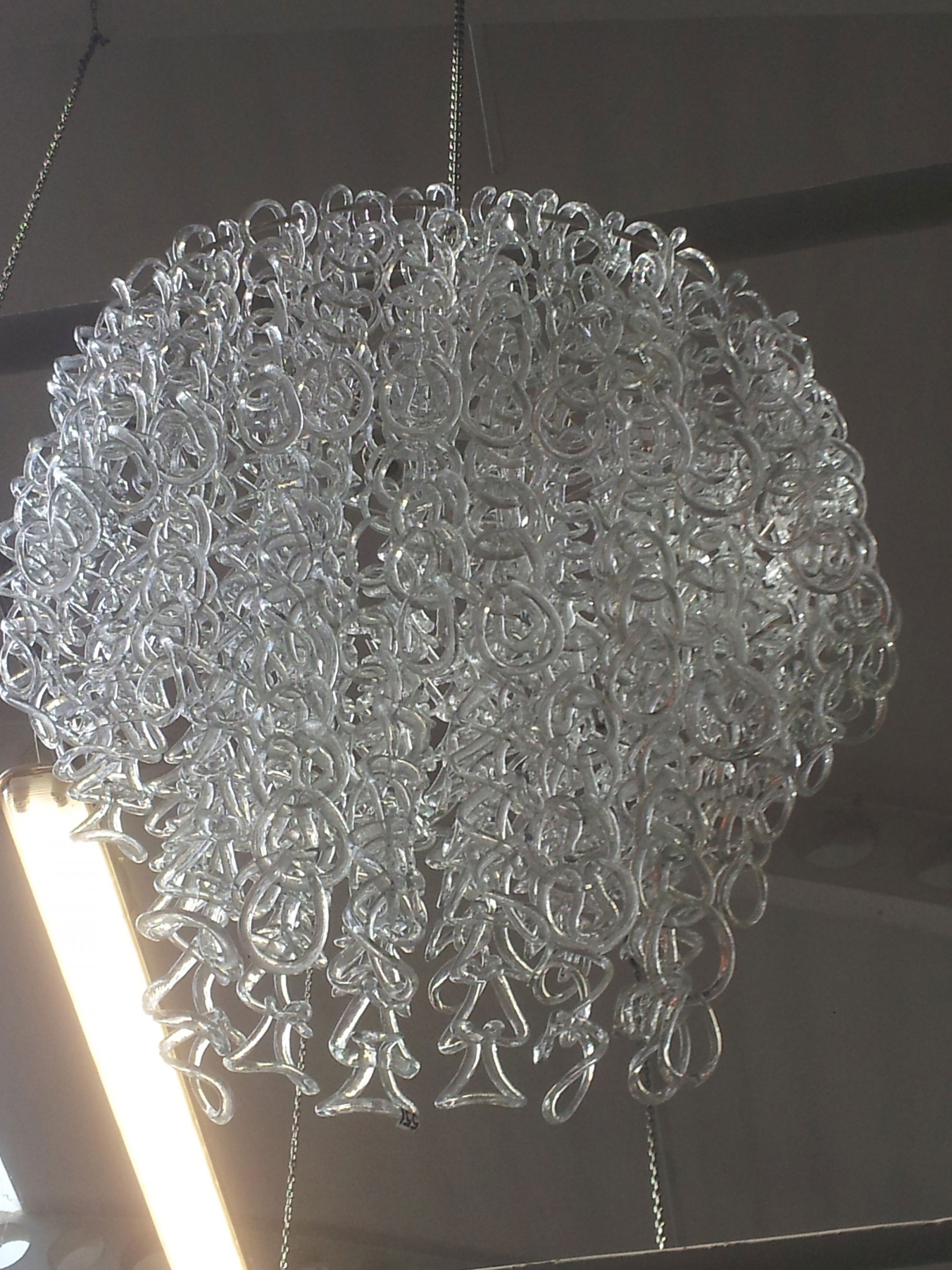 Angelo Mangiarotti. 'Giogali' ceiling light, 1967. Circa 200 Glass hooks. H. c110 cm, D. 45 cm. Made by Vistosi, Murano. Sheet metal, glass hooks.