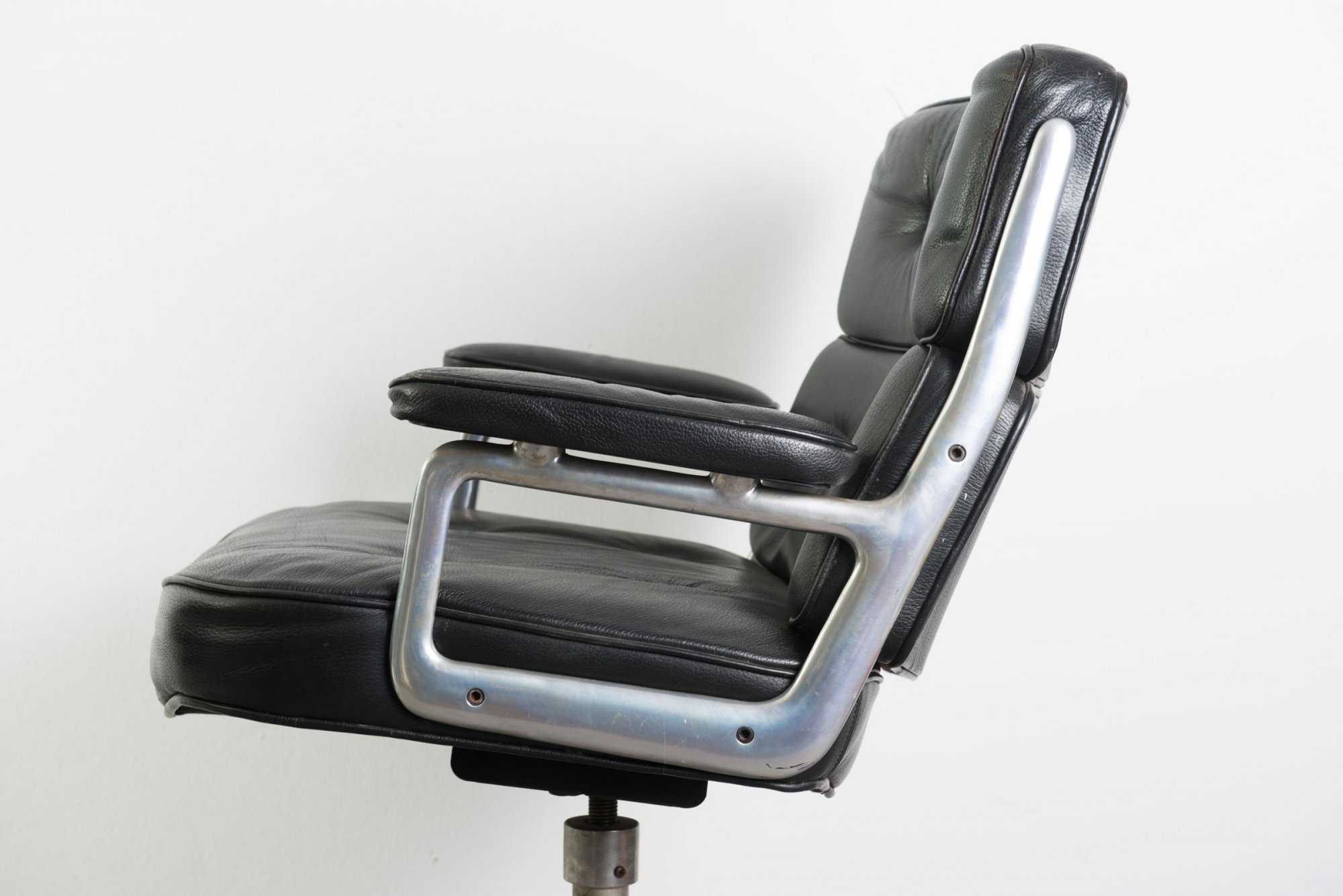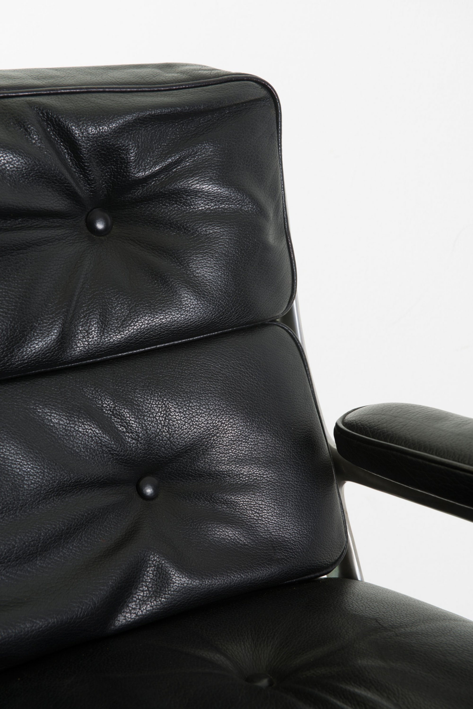 Charles Eames. Two 'Time Life' armchairs, 1960. H. 85 x 73 x 73 cm. Made by ICF Cadsana (attributed). Cast aluminium, black leather.