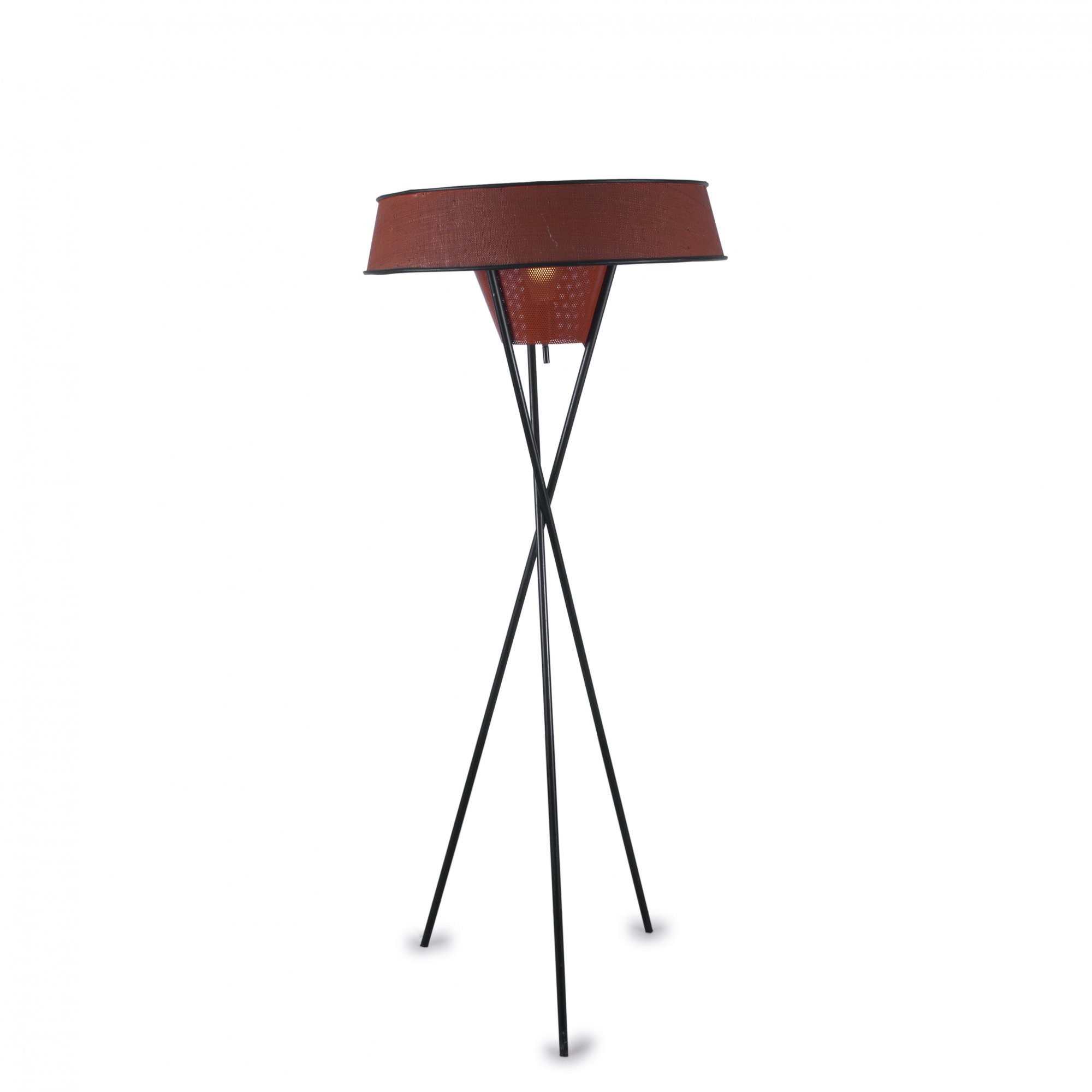 Gerald Thurston. Floor light, 1950s. H. 122 cm, D. 52 cm. Made by Lightolier Inc., Jersey City, N. J.. Tubular metal, painted black, sheet metal, fabric, red.