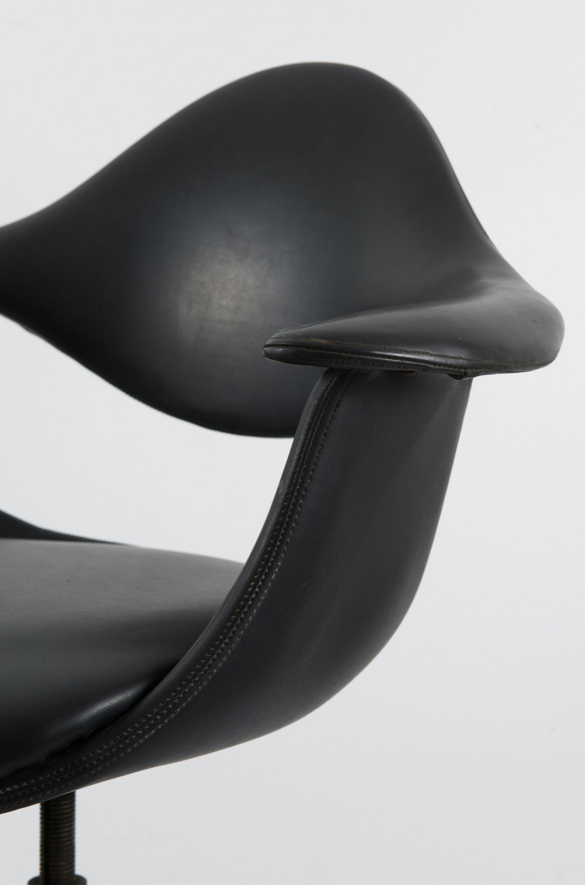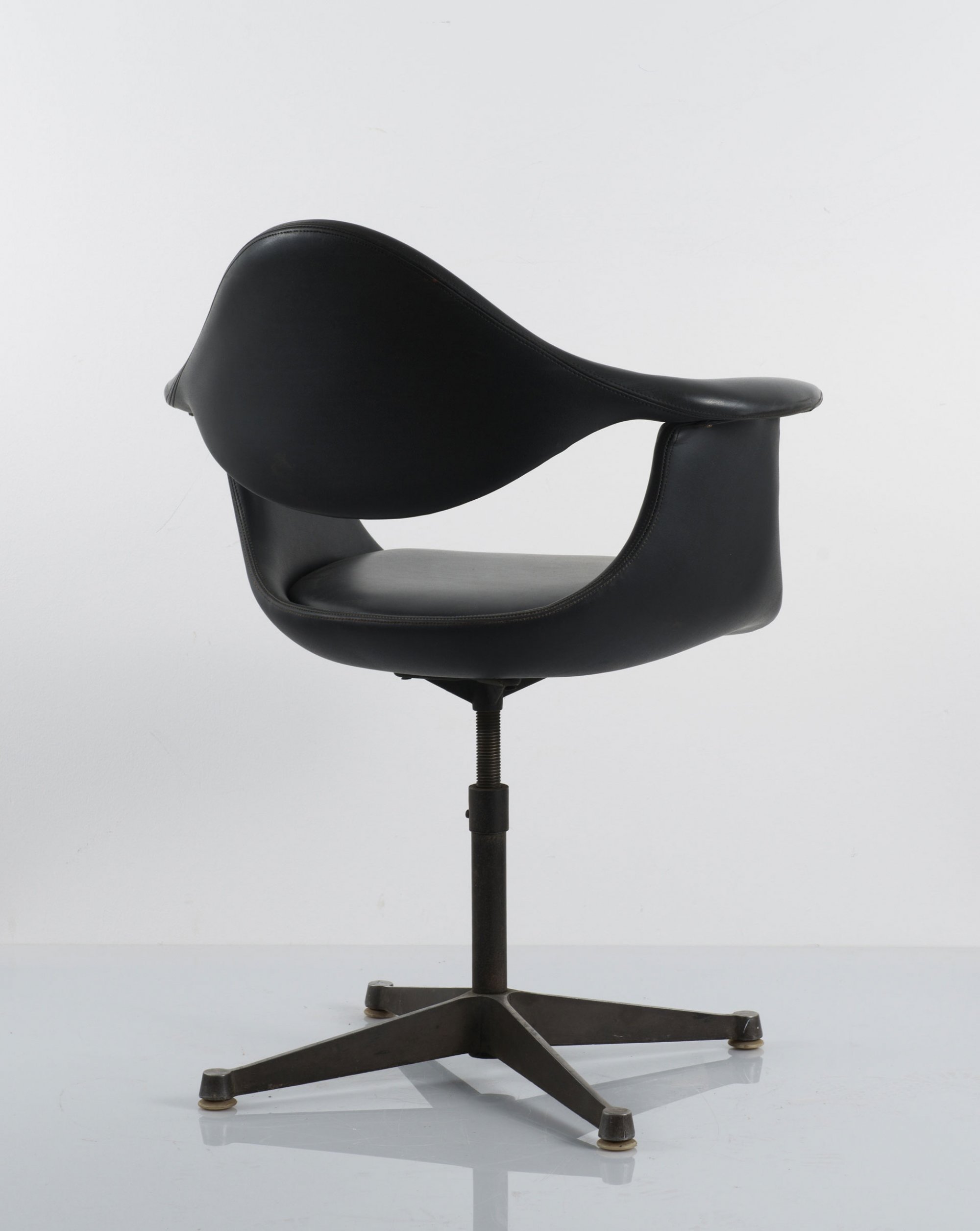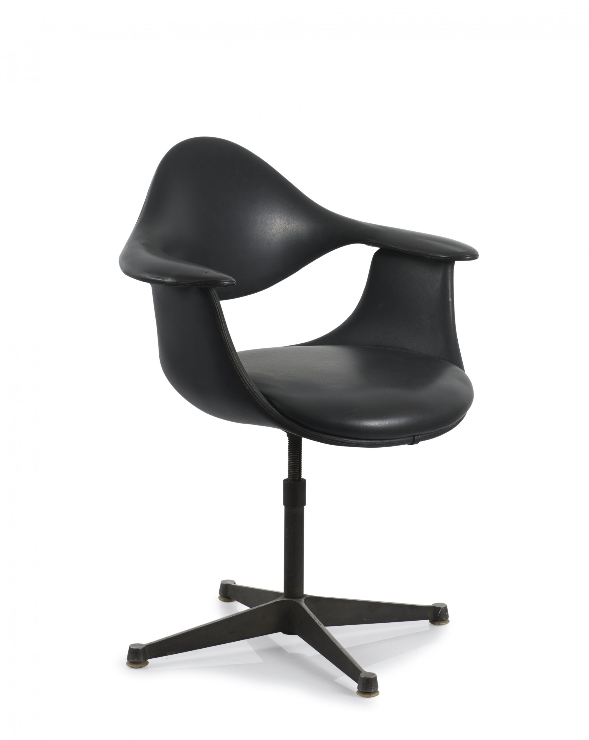 George Nelson. 'DAF' chair, c1964. H. 85 x 70 x 52 cm. Made by ICF, Cadsana. Cast aluminium, black leatherette. Marked: Maker's mark.