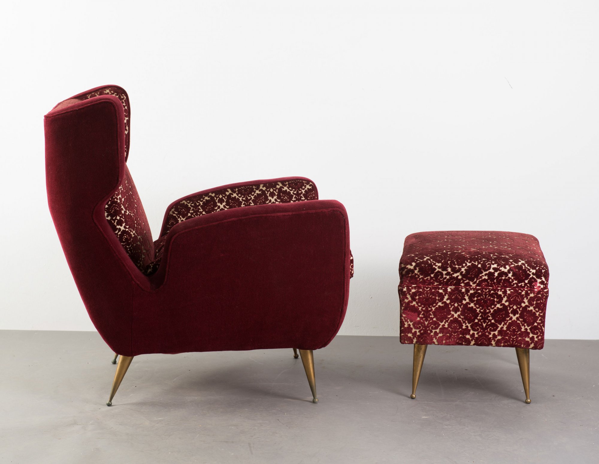 Italy. Two armchairs and ottomans, 1950s. Armchairs: H. 88 x 71 x 83 cm; ottomans: H. 43 x 52 x 42 cm. Brass, velvet covers.