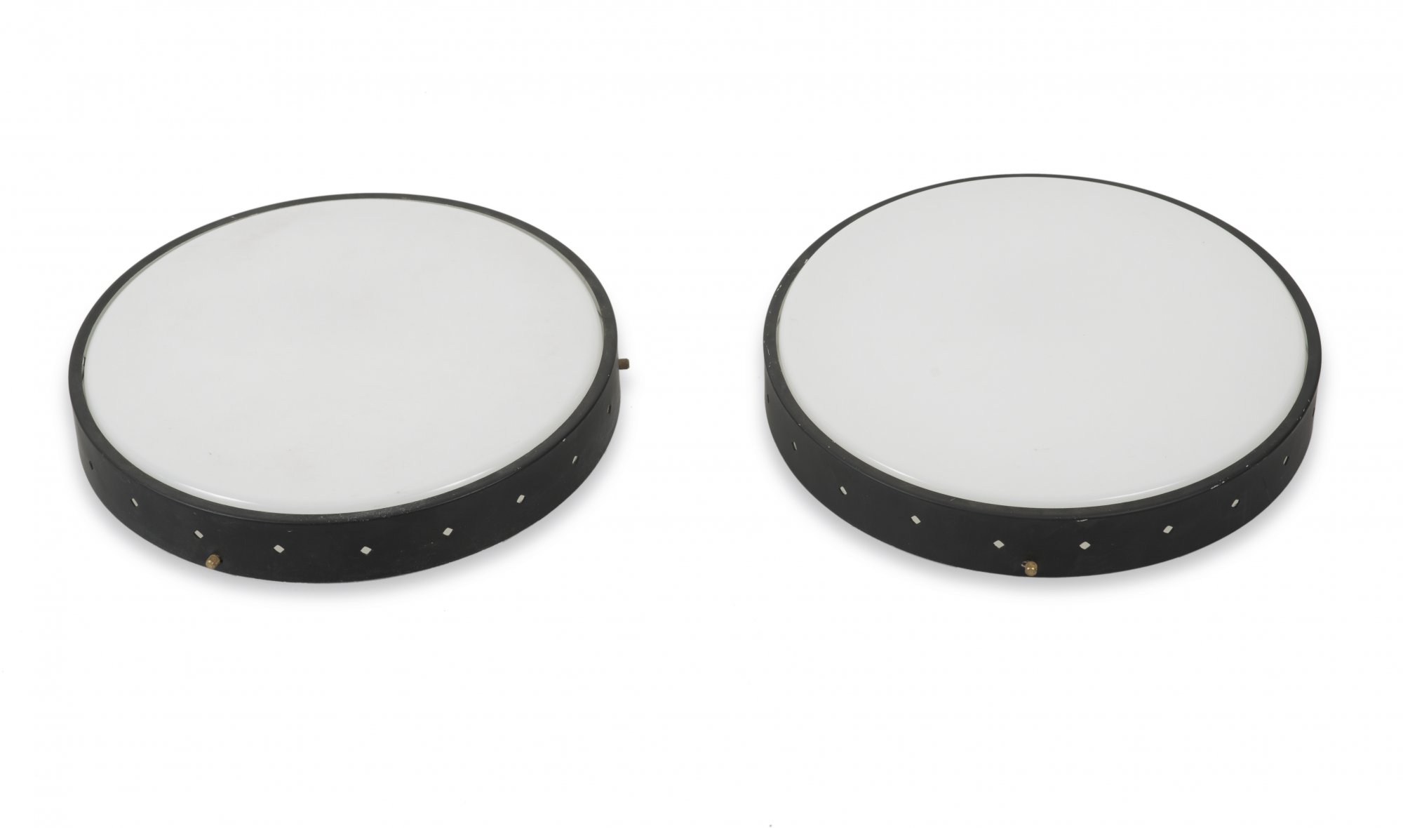 Italy. Two ceiling lights/sconces, 1950s. D. 34.5 cm. Sheet metal, painted black, white Plexiglass.