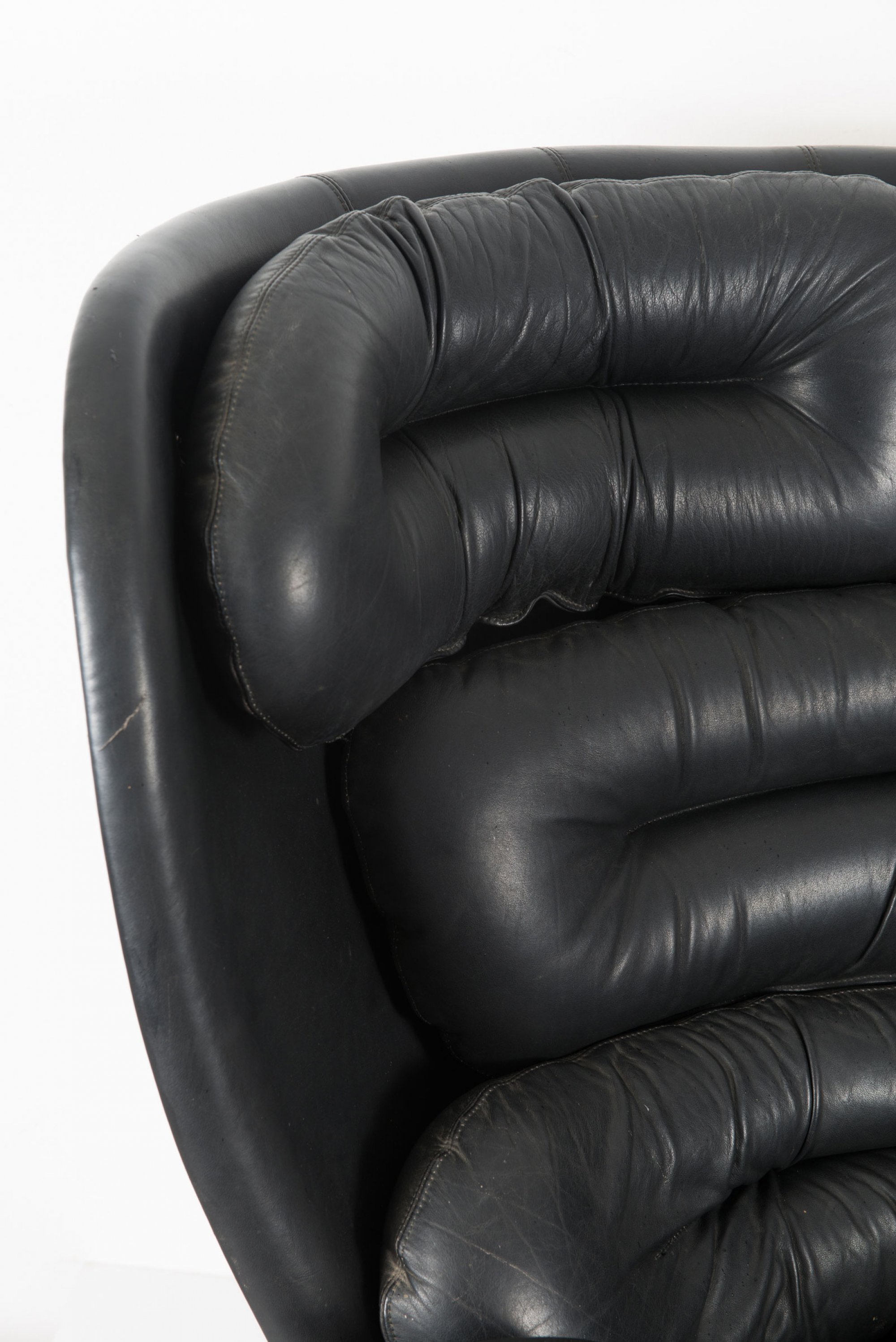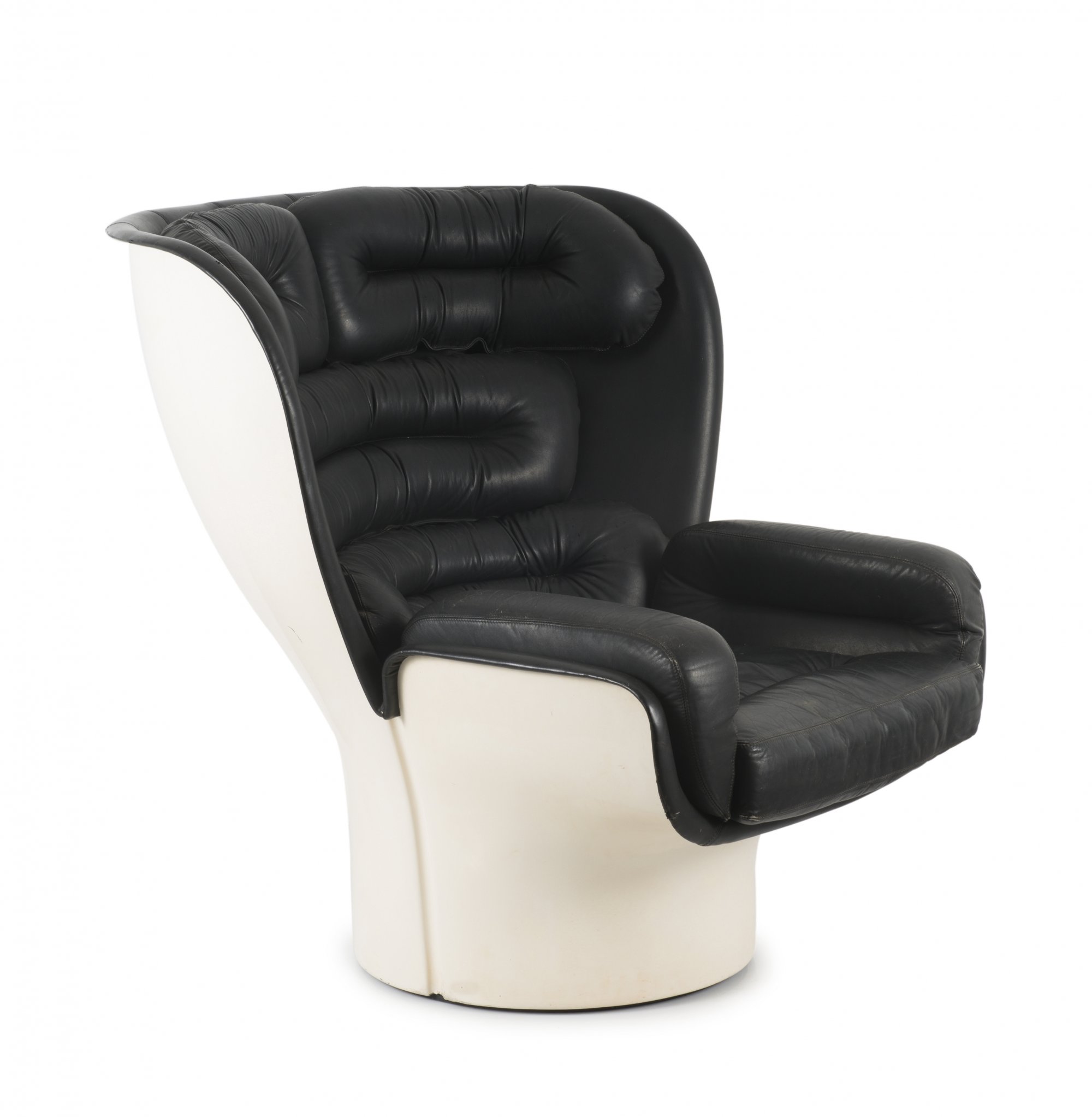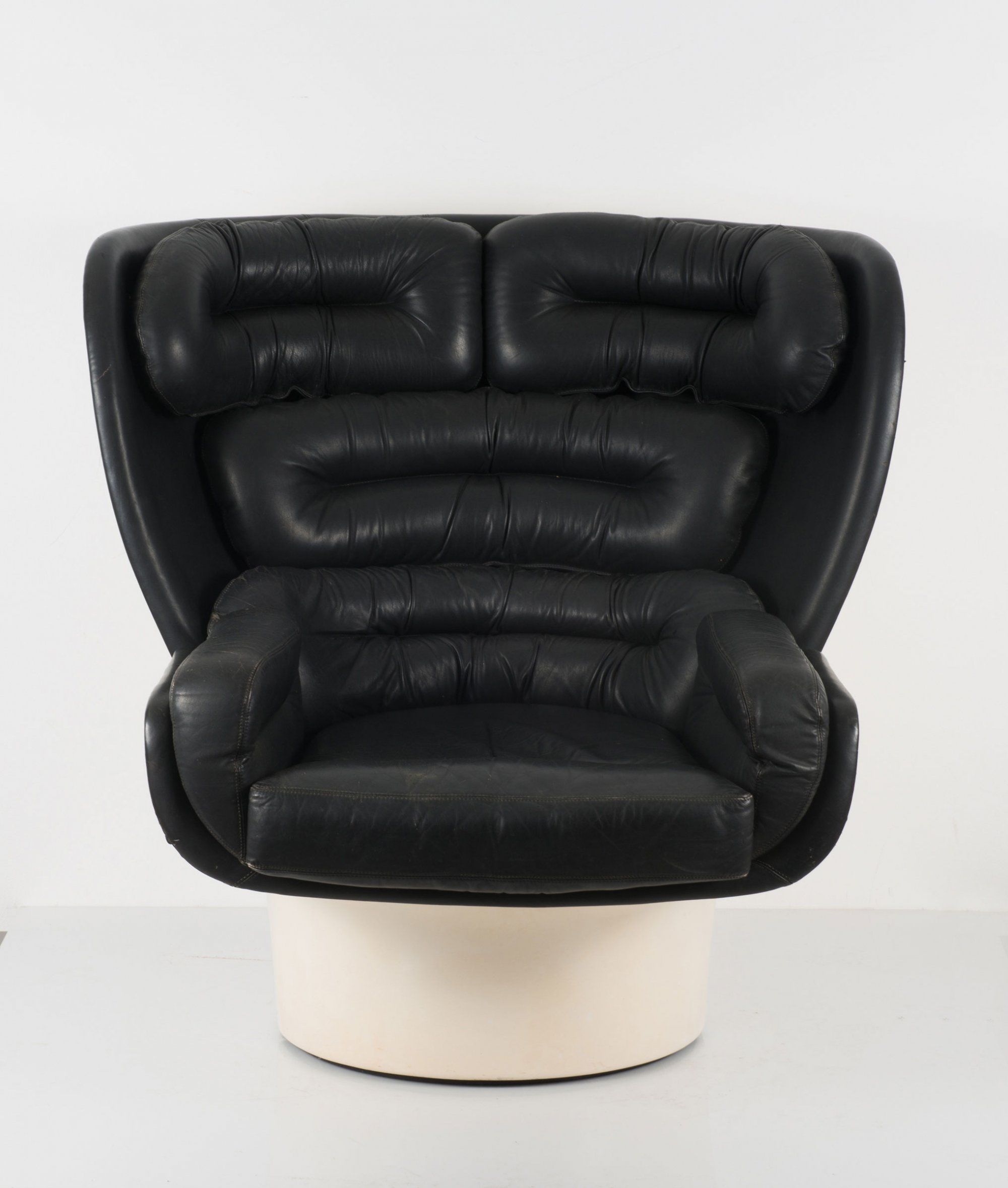 Joe Colombo. 'Elda' armchair, 1965. H. 93 x 95,5 x 95 cm. Made by Comfort, Milan. White plastic, reinforced with fiberglass, black leather.