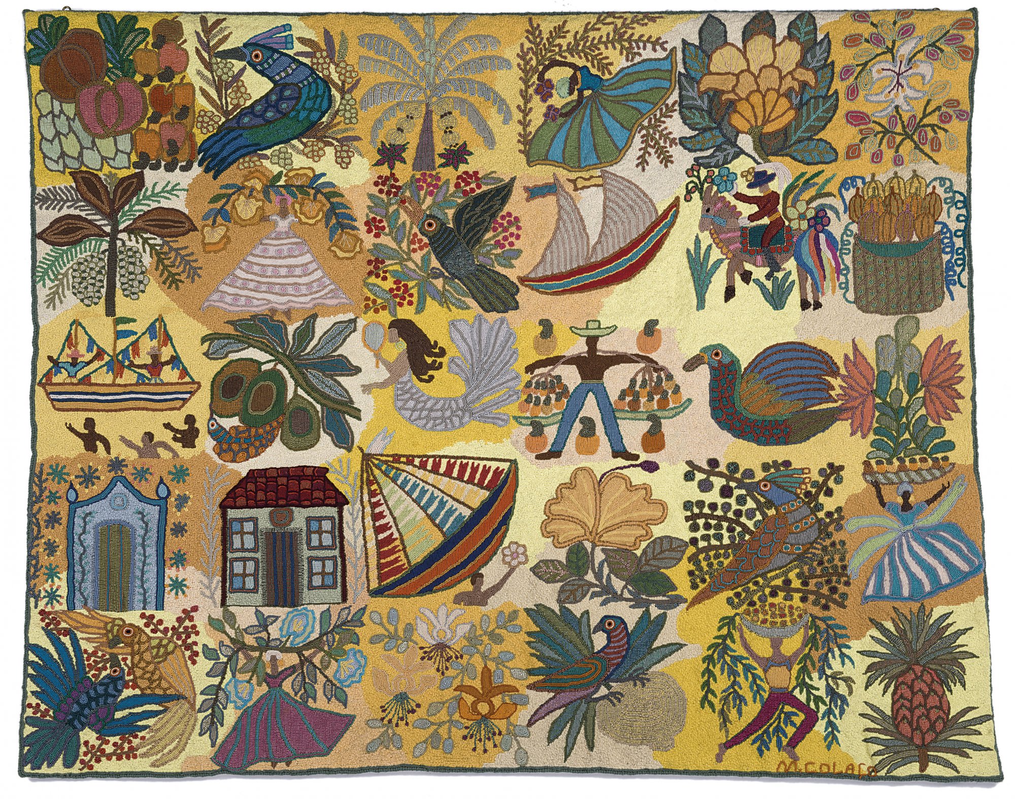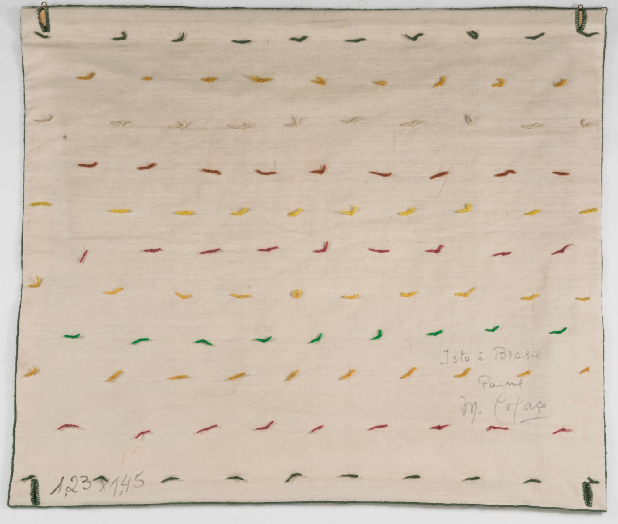 Madeleine Colaço. Tapestry, 1960s. 123 x 145 cm. Polychromatic wood. Marked: woven-in signature M. Colaço, verso: Isto e Brasil, Paime, M. Colaço, 1,23 x 1,45.