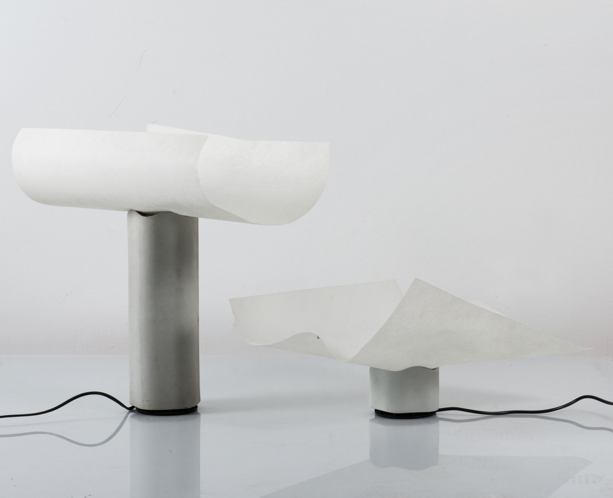 Mario Bellini. Two 'Area 50' table lights, c1974. H. 10.5-38.5 (body) x 45 x 47 cm (shade). Made by Artemide, Milan. Porcelain, white, black and white plastic, fibrous thick paper. Marked: Artemide Area 10/20/40, Mario Bellini, Italy, Pending.