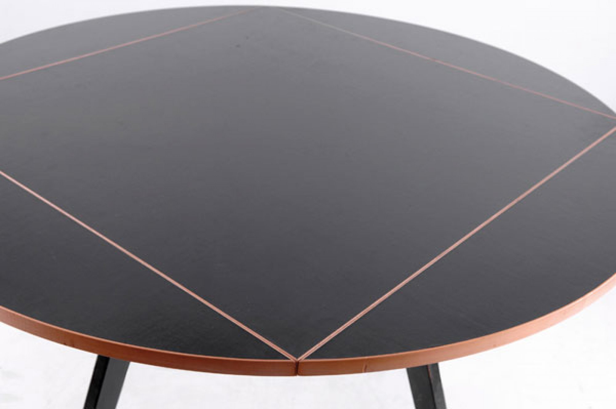Max Bill. Rectangular/ round table, 1949. H. 74 x 90.3 x 90.3 cm respectively D. 127.5 cm. Made by Horgen-Glarus, Glarus for Wohnbedarf AG, Zurich/ Basel. Maple, part black, black linoleum and wooden bandings.
