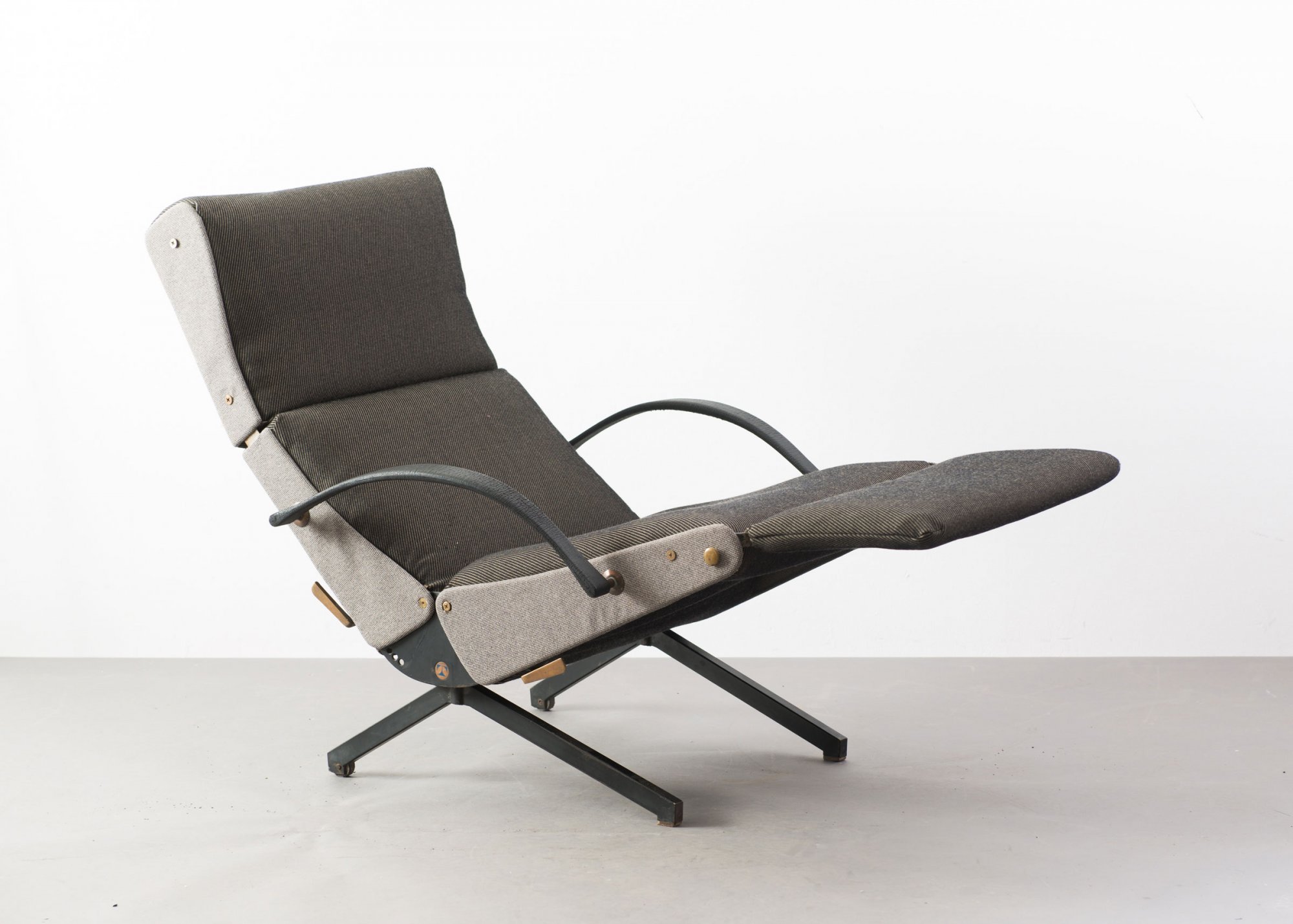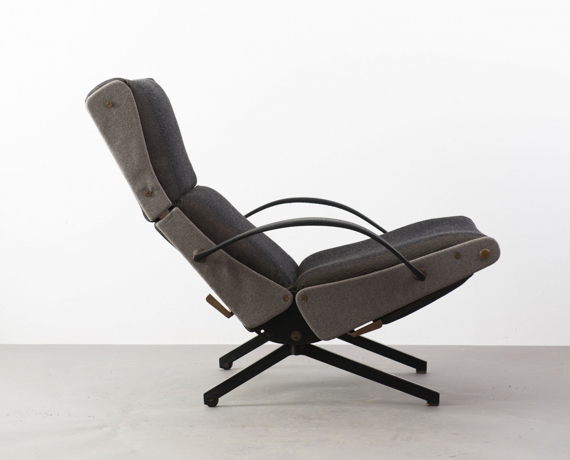 Osvaldo Borsani. 'P 40' armchair, 1955. H. 80 x 72 x 140 cm. Made by Tecno, Milan. Tubular steel, painted black, brass, grey fabric. Marked: Tecno badge.