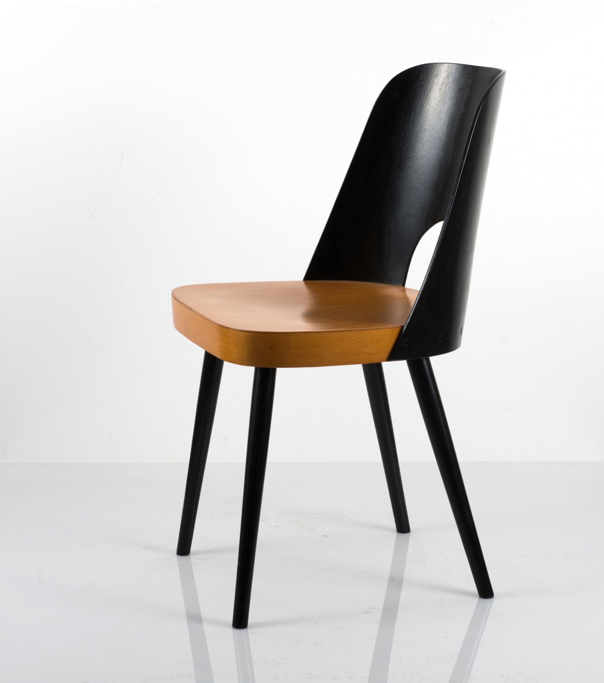 Oswald Haerdtl (attributed). Chair, c1950. H. 82 x 44 x 49 cm. Made by Ton, Czech Republic. Beech, plywood, painted black.