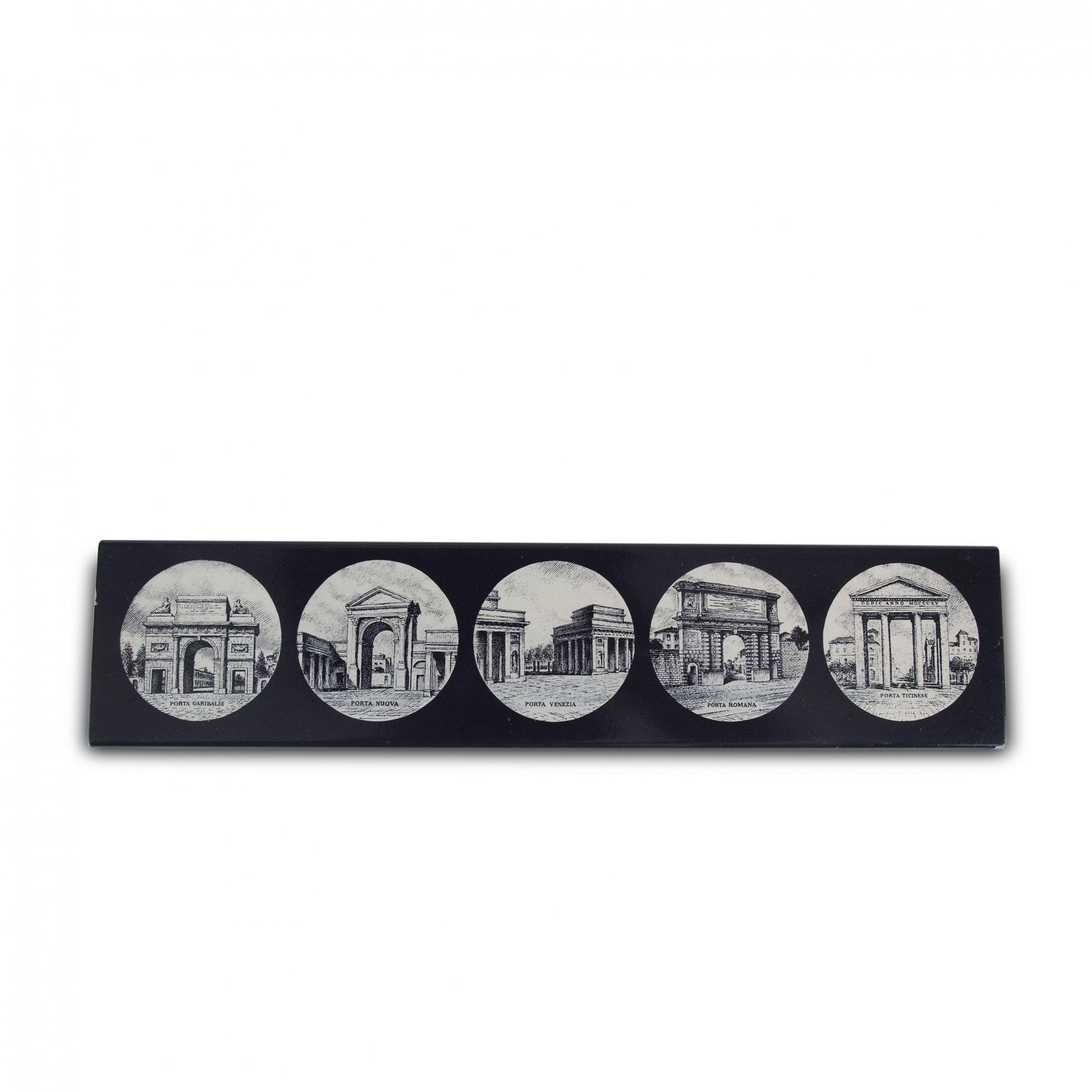 Piero Fornasetti. 'Porte di Milano' cigarette case, 1970s. H. 1.4 x 40.2 x 9.2 cm. Made by Fornasetti, Milan,in the 1970s. Sheet metal, painted black, b/w lithograph, gilded sheet aluminium. Marked: golden maker's decal: FORNASETTI MILANO MADE IN ITALY.