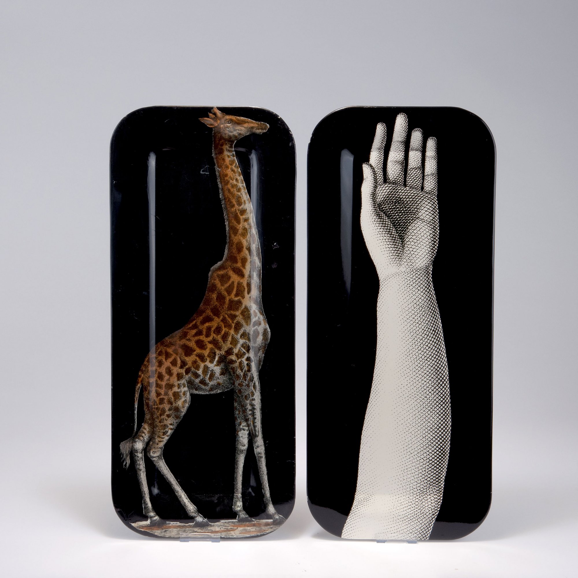 Piero Fornasetti. 'Braccio' tray, 1950s. 25.4 x 58.7 cm. Made by Fornasetti, Milan, in the 1980s. Sheet metal, painted black, b/w lithograph. Marked: Maker's decal: FORNASETTI MILANO MADE IN ITALY.
