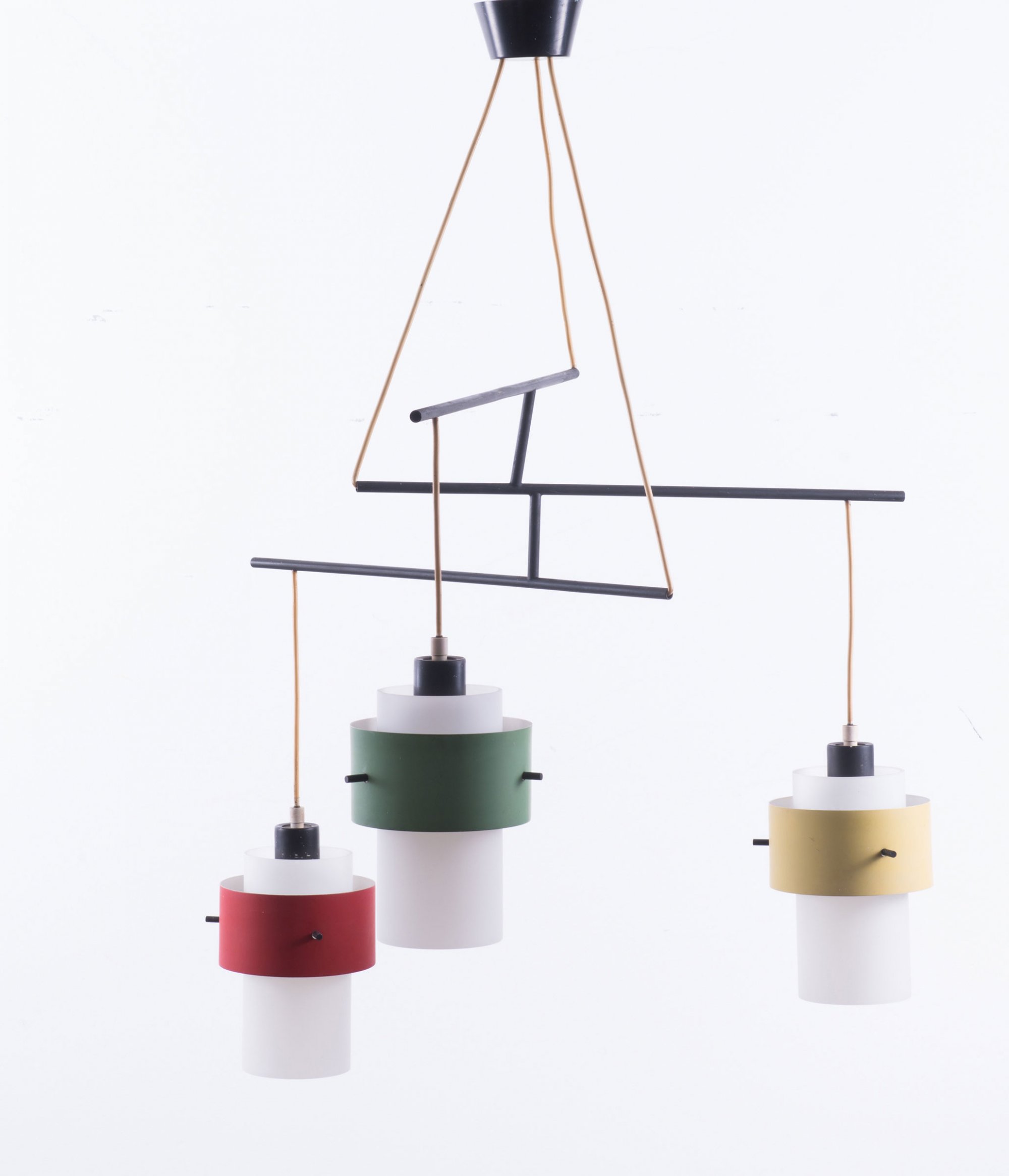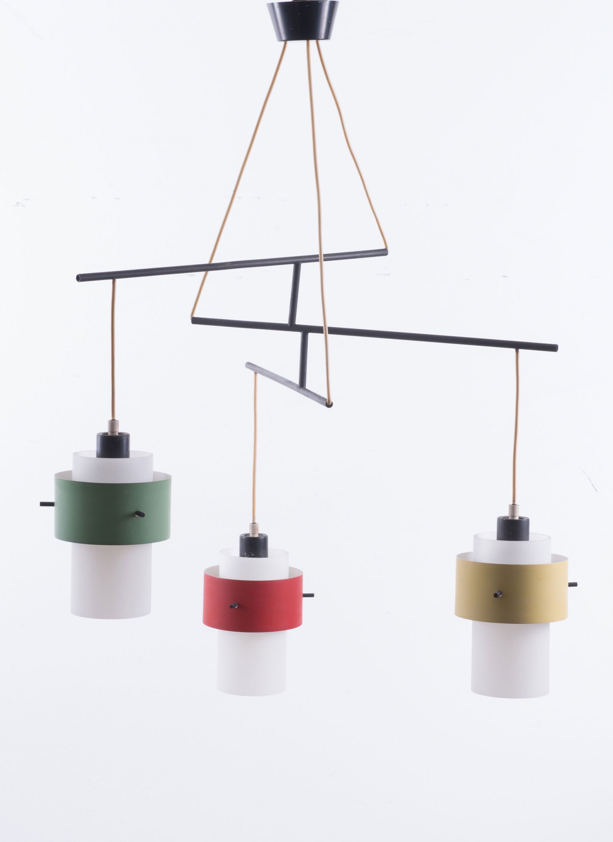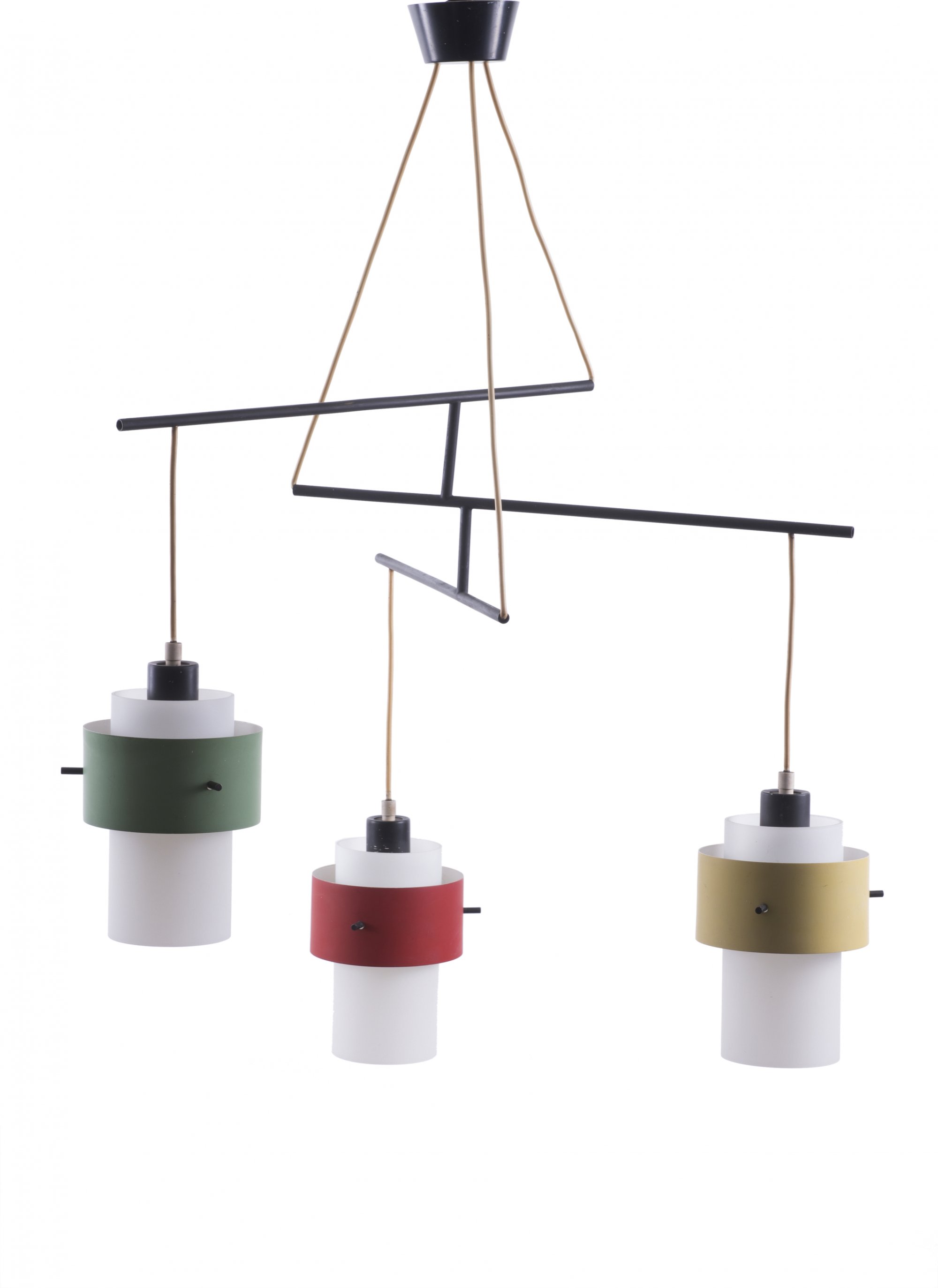 Stilnovo, Milan (attributed). Ceiling light, 1950s. H. 127 cm, D. 63 cm; shades: D. 14,5 cm. Tubular metal, sheet metal, painted black, red, yellow and green, white glass.
