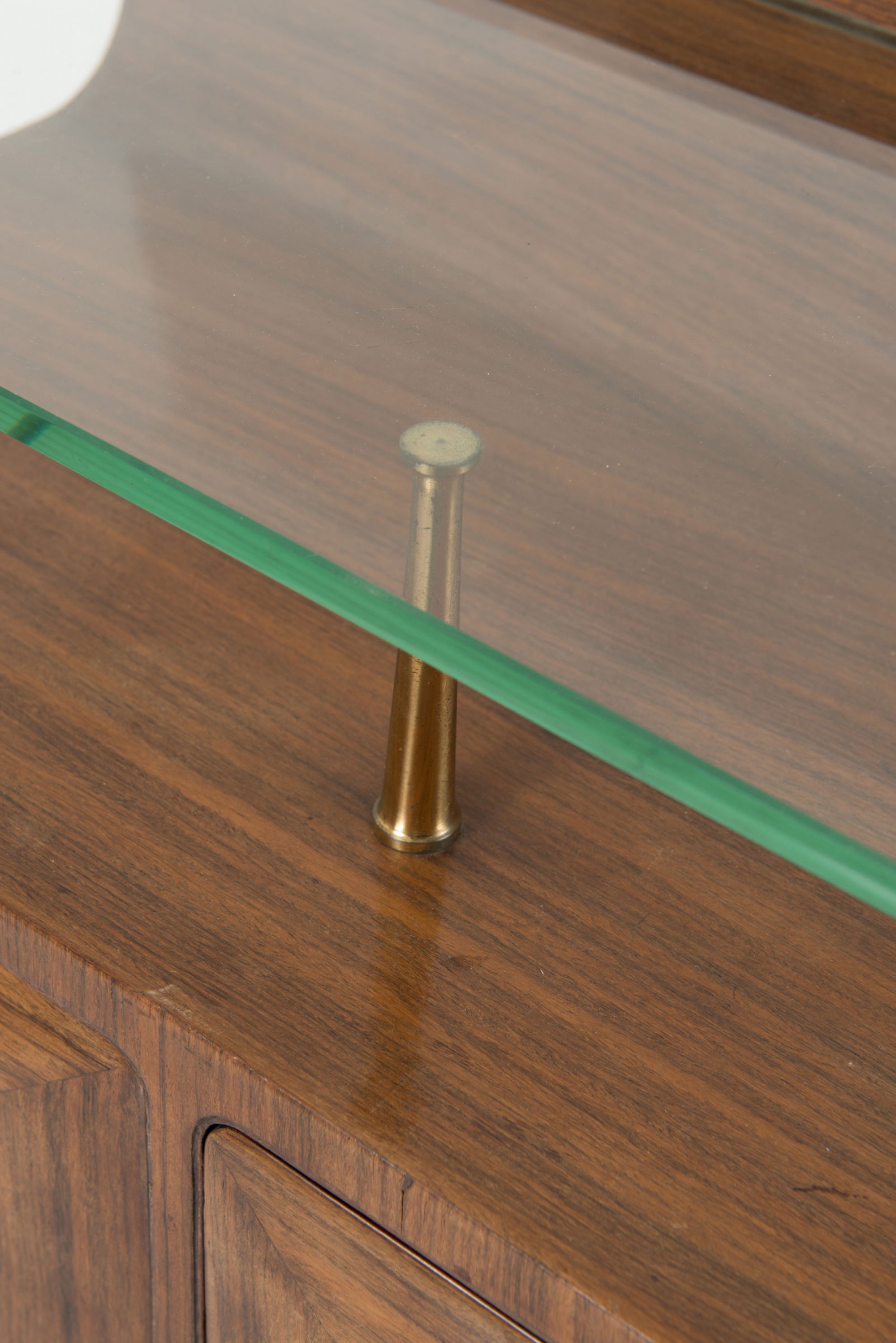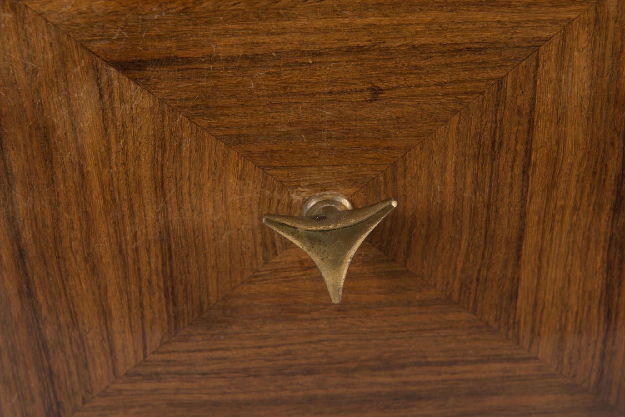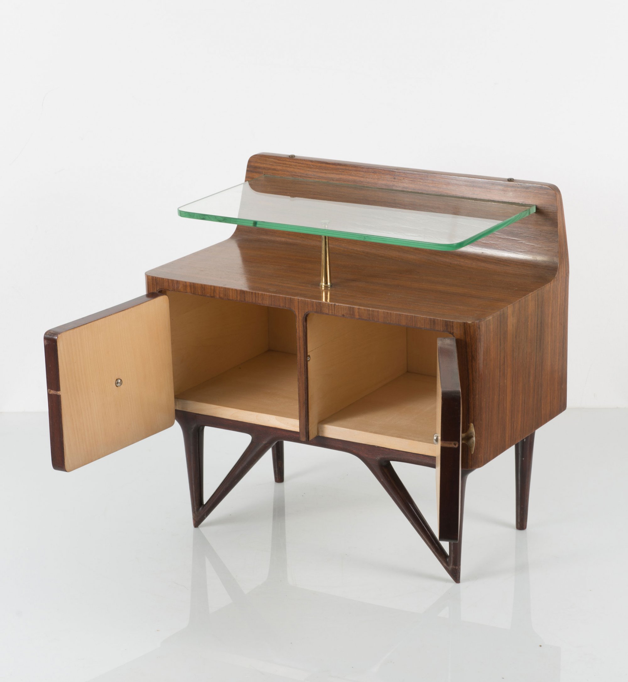 Vittorio Dassi (attributed). Two night stands, 1940s. H. 58 x 60 x 33 cm. Made by Dassi Mobili Moderni, Lissone (attributed). Blockboard, nut veneer, feet mahogany-stained, glass.