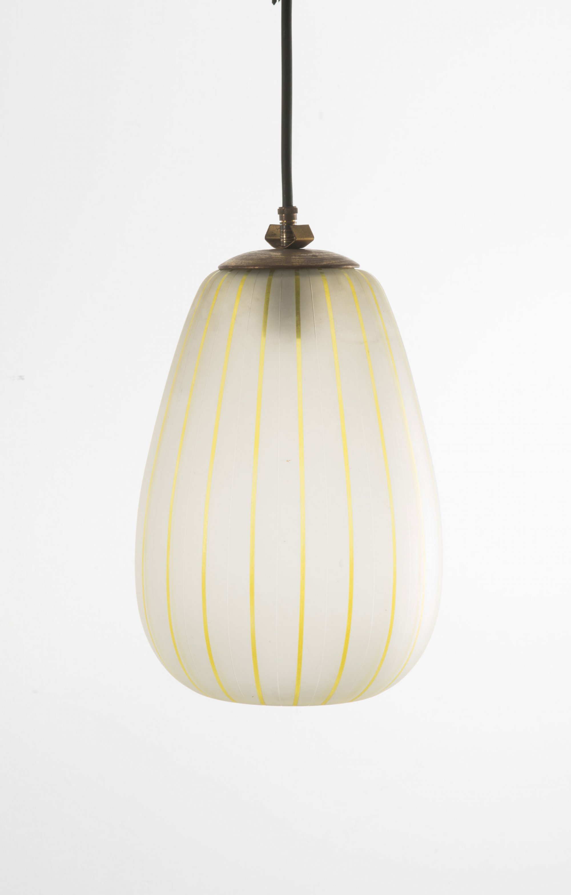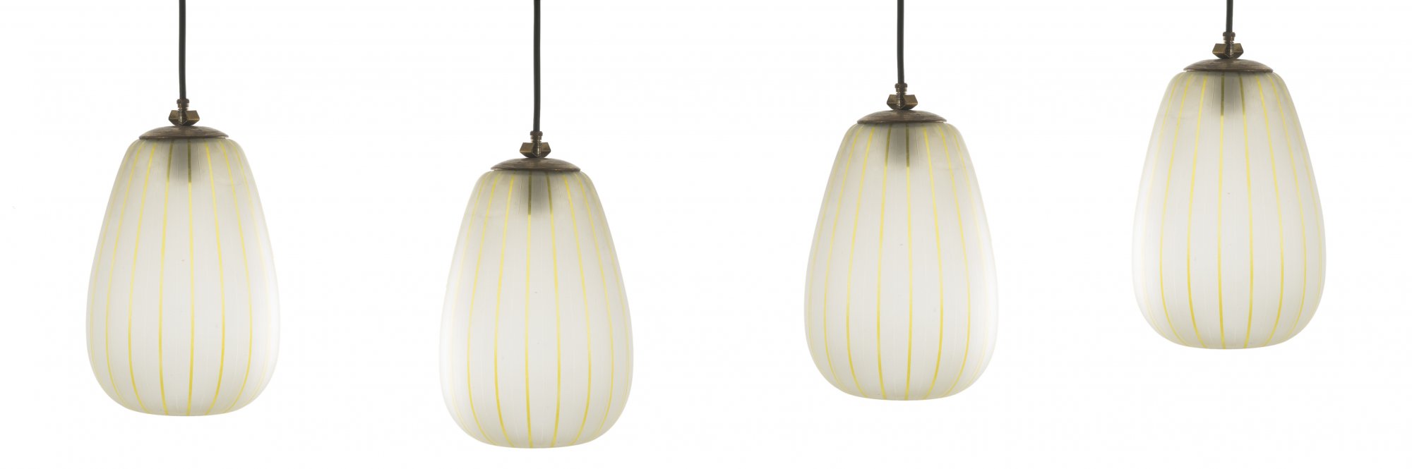 Wilhelm Wagenfeld. Four 'Diana' ceiling lights, c1954. H. 33 cm; D. 20.5 cm. Made by Peill & Putzler, Düren. Sheet brass, glass, clear matt and yellow.