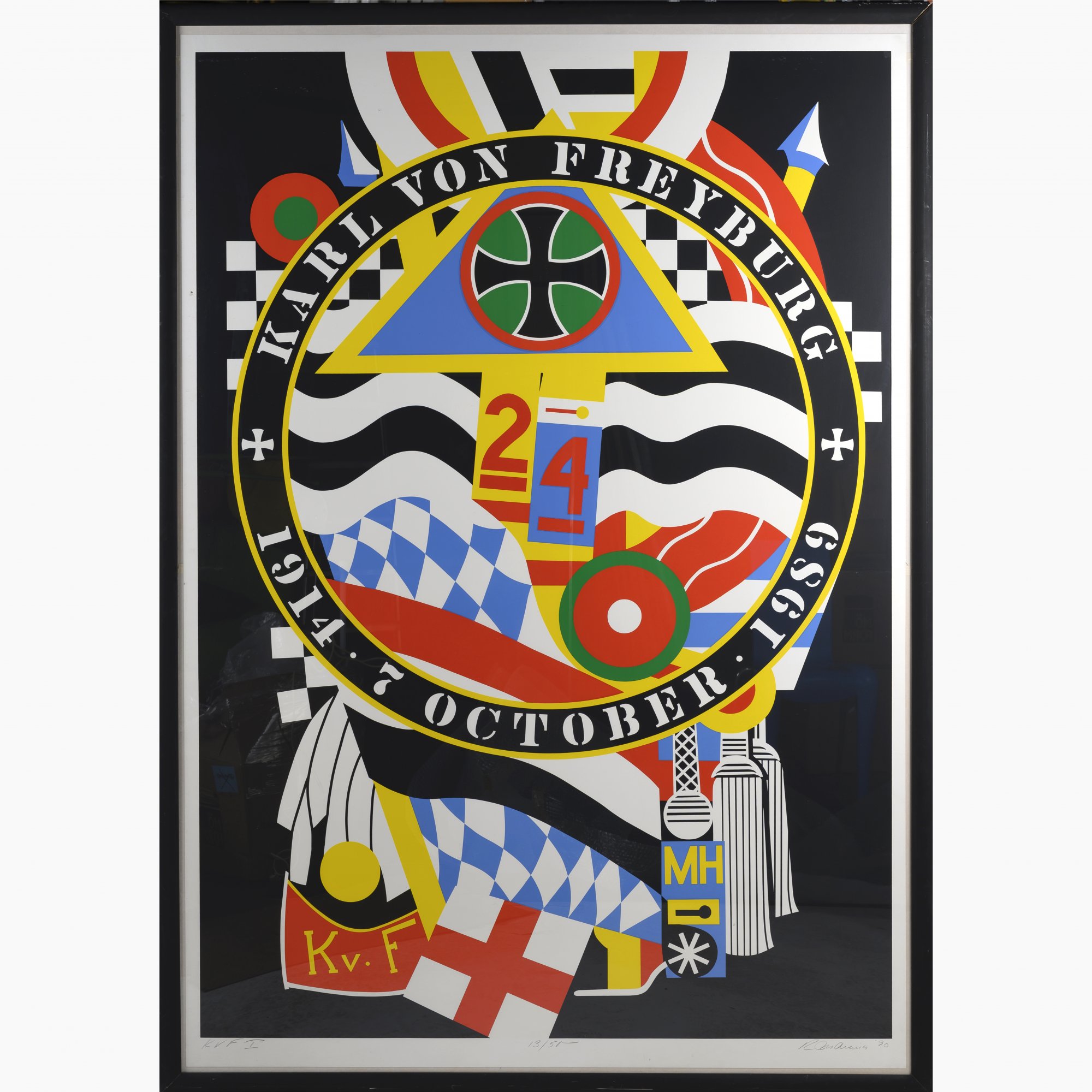 Color silkscreen on paper. 202.0 x 141.0 cm (sheet), 216.0 x 152.0 cm (frame). Inscribed lower left: KVF I, numbered lower center: 13/50, signed lower right: R Indiana and dated: (19)90 (pencil). Number 13 from an edition of 50 copies next to 12 AP copies. This work is the number 1 of 5 in the Berlin Series. Framed under glass.