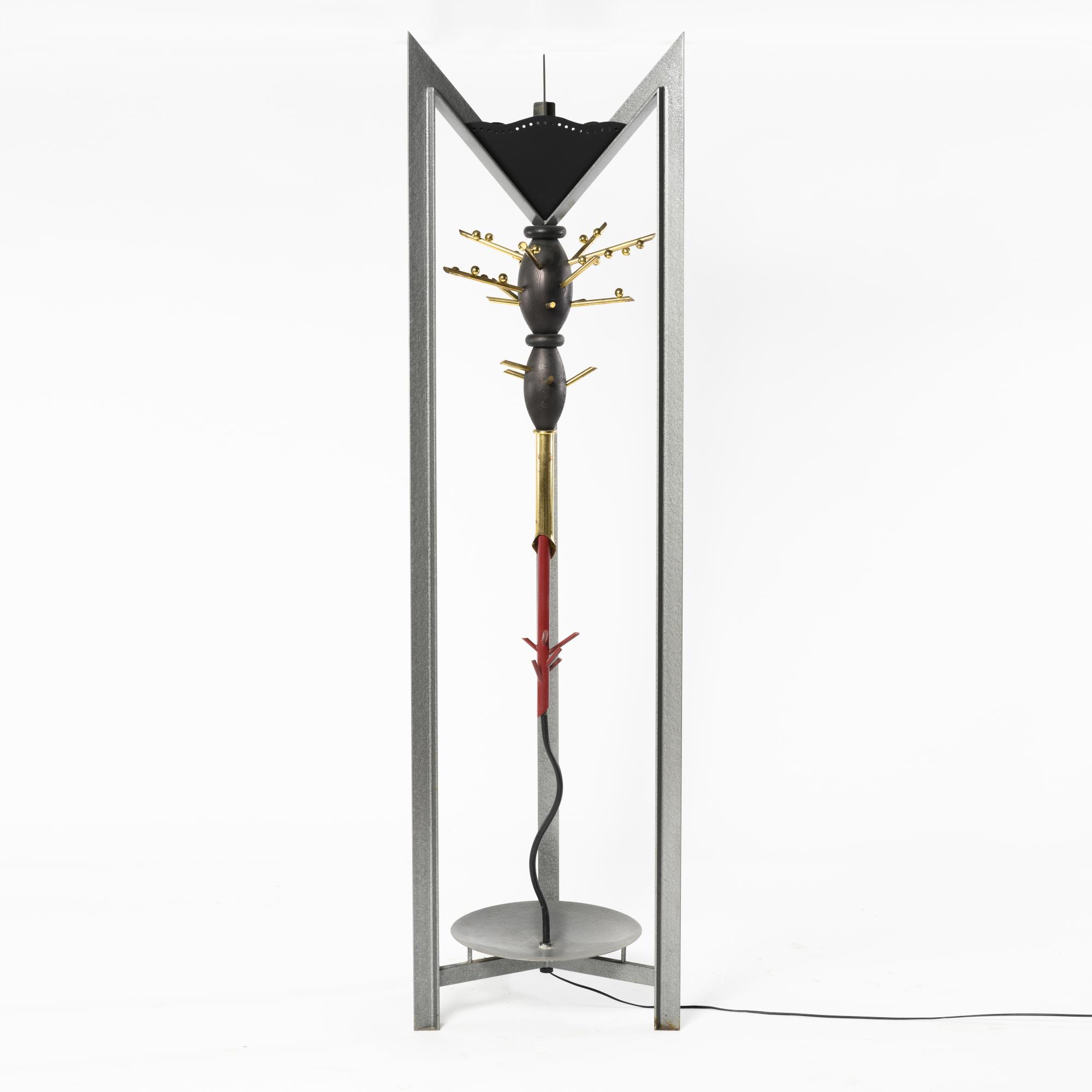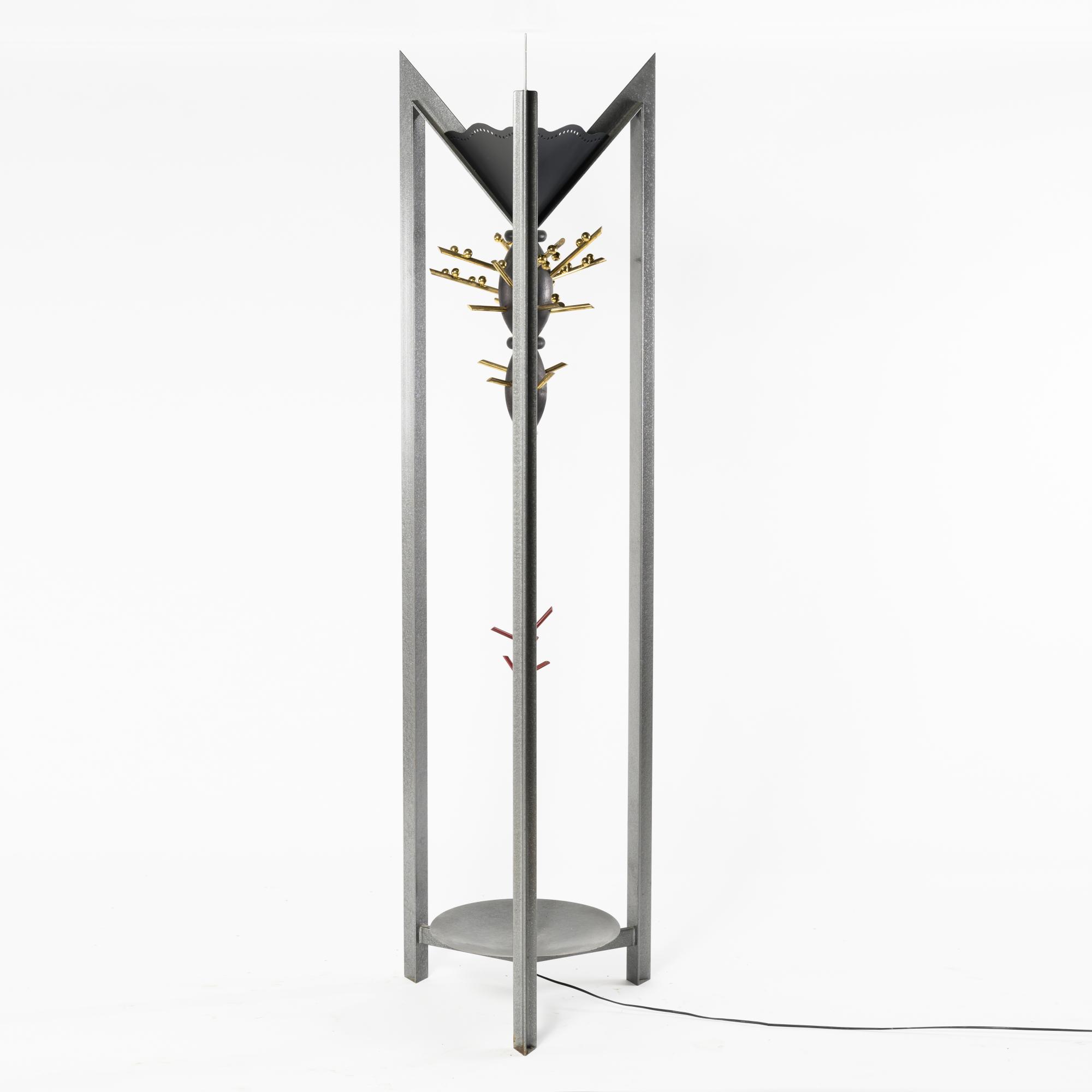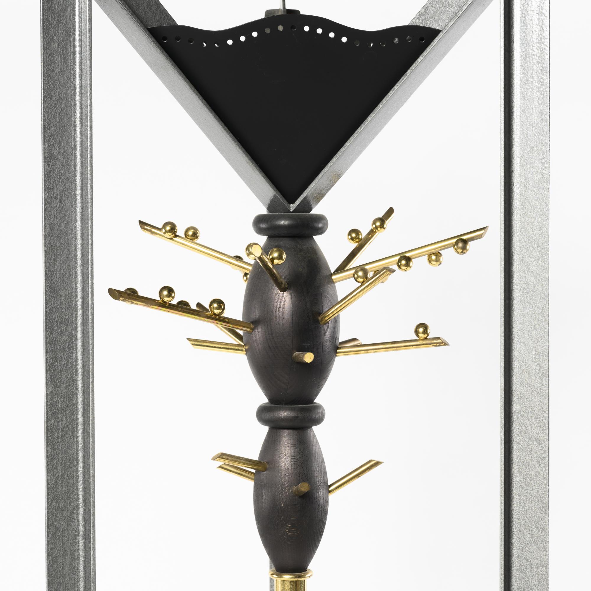 Sectional metal and sheet metal, painted silver and black, metal and brass, painted red, wood, painted black.