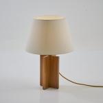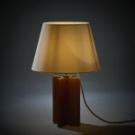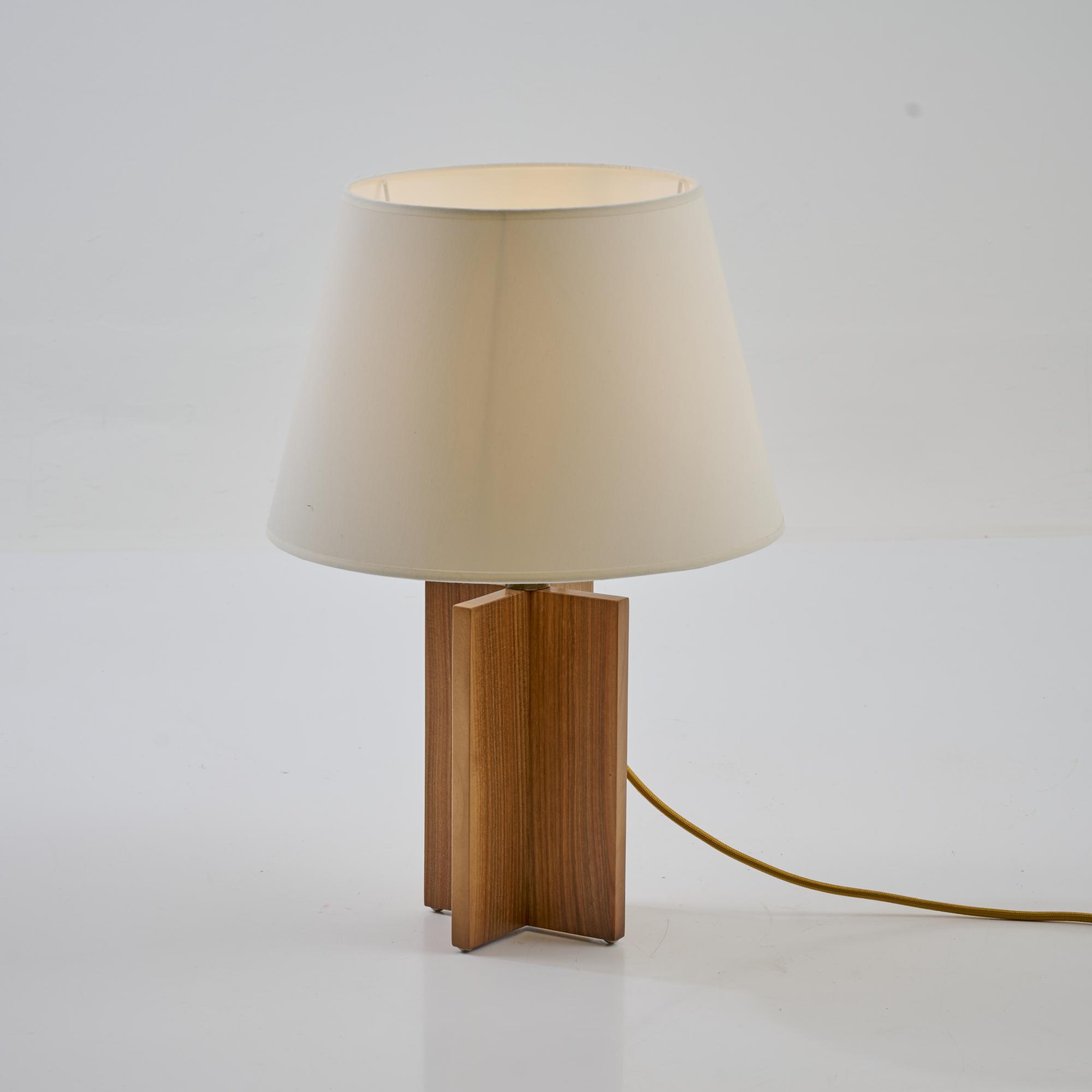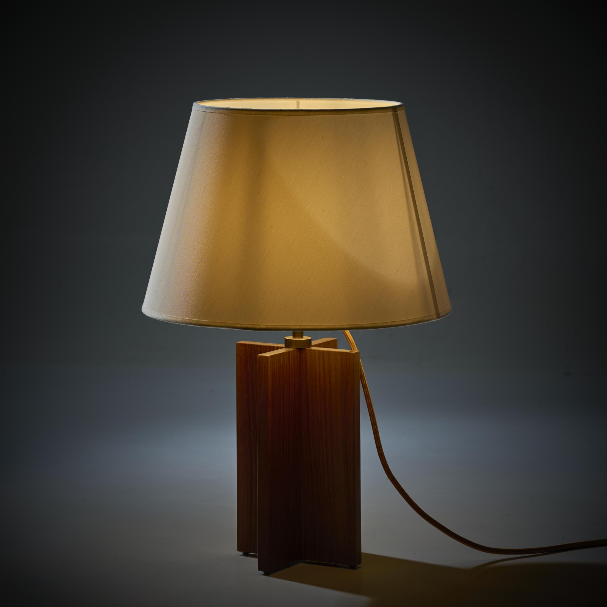 Walnut wood, brass tube, brass sheet, white fabric shade.