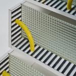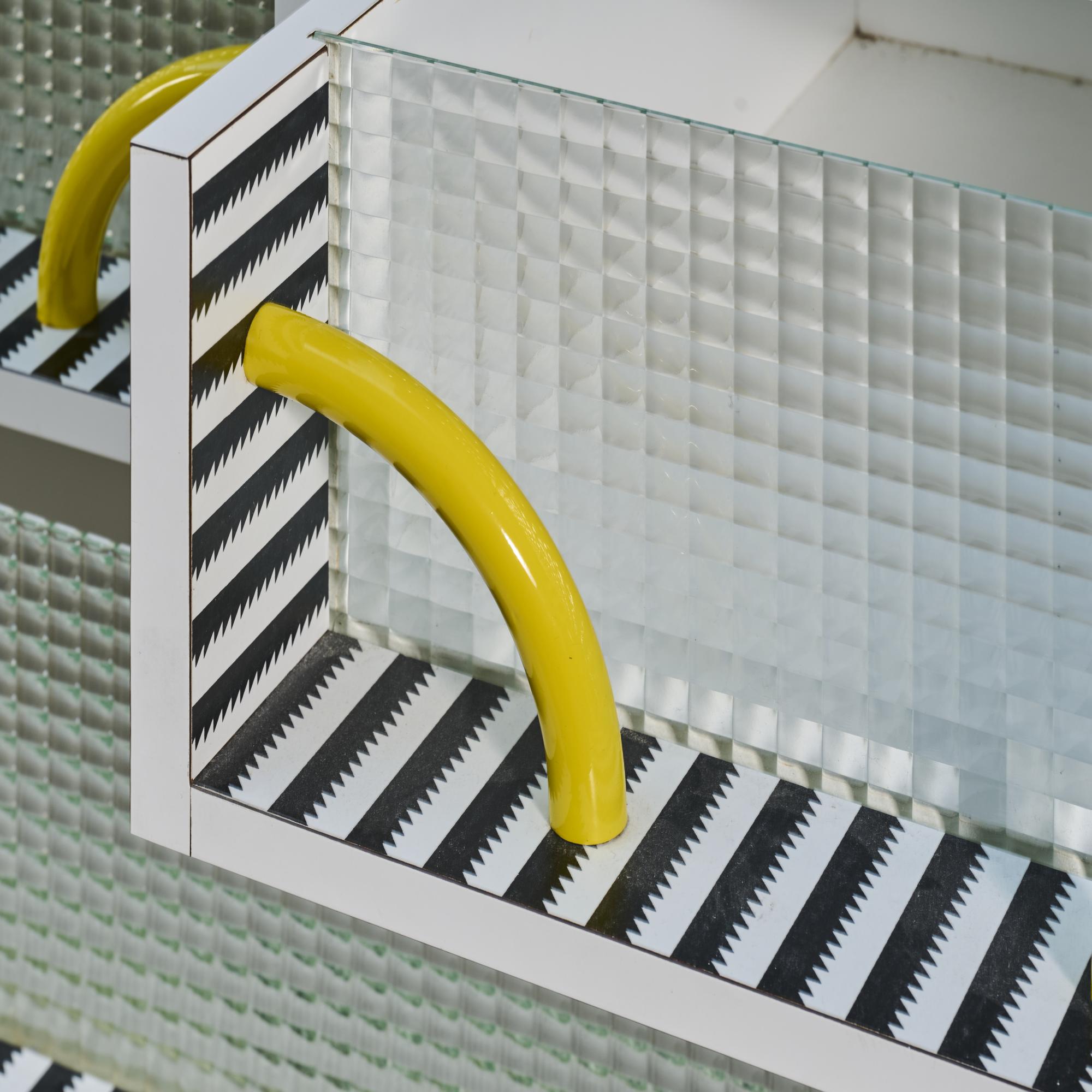 Wooden box construction with laminate, safety glass, and yellow lacquered tubular metal.