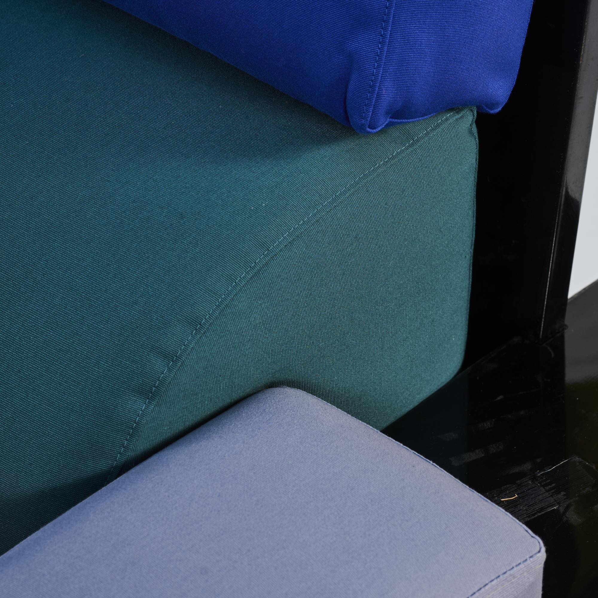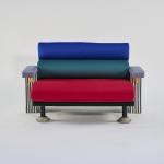 Metal, wood, colored lacquer, laminate, upholstery red, light blue, green, purple.