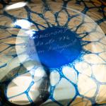 Cased glass, colorless, with blue mesh insets on an amber background.