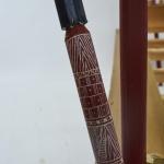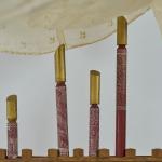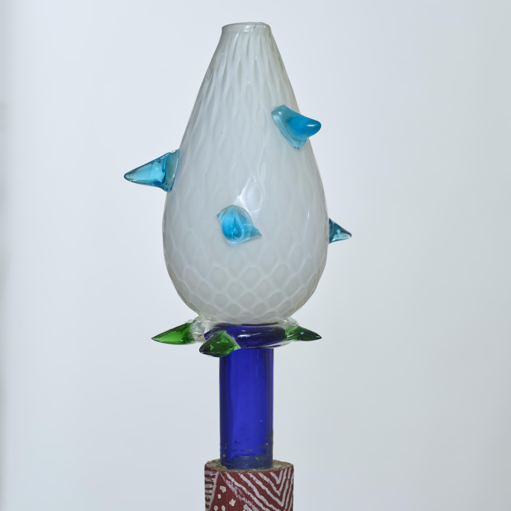 Spruce wood, pine wood, painted red, gold, blue and white, glass, blue, green, opaque white and turquoise, textiles, partially embroidered.