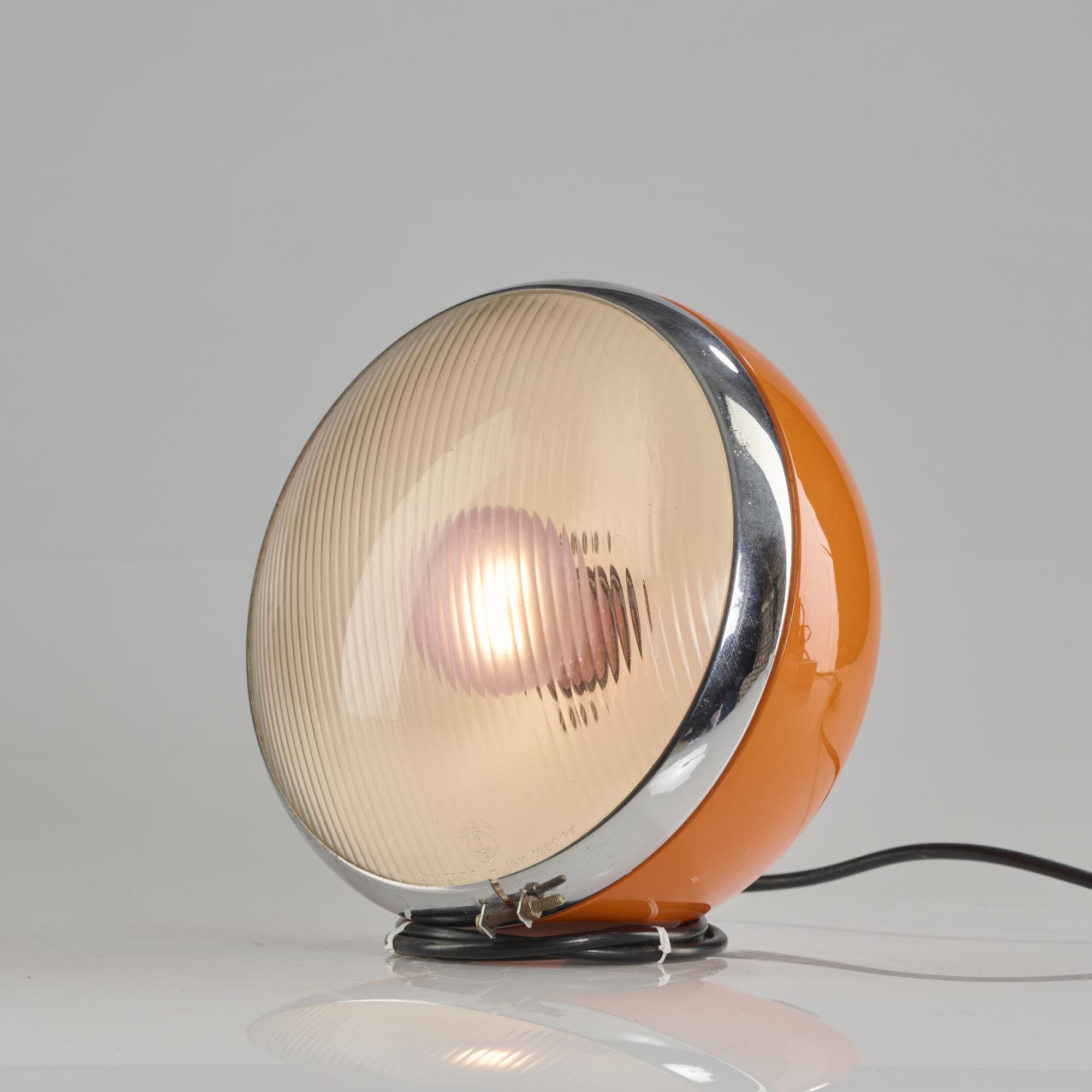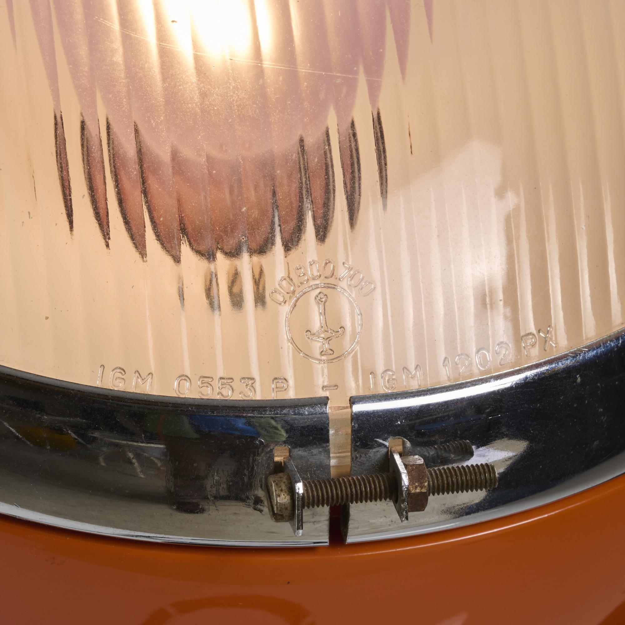 Sheet metal, painted orange and white, partially chrome-plated, clear glass, black plastic.