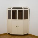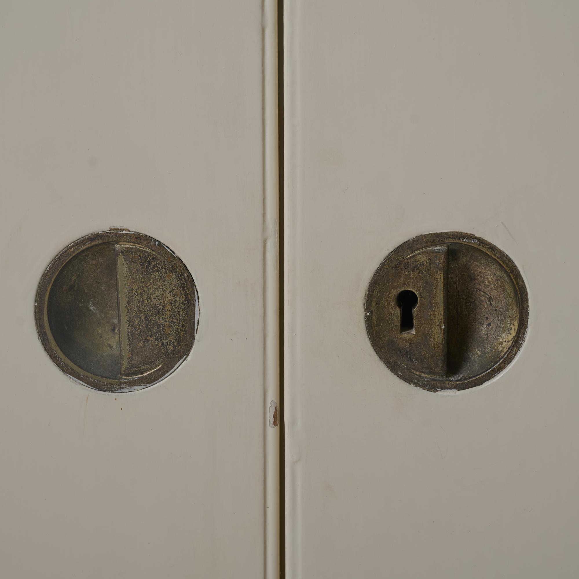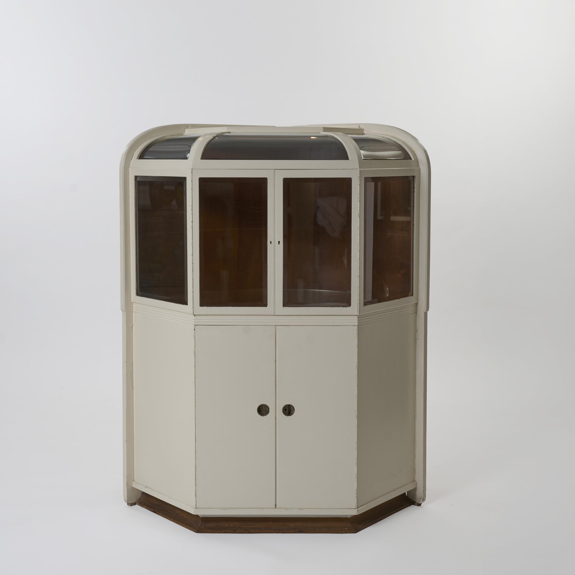 Wood with white varnish, glass, brass.