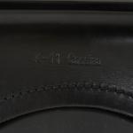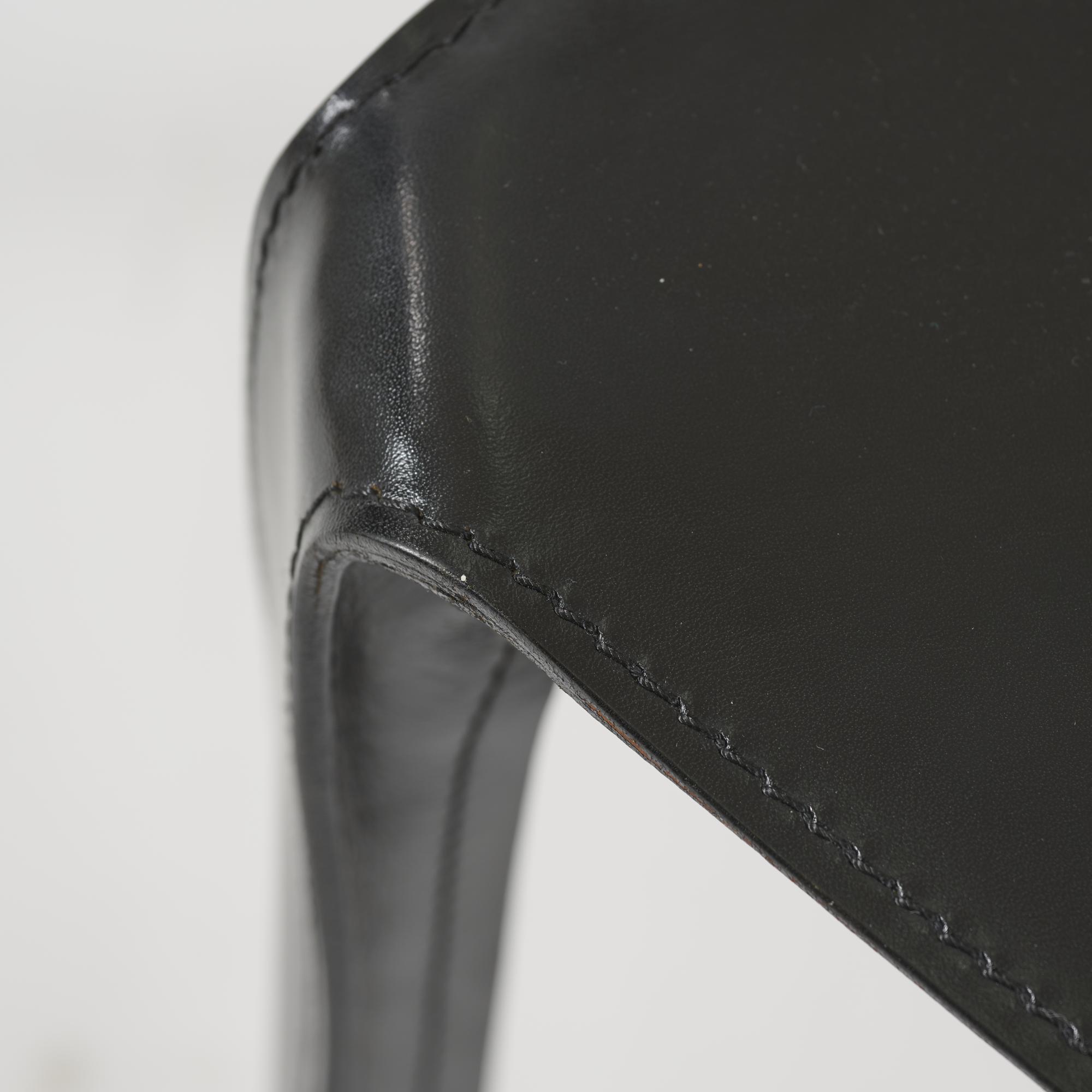 Metal frame, black leather, black plastic.