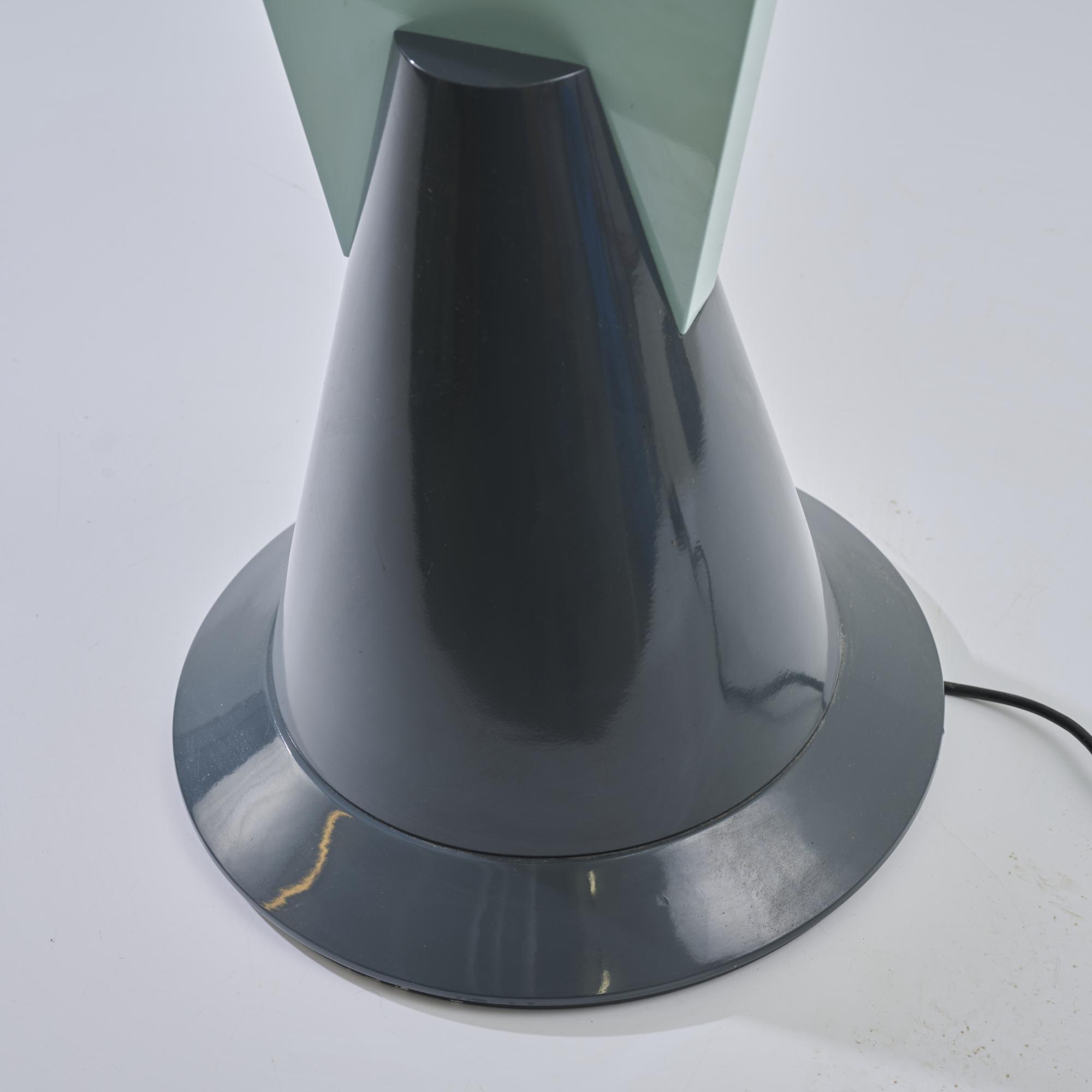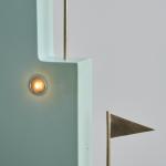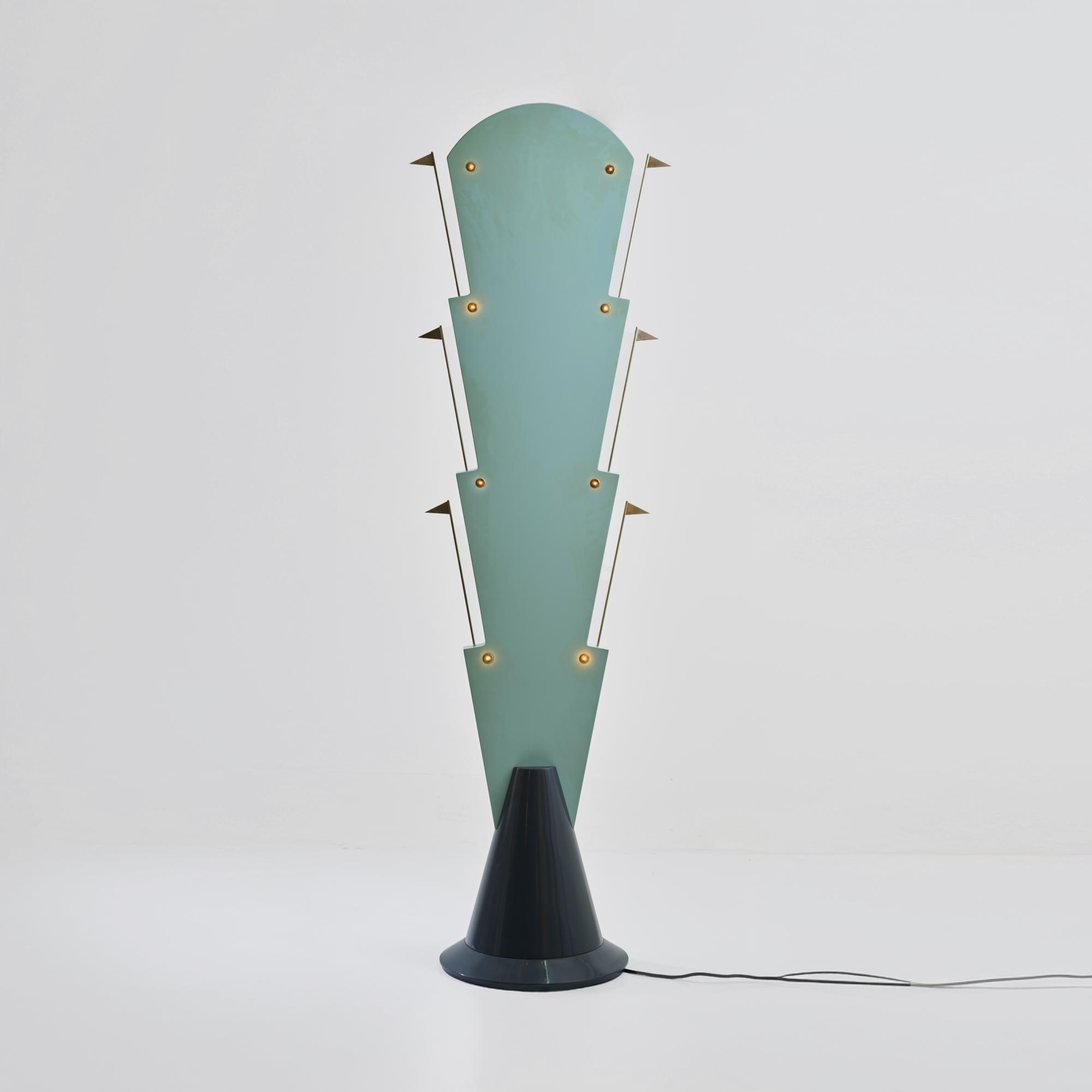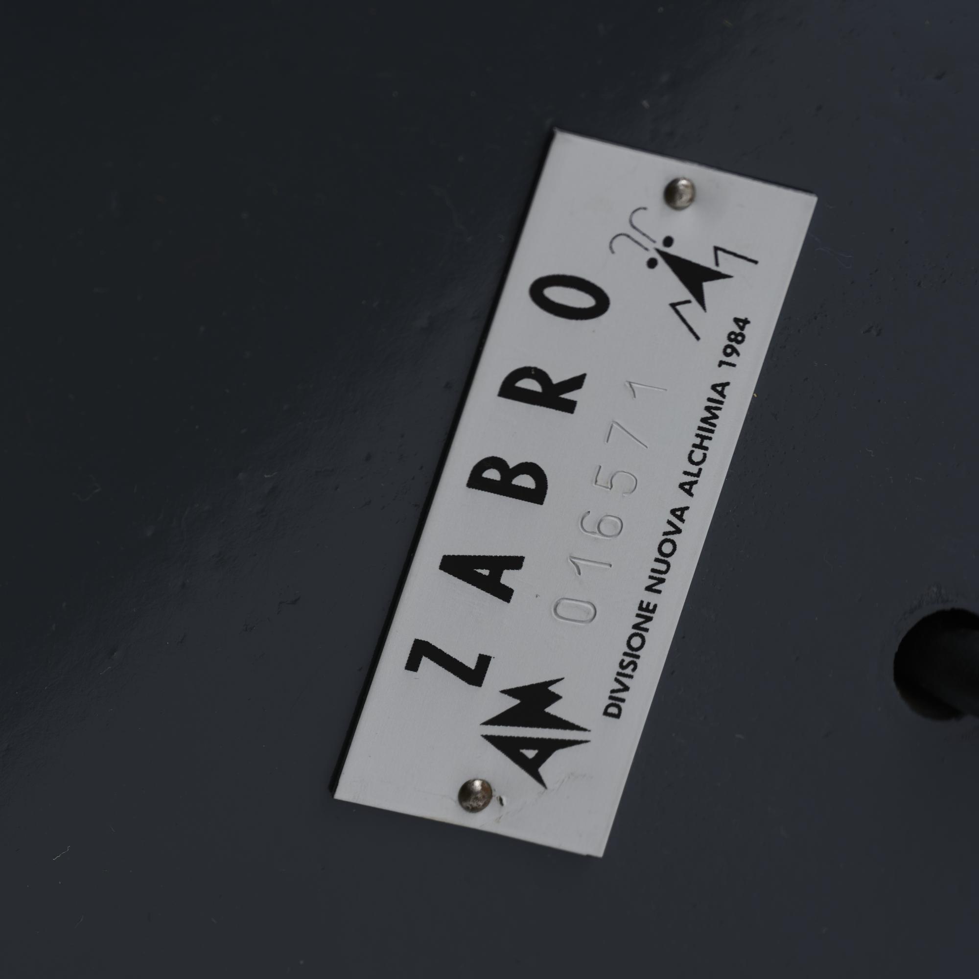 MDF panels, lacquered turquoise and gray, metal rods, silver-plated metal sheet. Marked: Manufacturer's metal plaque: ZABRO, 016571 DIVISIONE NUOVA ALCHIMIA 1984.