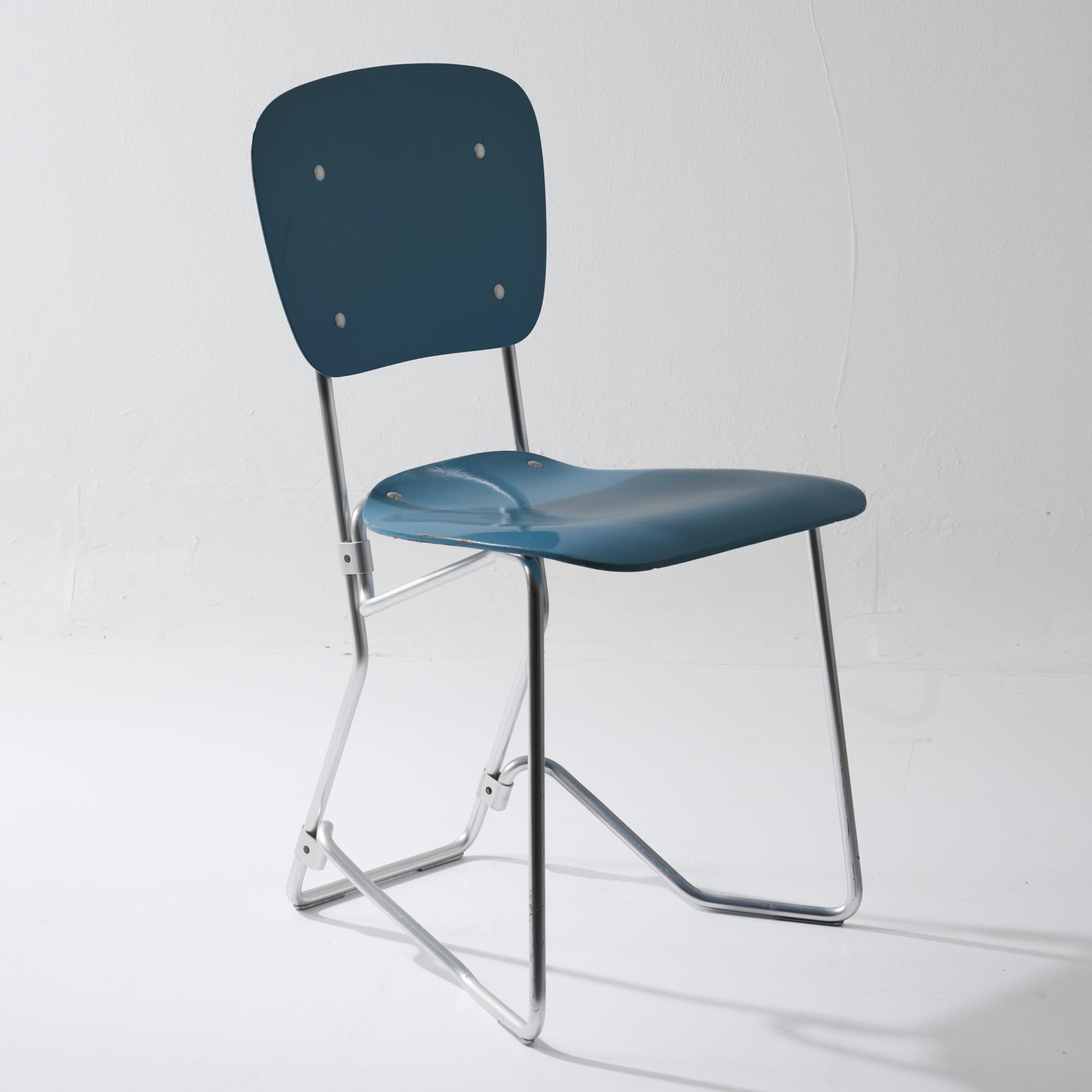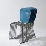 This chair only weighs c. 3 kg. The frame of the chair is made of tubular aluminum and shaped in a manner that does not require soldering. Seat and back are of very thin but sustainable air-ply. By lifting the seat, lots of chairs can be fit into each other and stored in a space-saving manner.