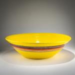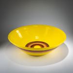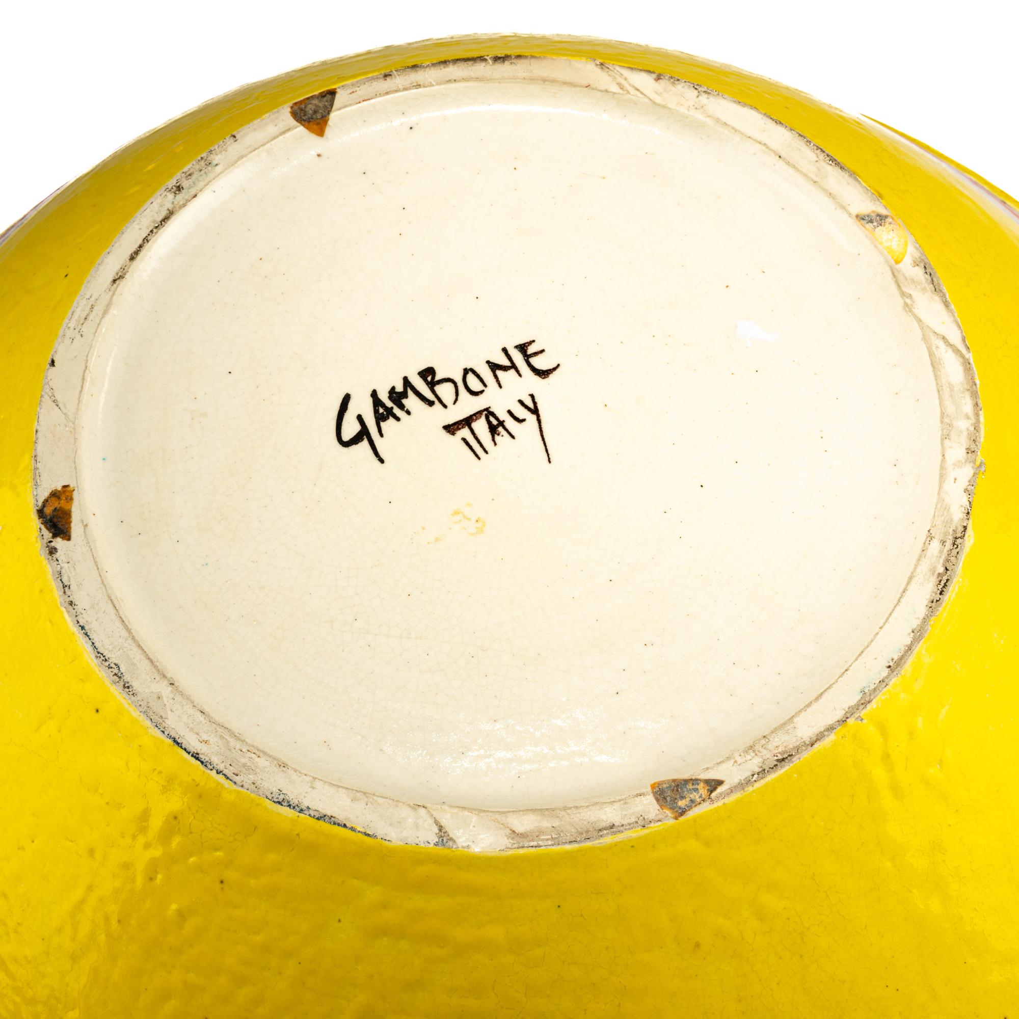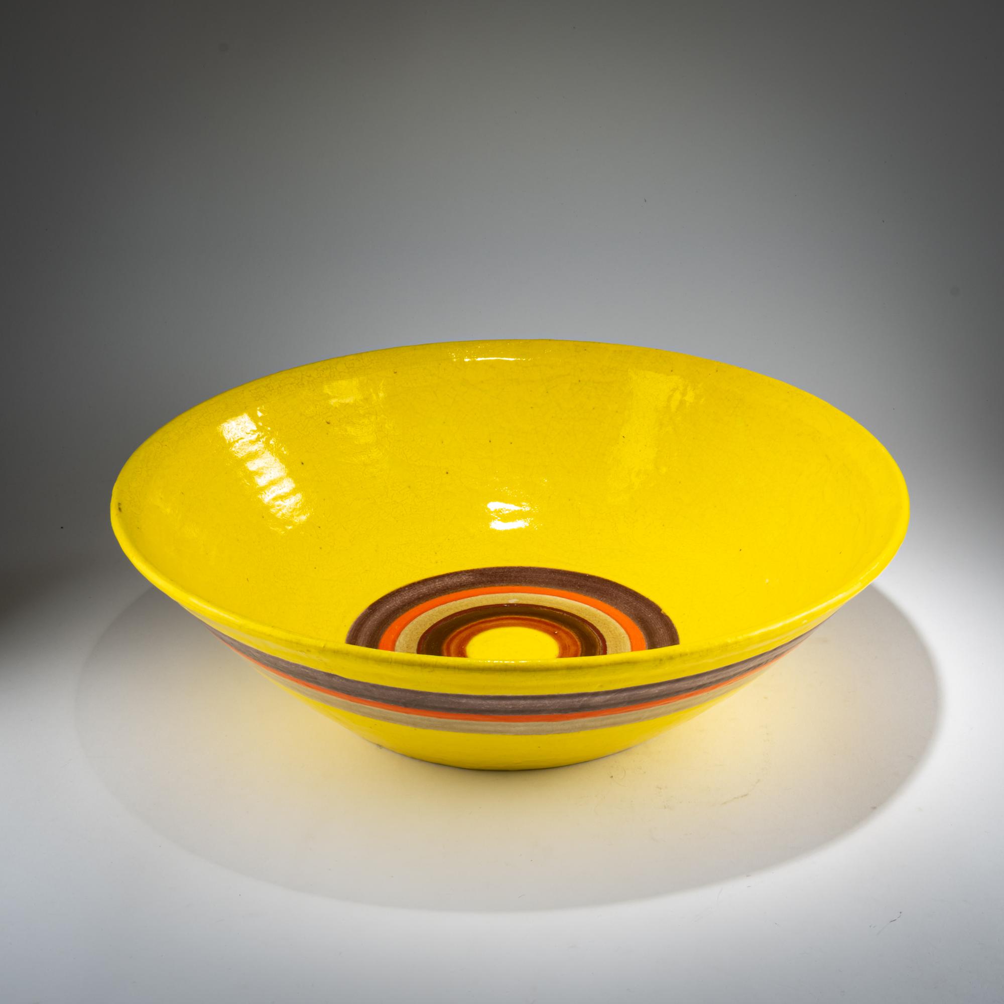Height 14 cm, diameter 50 cm. Stoneware, glazed in yellow, brown, orange and olive green. Marked: GAMBONE ITALY (handwritten).