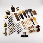 Clothes brush, dustpan and broom, wine bottle holder, schnapps bottle, bottle opener, hand candle holder, pepper and salt bowl, 2 egg cups, 4 spread knives in holder, 4 fondue forks, 2 carving forks, 2 sardine forks in leather holder, 6 forks with horn handles, 5 horn carving forks, caviar spoon, soup spoon, 2 salad serving sets (each with spoon and fork), 4 napkin rings, 18 nut bowls, bottle stopper, shoehorn. Various sizes.