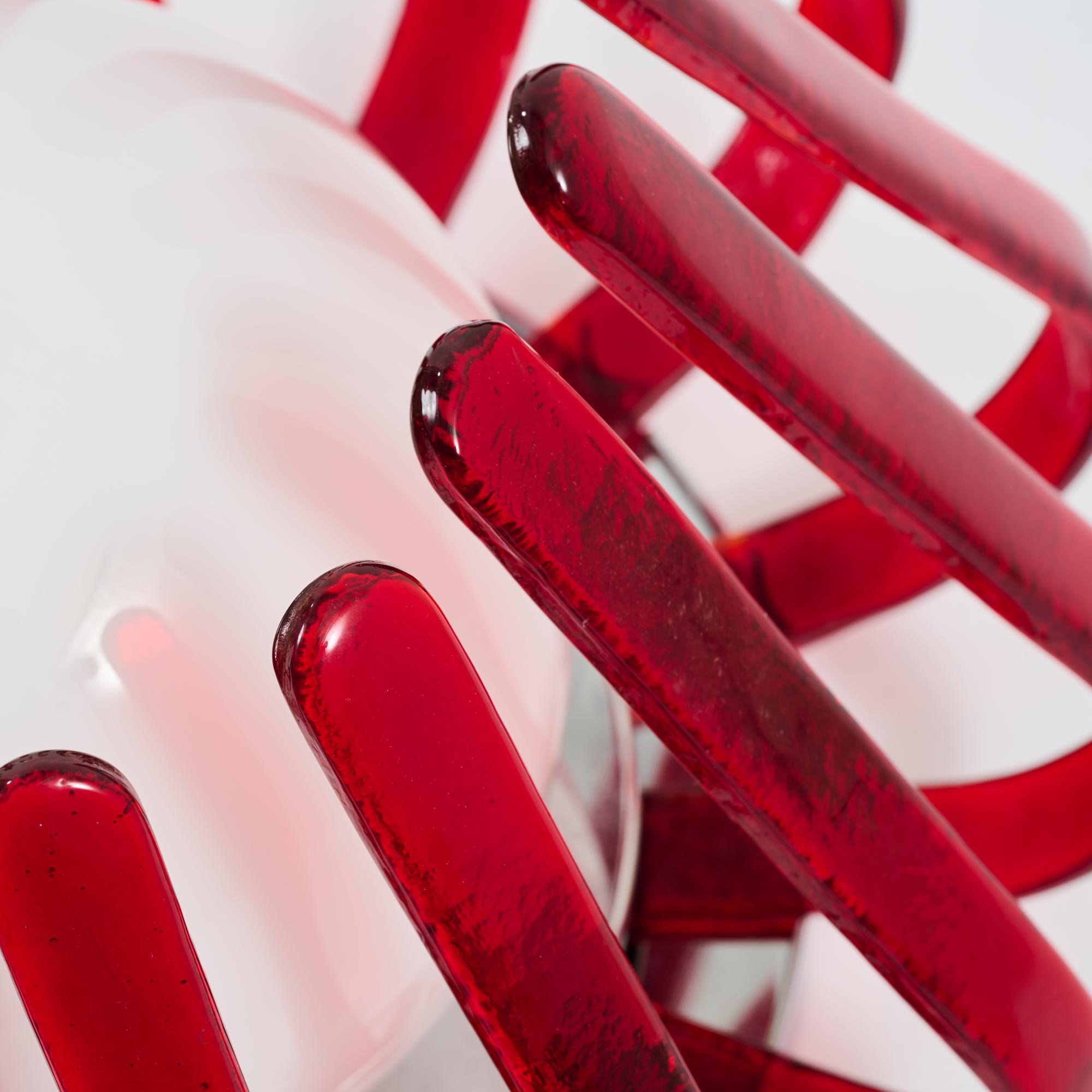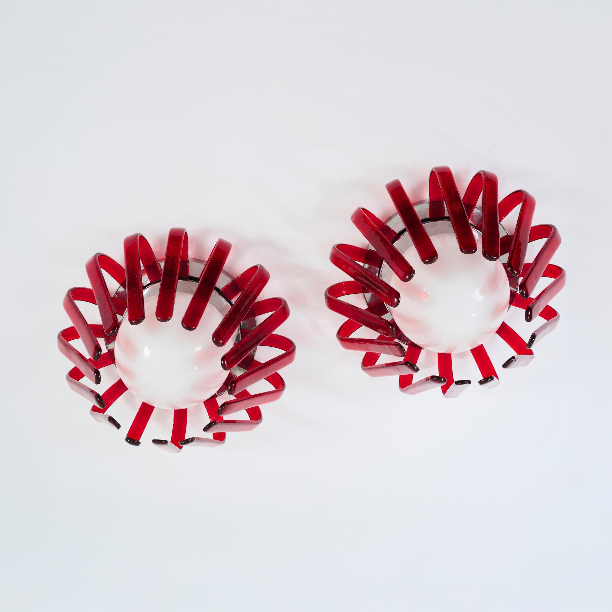 Red and opaque white glass, chrome-plated sheet metal.